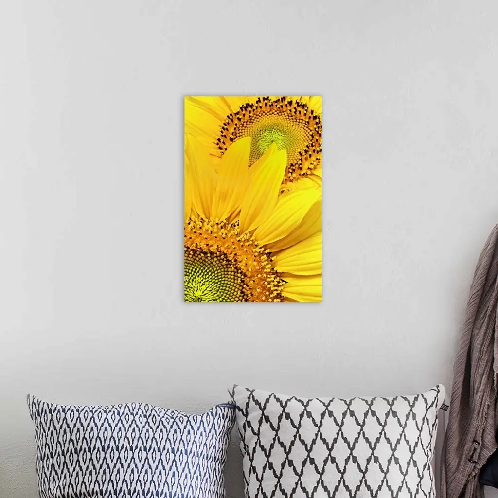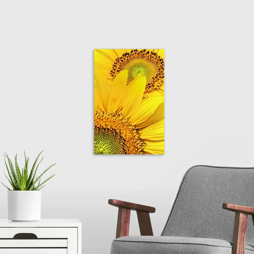 Two sunflower heads in full bloom with wide, golden petals, with views of the small disk flowers in fractal formation in the center.