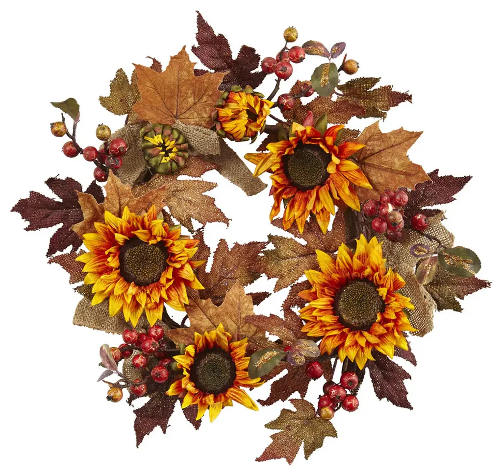 Want to bring a little sun to your holiday decorations? Then look no further than this beautiful sunflower swag. With brilliant bursts of yellow with just the right touch of red and brown, set amongst crisp-looking leaves, this magnificent piece will proclaim ''holidays with sunshine!Comes with a metal frame for added elegance.