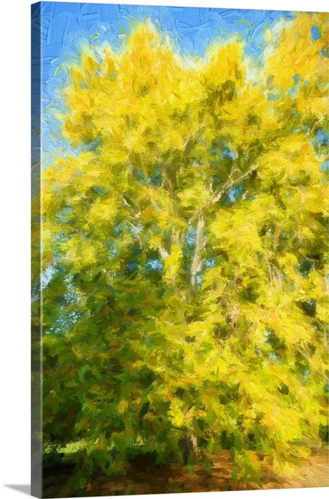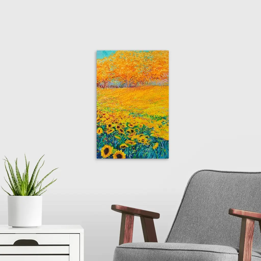 Brightly colored triptych of a sunflower field. Panel 3 of 3.