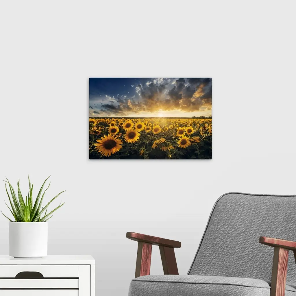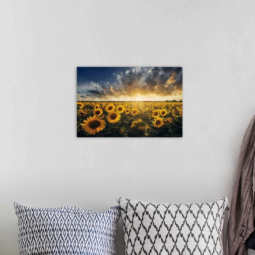 Sunflowers during a colorful summer sunset in Tuscany, Italy