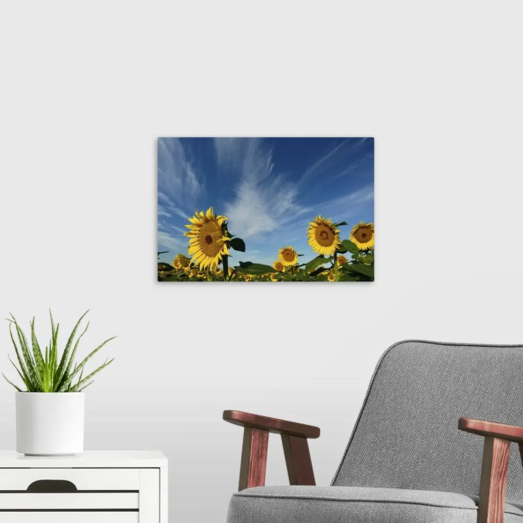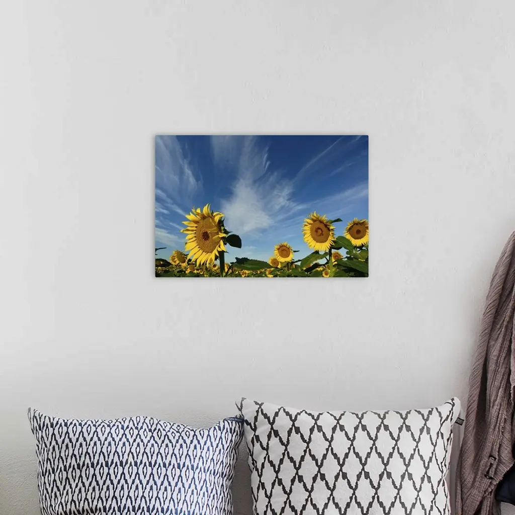Sunflowers fields against blue sky. wall art for home and office decor. Discover canvas art prints, photos, mural, big canvas art and framed wall art in GreatBigCanvas.com's varied collections.