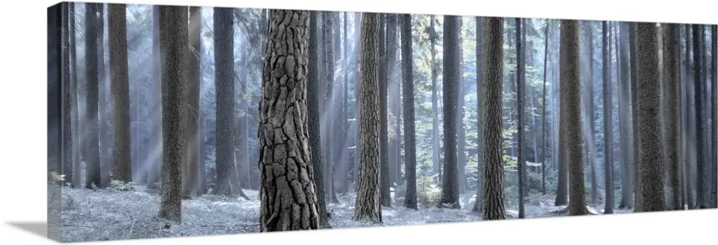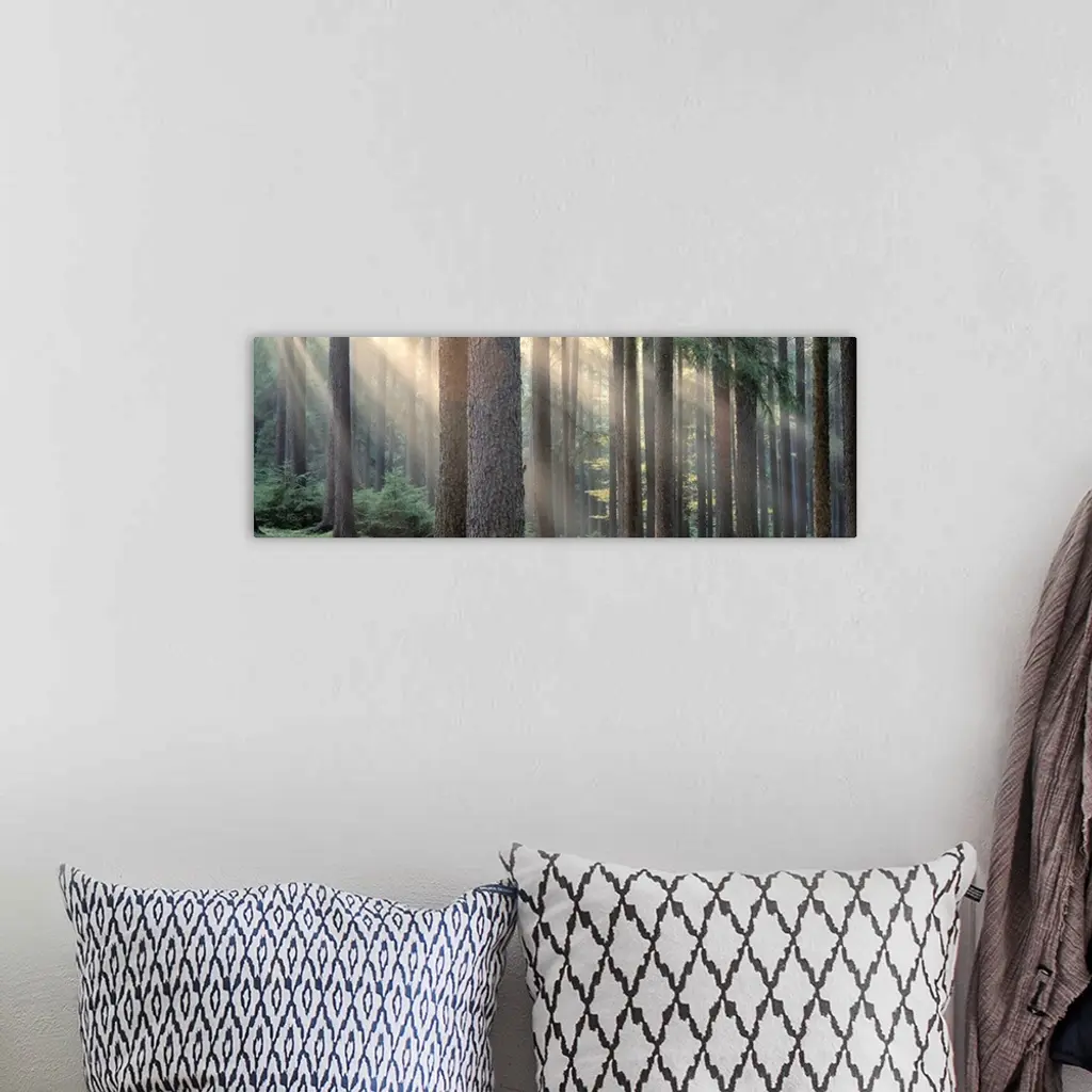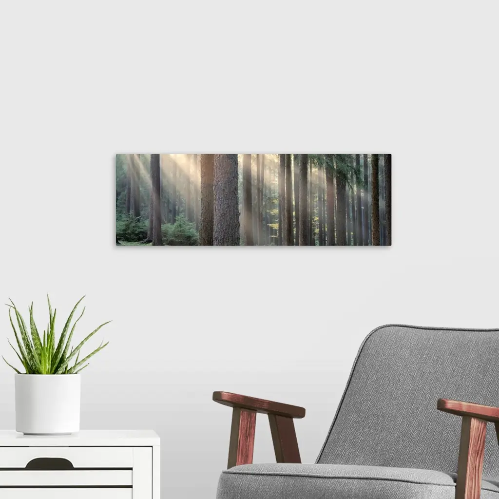 Panoramic photograph of forest with sun peering through the scattered tall tree barks.