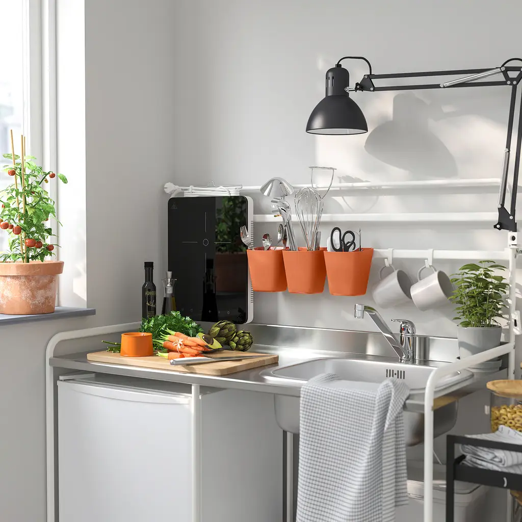 SUNNERSTA Container - bright orange 4 3/4x4 3/8 ". Helps free up space on your countertop while keeping cooking utensils close at hand. Can be used in high humidity areas. Easy to attach to SUNNERSTA adjustable rack, rail or mini kitchen. Fits SUNNERSTA rail and mini-kitchen.