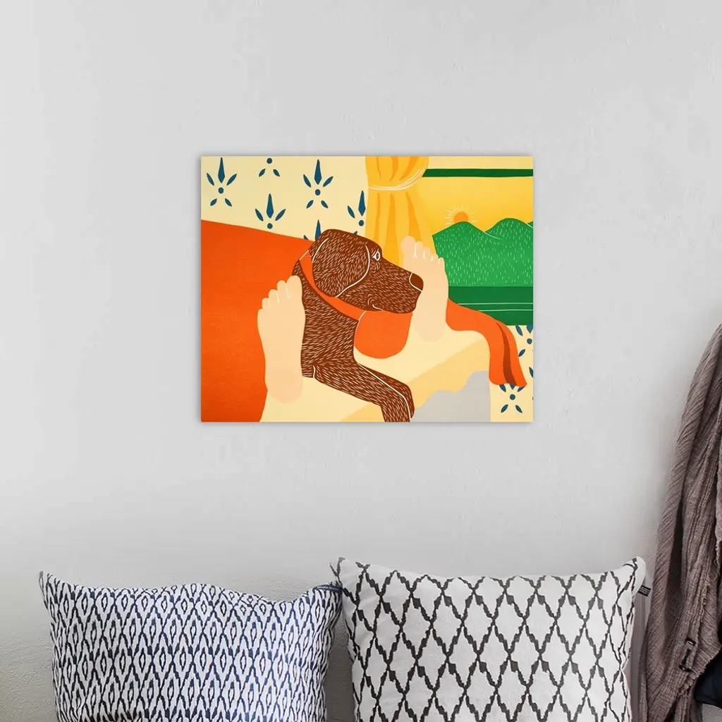 Illustration of a chocolate lab laying in the middle of its owners feet at the foot of the bed in the morning.