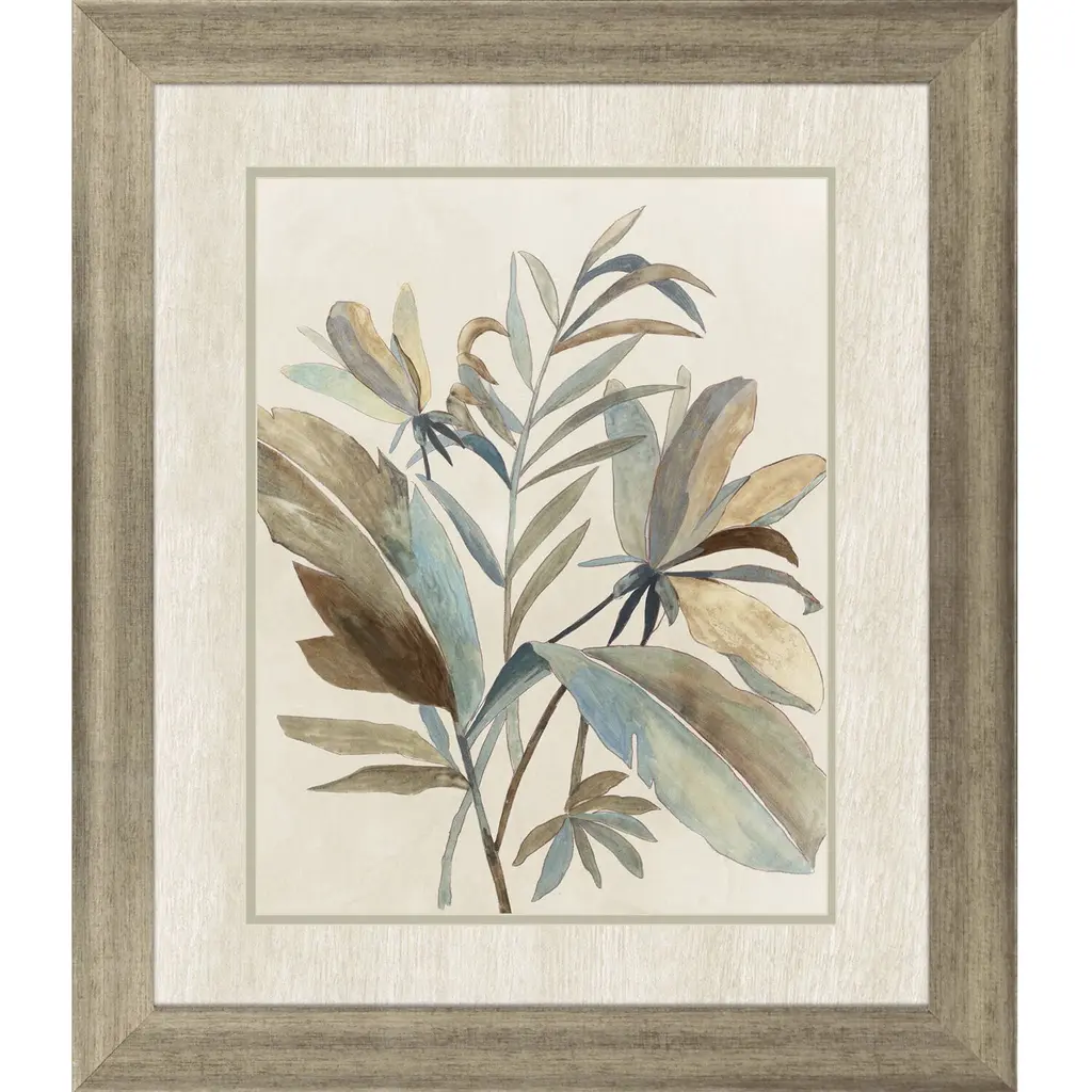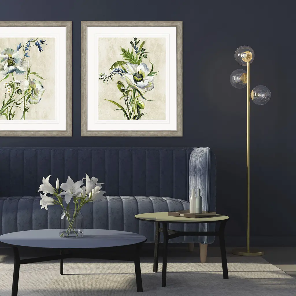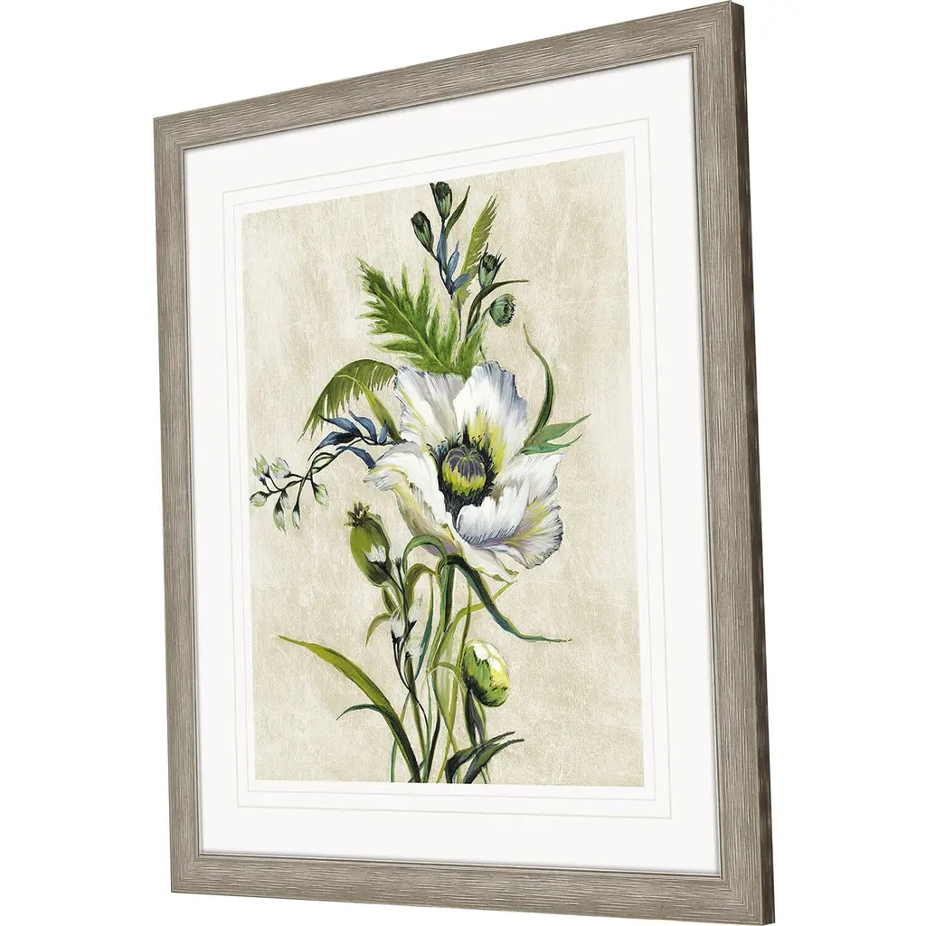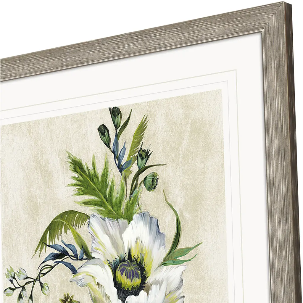 Cheerful botanicals are double-matted in white. Framed in a distressed silver finish moulding.