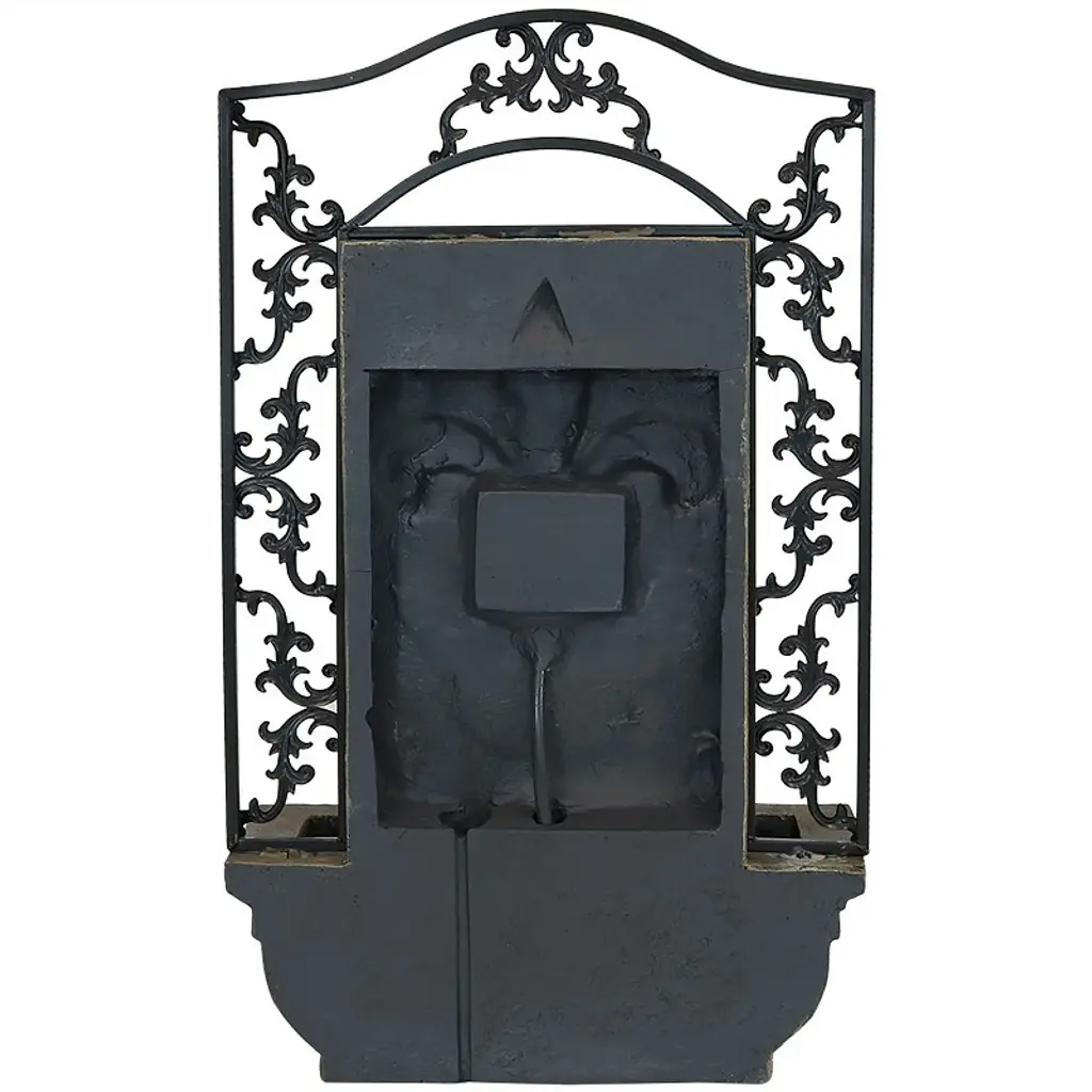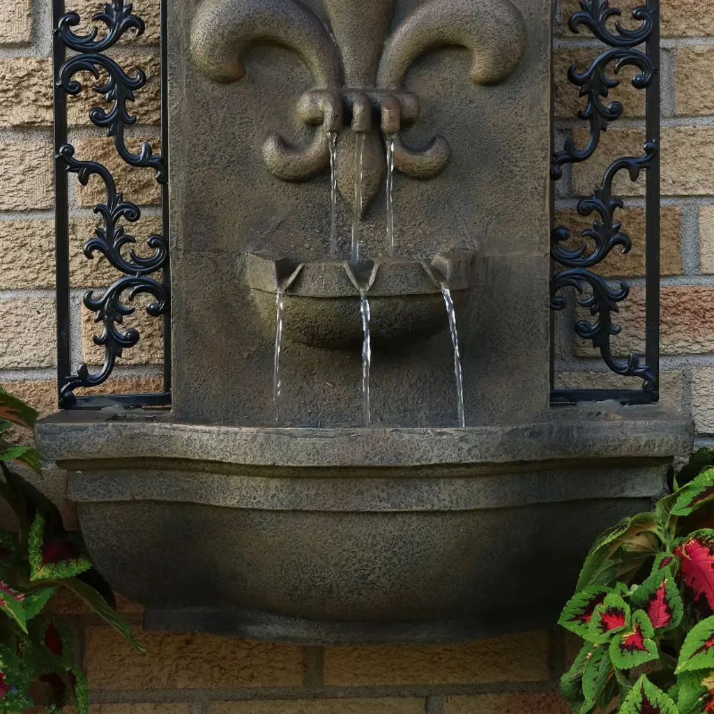 Reminiscent of classic, French designs with an elegant fleur-de-lis, this unique electric outdoor wall fountain emanates class and sophistication. After the water flows into the first tier, it creates a gentle and relaxing water sound as the water splits into 3 streams before collecting in the beautifully detailed bottom basin. The edges of this fountain feature a detailed floral design for added elegance. Enjoy the gentle sounds of water on the deck, patio, or by the gazebo. Plus, no plumbing is required which means no more unsightly extension cords running across the yard and hogging outdoor outlets. Mount and conceal the solar panel in a sunny place to power the fountain and enjoy!• ATTRACTIVE ANTIQUE ADDITION TO ANY SPACE: Make a statement with this stunning outdoor wall fountain for the garden, porch, deck, lawn, and exterior space. It measures 20" W x 9" D x 33" H and weighs a sturdy 18 lbs to ensure it won't tip over while remaining light enough to easily move. It has a water capacity of 1.5 gallons.• DURABLE MATERIAL THAT'S BUILT TO LAST: The French Lily wall-mounted water fountain is made from polystone material to ensure it will be long-lasting while providing the look of beautiful stone.• CREATES SOOTHING WATER SOUNDS: Sit back, relax, and enjoy the relaxing sounds this wall-hanging water fountain creates as water gently trickles down into the bottom bowl before circulating through the fountain.• EASY TO USE: The wall fountain waterfall requires no plumbing and mounts against any surface using a sturdy hook, screw, or nail for easy and quick assembly.• WORRY-FREE PURCHASING: Sunnydaze Decor backs its products with a 1-year manufacturer's warranty.