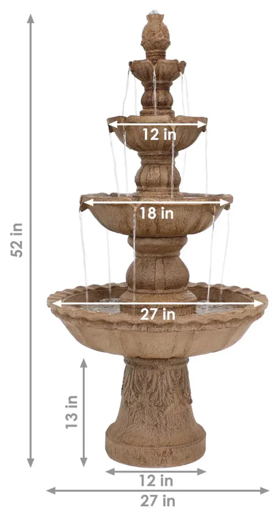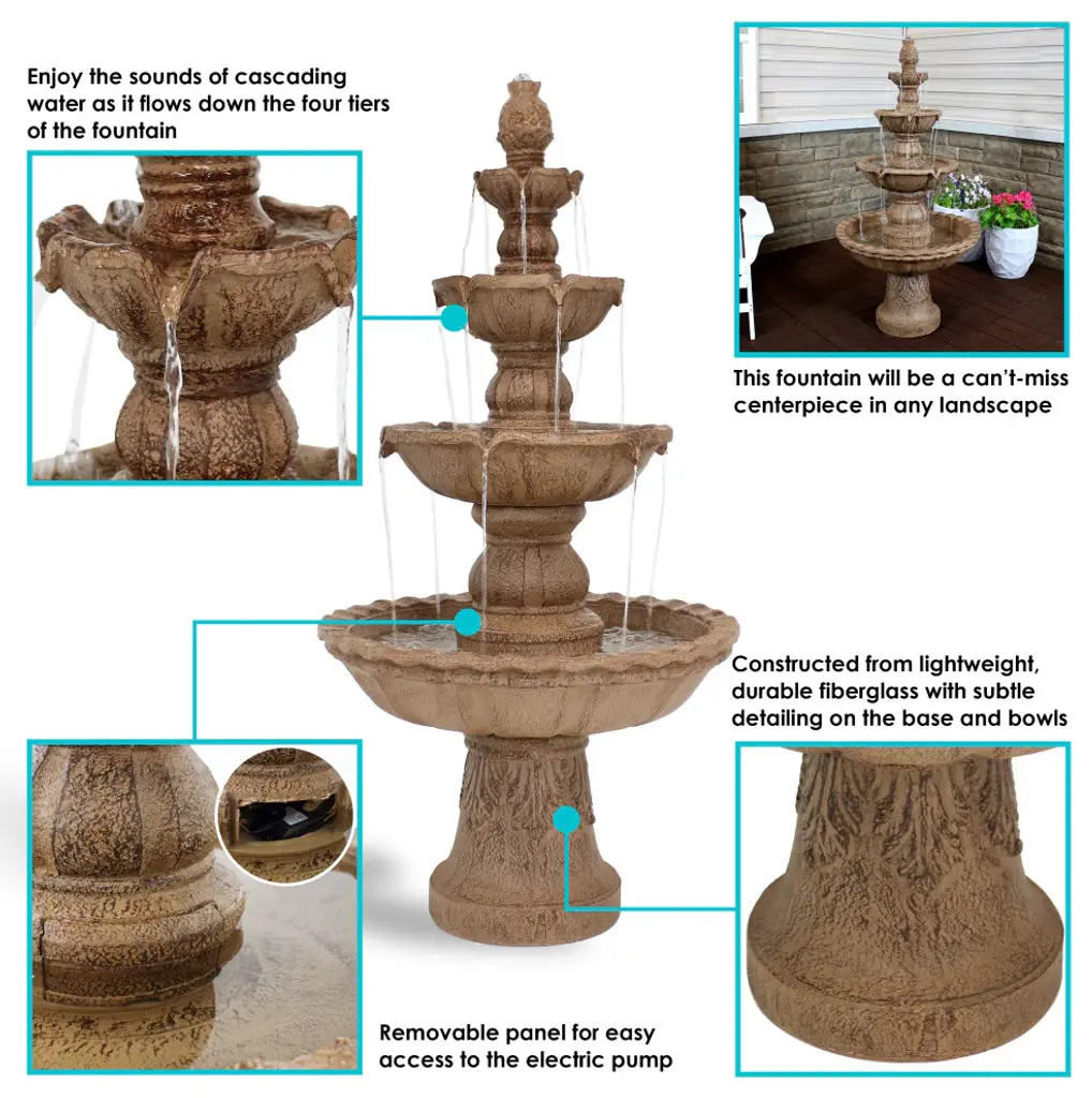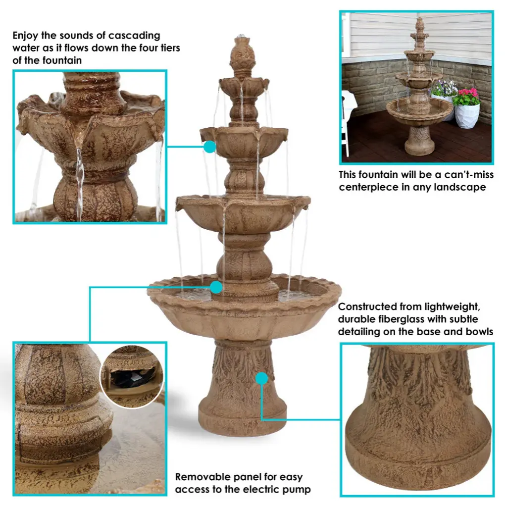 At over 4'' tall, this beautiful outdoor water fountain will make a dramatic statement in any backyard or landscaped area. Made from durable fiberglass material this fountain is sure to last through many seasons of use. The water cascading down the 4 tiers will bring a soothing and relaxing atmosphere.