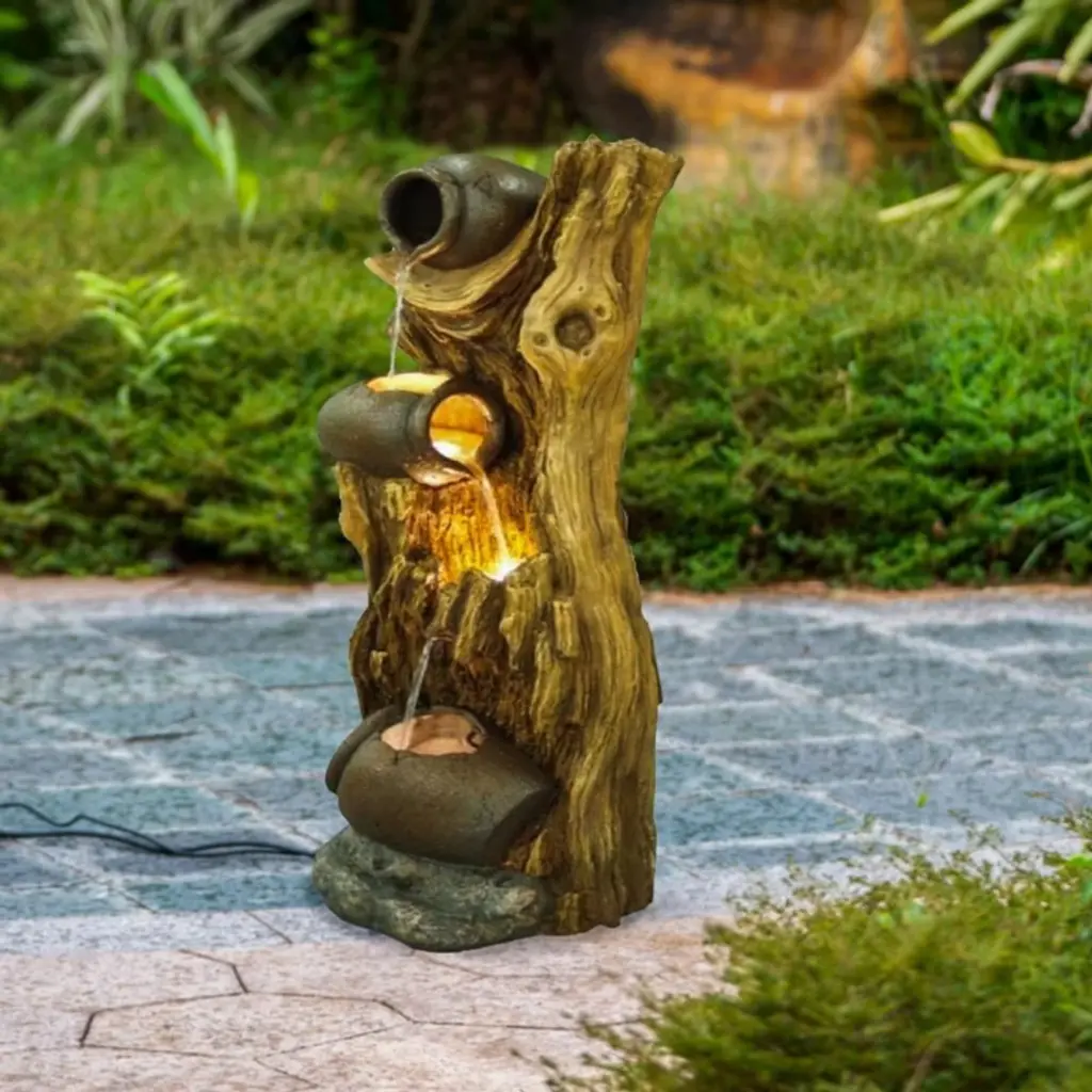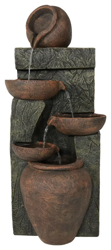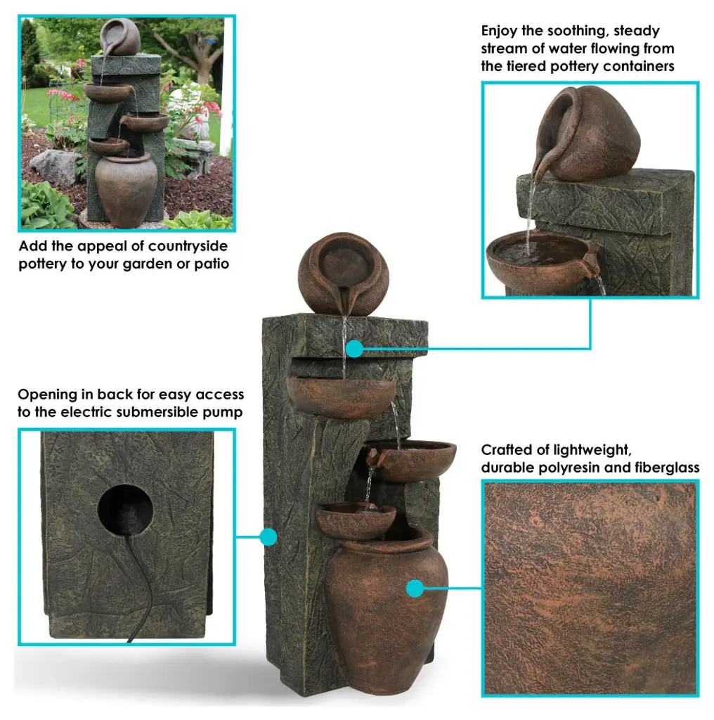 This pottery-inspired outdoor fountain is sure to be an ideal accent to any garden or patio. A steady stream of water flows from the pottery containers, creating soothing and relaxing sounds. This fountain includes the electric submersible JR-450 pump for setup. The pump has a 0.5-inch hose diameter and a 69-inch power cord length. The lightweight polyresin and fiberglass construction of this fountain makes it easy to clean and move around as needed.