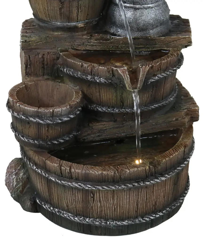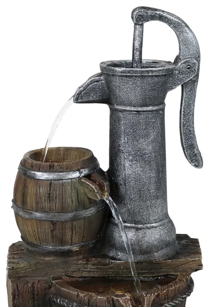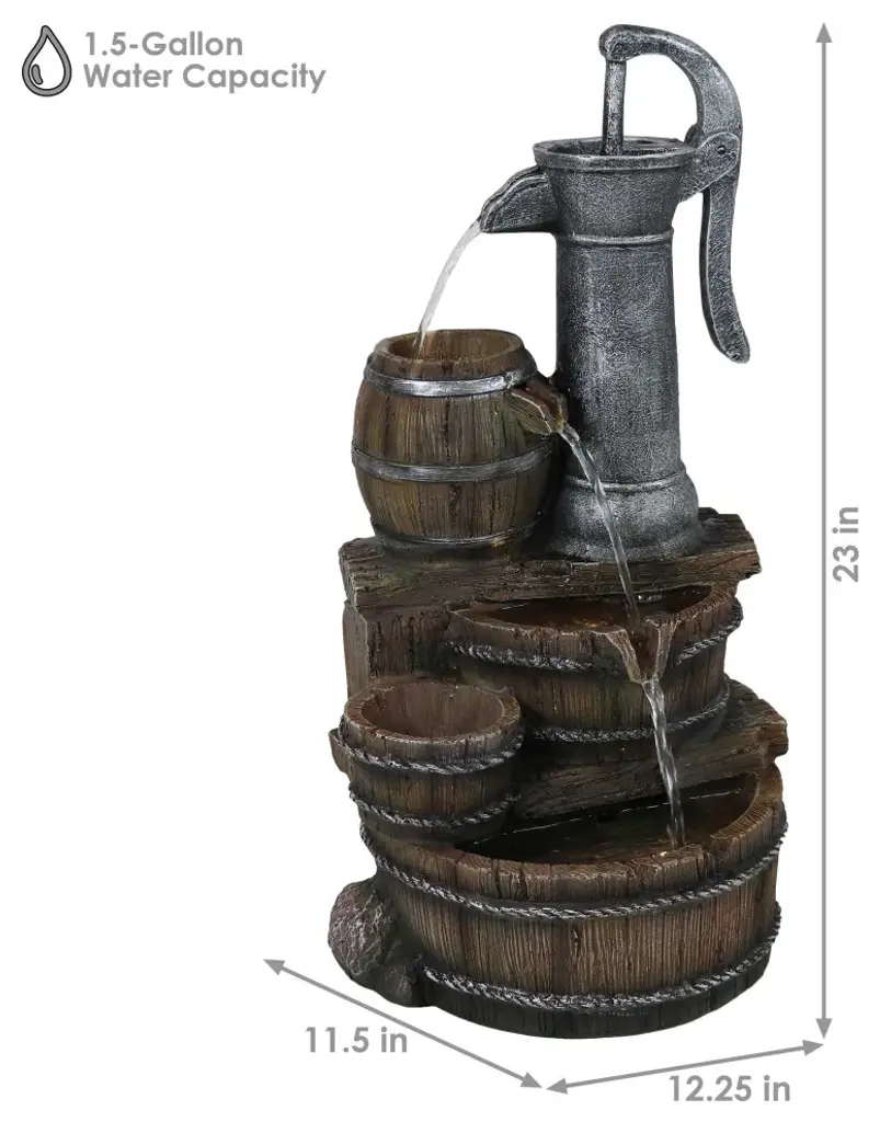 Add a touch of country charm to your patio, front porch or garden with the Sunnydaze Cozy Farmhouse Pump and Barrels Outdoor Fountain with LED Lights. This beautifully detailed deck fountain features three tiers and a realistic farmhouse pump figure. This decorative outdoor fountain is constructed of lightweight yet durable polyresin making it easy to maintain and move. The water falls from the spout of the pump and streams from tier to tier, producing a soothing sound before it collects in the bottom basin and recirculates through the backyard fountain thanks to the adjustable flow electric submersible pump. Setting up this electric fountain is simple with no plumbing installation required. Plus, it features two warm white LED lights to illuminate your electric water fountain so you can enjoy its beauty even after the sun sets.