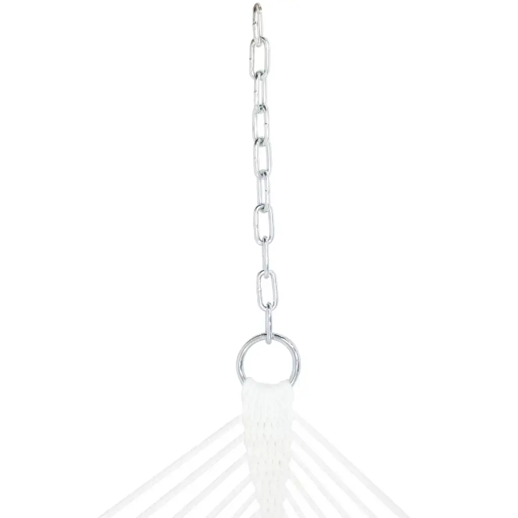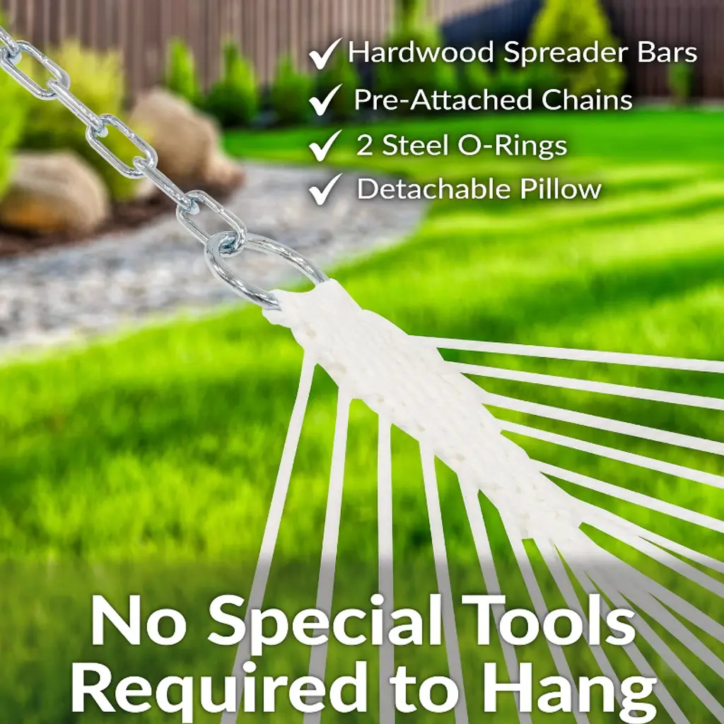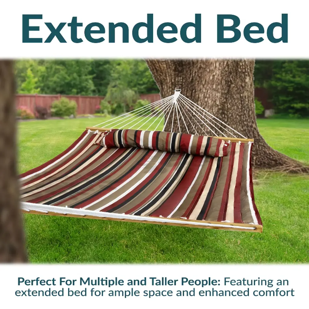 Experience ultimate relaxation with this extra-large 2-person quilted hammock. The spacious 77.5” W x 55” D outdoor hammock bed provides plenty of room for two adults, offering a cozy retreat for outdoor lounging. Crafted from 100% polyester fabric, this hammock for patio is both soft and weather resistant, ensuring long-lasting use in any outdoor space. Sturdy polyester ropes and hardwood spreader bars enhance stability while maintaining a stylish appearance. The spreader bars keep the hammock open, making it easy to get in and out for seamless use. A matching, cushioned pillow is included, providing extra support for the head and neck to enhance relaxation. Whether used for an afternoon nap, reading a book, or simply unwinding, this polyester hammock delivers a comfortable and supportive experience. Hang the outdoor hammock on a 15' hammock stand (not included) or between two trees to enjoy outdoor lounging anywhere.• EXTRA LARGE AND COZY: This hammock is longer than other quilted hammocks with a spacious 77.5" W x 55" D bed. This comfortable, double hammock for two supports up to 450 lbs, making it a great option for relaxing solo or snuggling up with a loved one. The hammock is 137" W from loop to loop.• DURABLE AND WEATHER RESISTANT: Crafted from 100% polyester fabric with durable, polyester ropes, this heavy-duty outdoor hammock withstands outdoor elements and lasting use. The hardwood spreader bars provide a sleek look and keep the hammock open and easy to get in and out of.• USE IN ANY OUTDOOR SPACE: Great for patios, backyards, porches, or gardens, this spreader bar hammock brings resort-style relaxation to any outdoor area. The hammock can be used with a 15' hammock stand (not included) or hung between 2 trees to provide a cozy relaxation spot wherever desired.• PROVIDES ULTIMATE COMFORT: The quilted design of this outdoor tree hammock provides extra padding and comfort compared to other hammock styles. It also includes a matching, cushioned pillow for extra head and neck support, making the lounging experience even more relaxing.• WORRY-FREE PURCHASING: Sunnydaze Decor backs its products with a 1-year manufacturer's warranty.