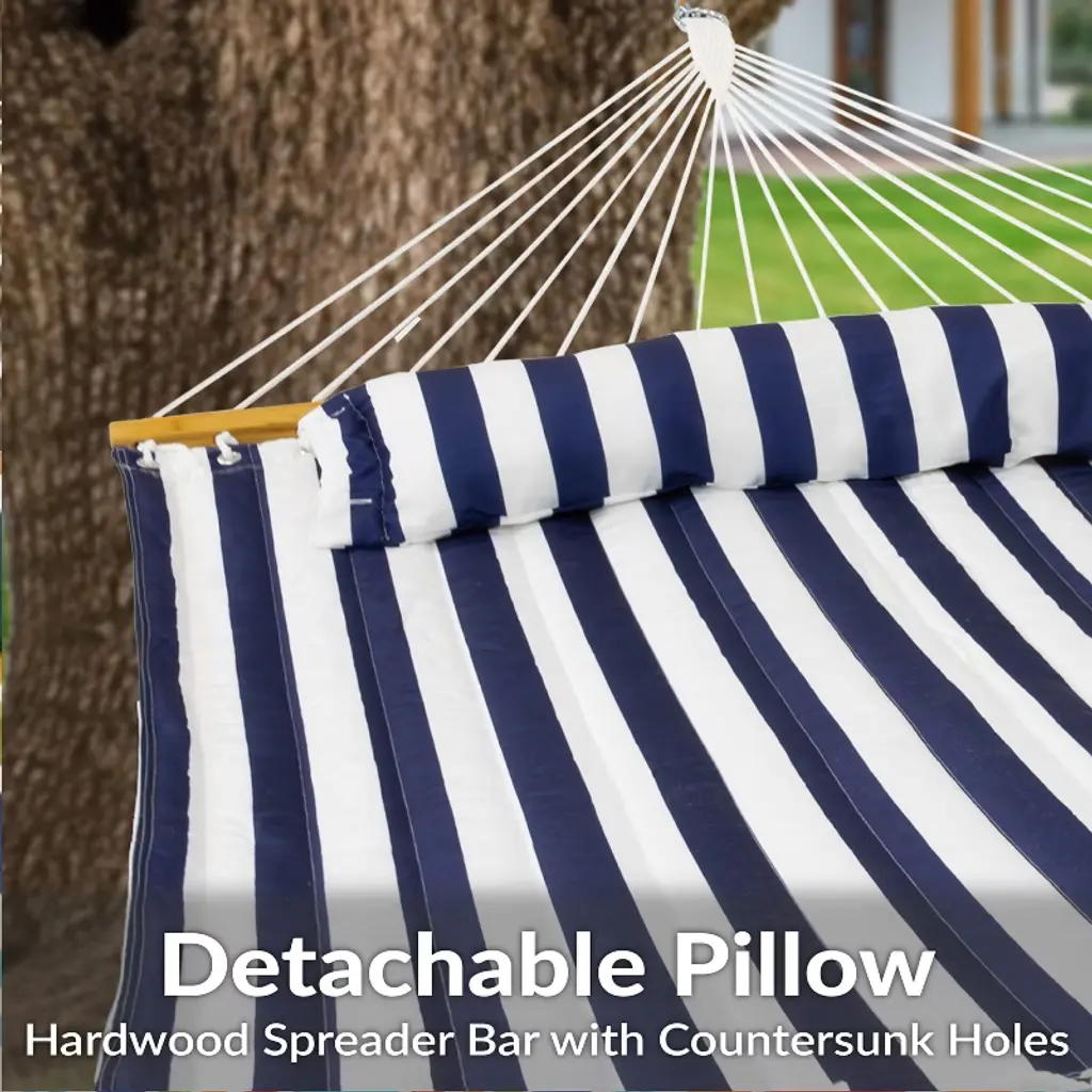 Experience ultimate relaxation with this extra-large 2-person quilted hammock. The spacious 77.5” W x 55” D outdoor hammock bed provides plenty of room for two adults, offering a cozy retreat for outdoor lounging. Crafted from 100% polyester fabric, this hammock for patio is both soft and weather resistant, ensuring long-lasting use in any outdoor space. Sturdy polyester ropes and hardwood spreader bars enhance stability while maintaining a stylish appearance. The spreader bars keep the hammock open, making it easy to get in and out for seamless use. A matching, cushioned pillow is included, providing extra support for the head and neck to enhance relaxation. Whether used for an afternoon nap, reading a book, or simply unwinding, this polyester hammock delivers a comfortable and supportive experience. Hang the outdoor hammock on a 15' hammock stand (not included) or between two trees to enjoy outdoor lounging anywhere.• EXTRA LARGE AND COZY: This hammock is longer than other quilted hammocks with a spacious 77.5" W x 55" D bed. This comfortable, double hammock for two supports up to 450 lbs, making it a great option for relaxing solo or snuggling up with a loved one. The hammock is 137" W from loop to loop.• DURABLE AND WEATHER RESISTANT: Crafted from 100% polyester fabric with durable, polyester ropes, this heavy-duty outdoor hammock withstands outdoor elements and lasting use. The hardwood spreader bars provide a sleek look and keep the hammock open and easy to get in and out of.• USE IN ANY OUTDOOR SPACE: Great for patios, backyards, porches, or gardens, this spreader bar hammock brings resort-style relaxation to any outdoor area. The hammock can be used with a 15' hammock stand (not included) or hung between 2 trees to provide a cozy relaxation spot wherever desired.• PROVIDES ULTIMATE COMFORT: The quilted design of this outdoor tree hammock provides extra padding and comfort compared to other hammock styles. It also includes a matching, cushioned pillow for extra head and neck support, making the lounging experience even more relaxing.• WORRY-FREE PURCHASING: Sunnydaze Decor backs its products with a 1-year manufacturer's warranty.