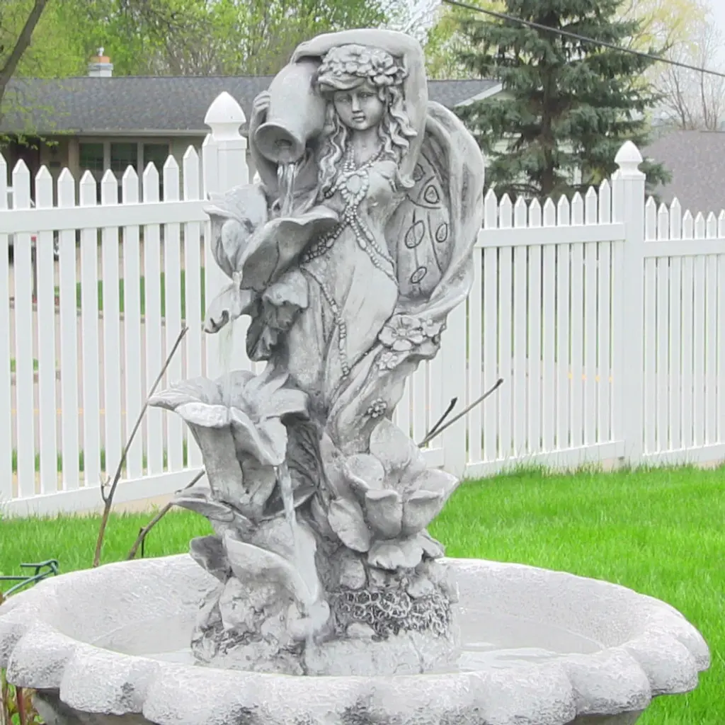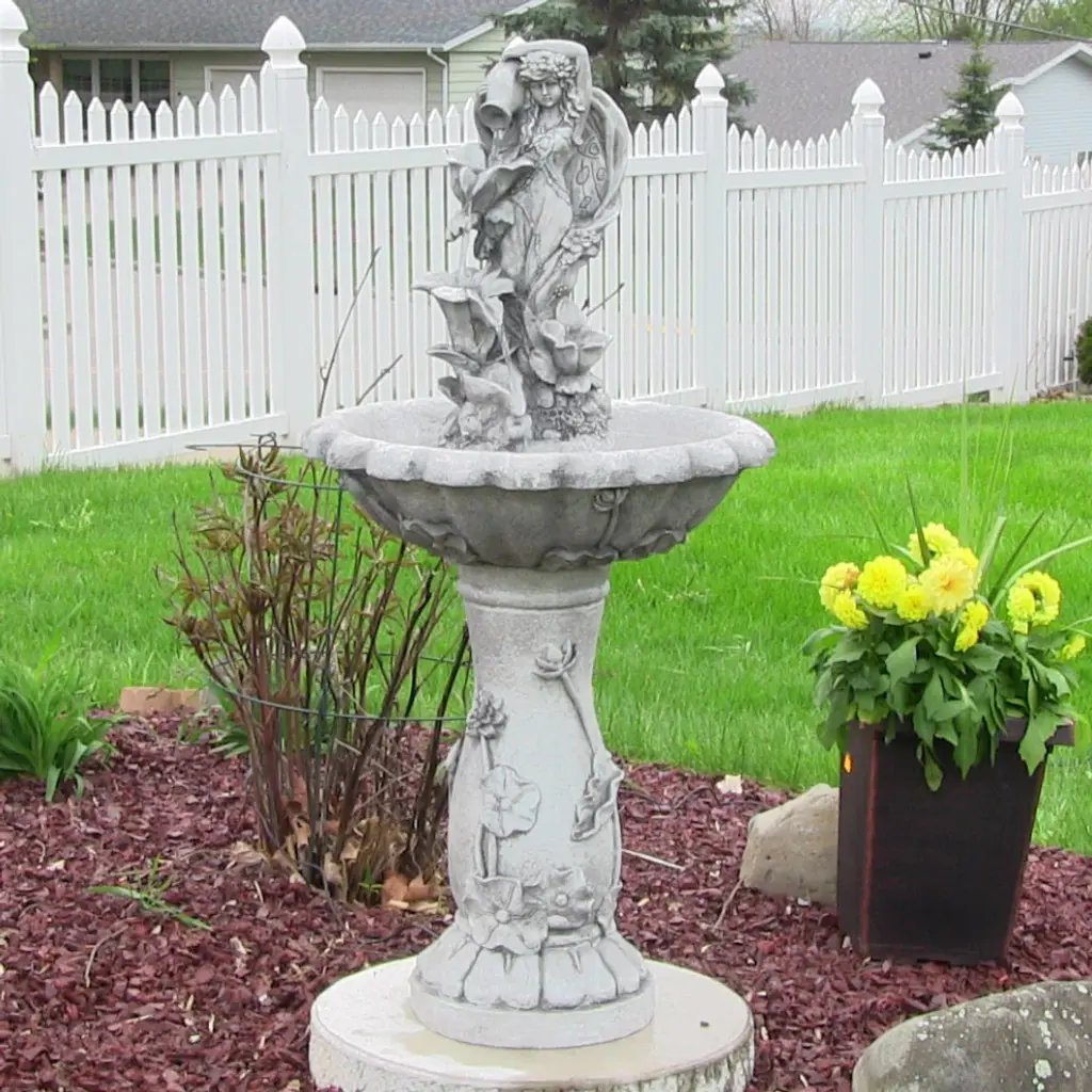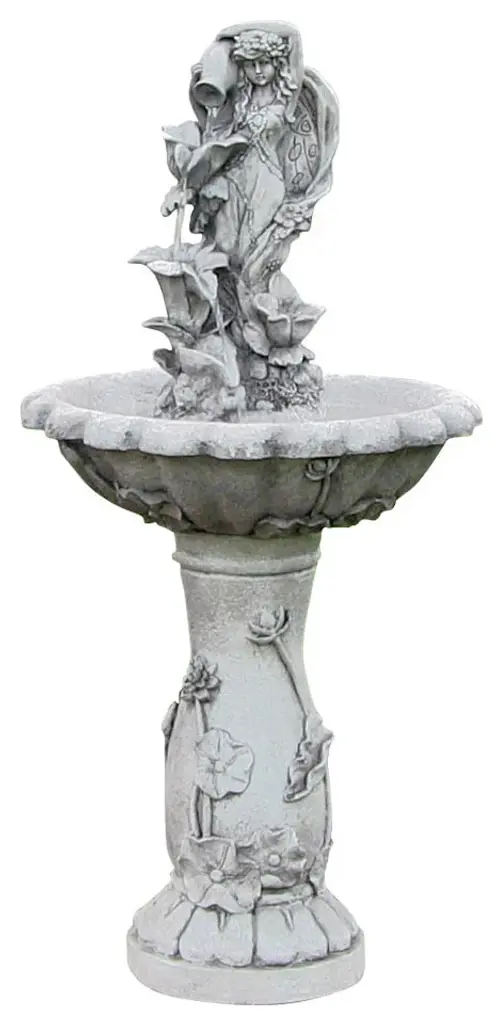 Add whimsy and charm to any garden, patio, or backyard with this outdoor water fountain. Depicting a fairy maiden with a pitcher resting on her shoulder, this sculptural white solar with battery backup feature is both whimsical and charming. Water cascades from the vessel held by the Mucha-inspired female figure, into a series of tiered lily-like flower blossoms, before collecting in the round basin and recirculating via the solar-powered pump, which is equipped with backup battery power. In good sunlight, the pump operates using solar power, while the battery pack collects and stores a charge. If it is a cloudy or dark, the battery will activate and power the unit, for as many as 4 hours when fully charged. If the batteries are depleted, the system will automatically attempt to draw power from the solar panel, and will resume running once the sun comes out.