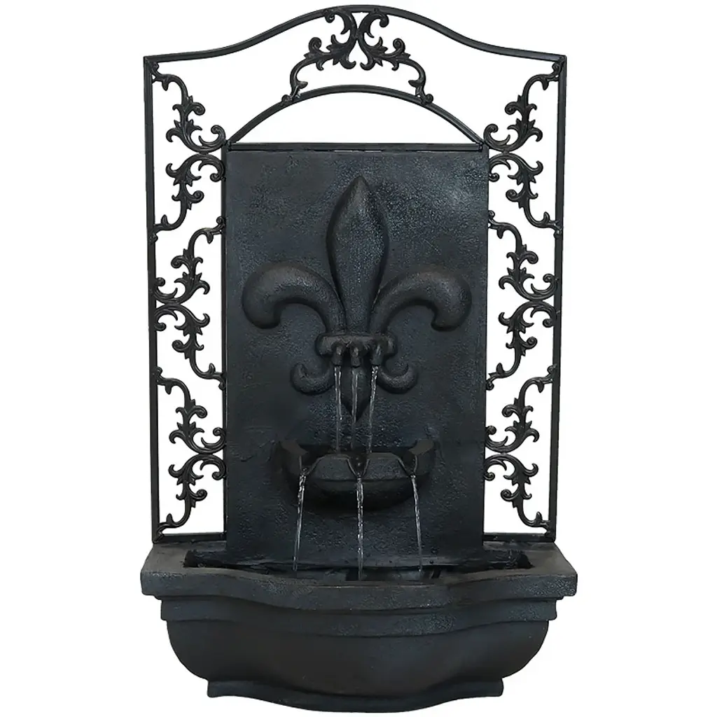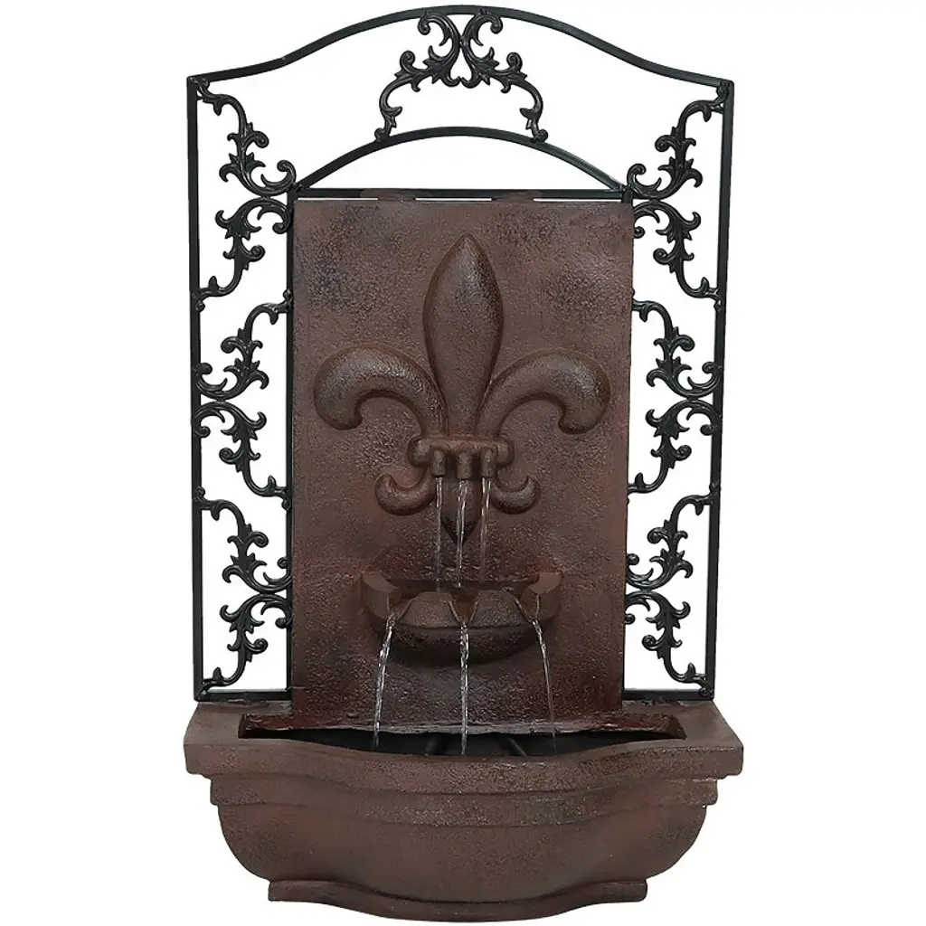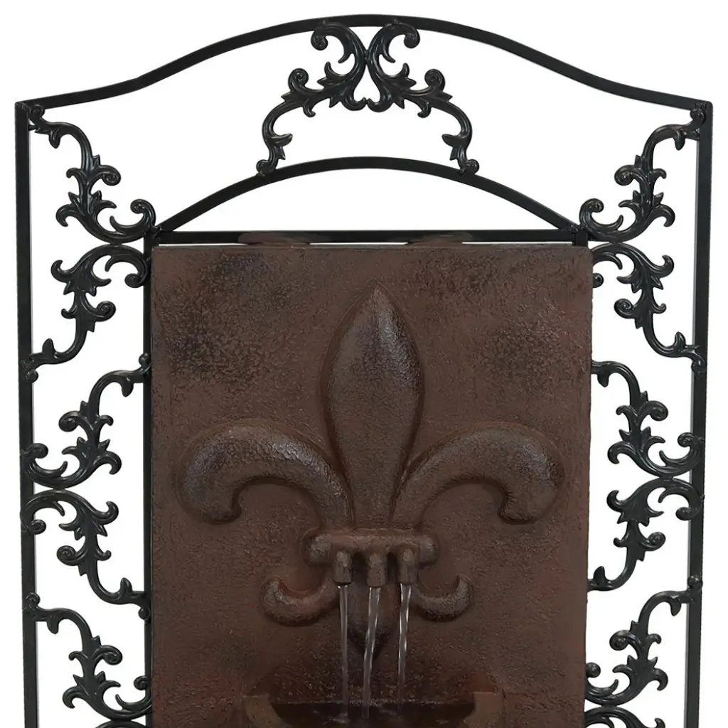 Reminiscent of old French design with a classic fleur-de-lis featured in center, this unique electric outdoor wall fountain emanates class and sophistication so it is perfect for the patio or garden wall. Enjoy the gentle sounds of water on the deck, patio or gazebo. Simple installation and hook up, just hang, plugin and enjoy! The rustic iron finish is a nice fit for most natural color schemes.