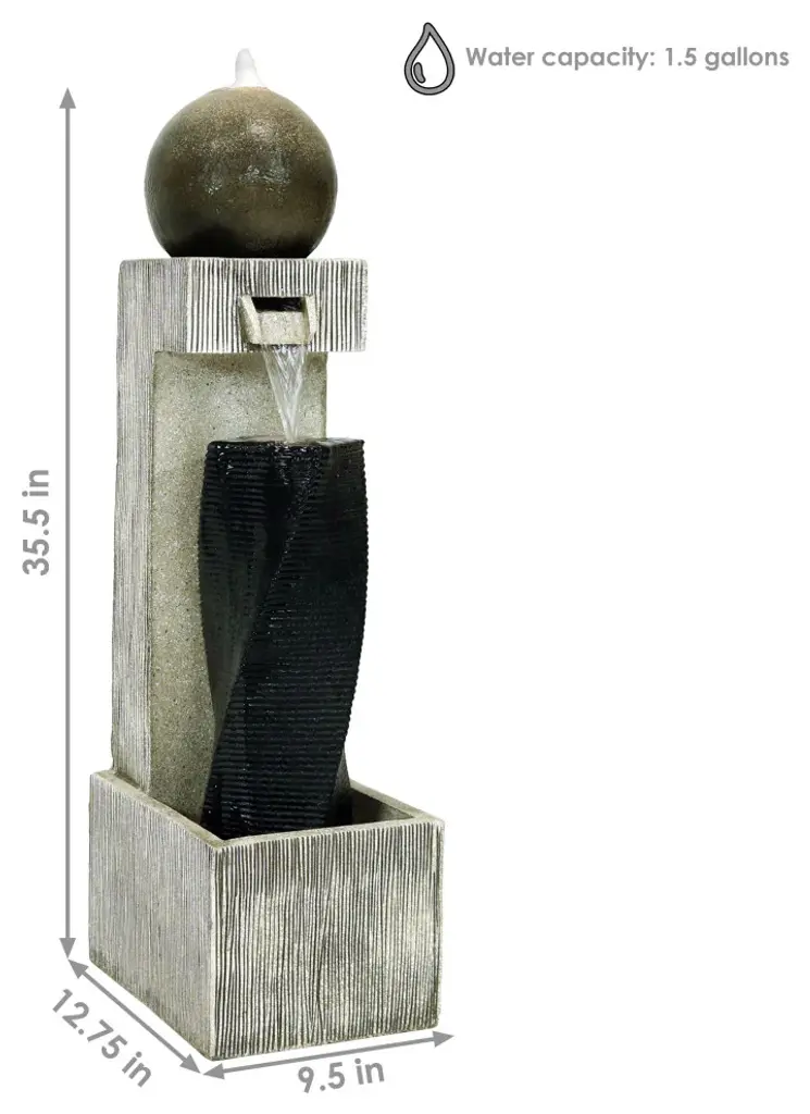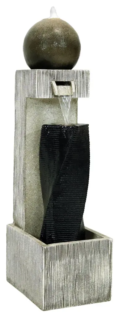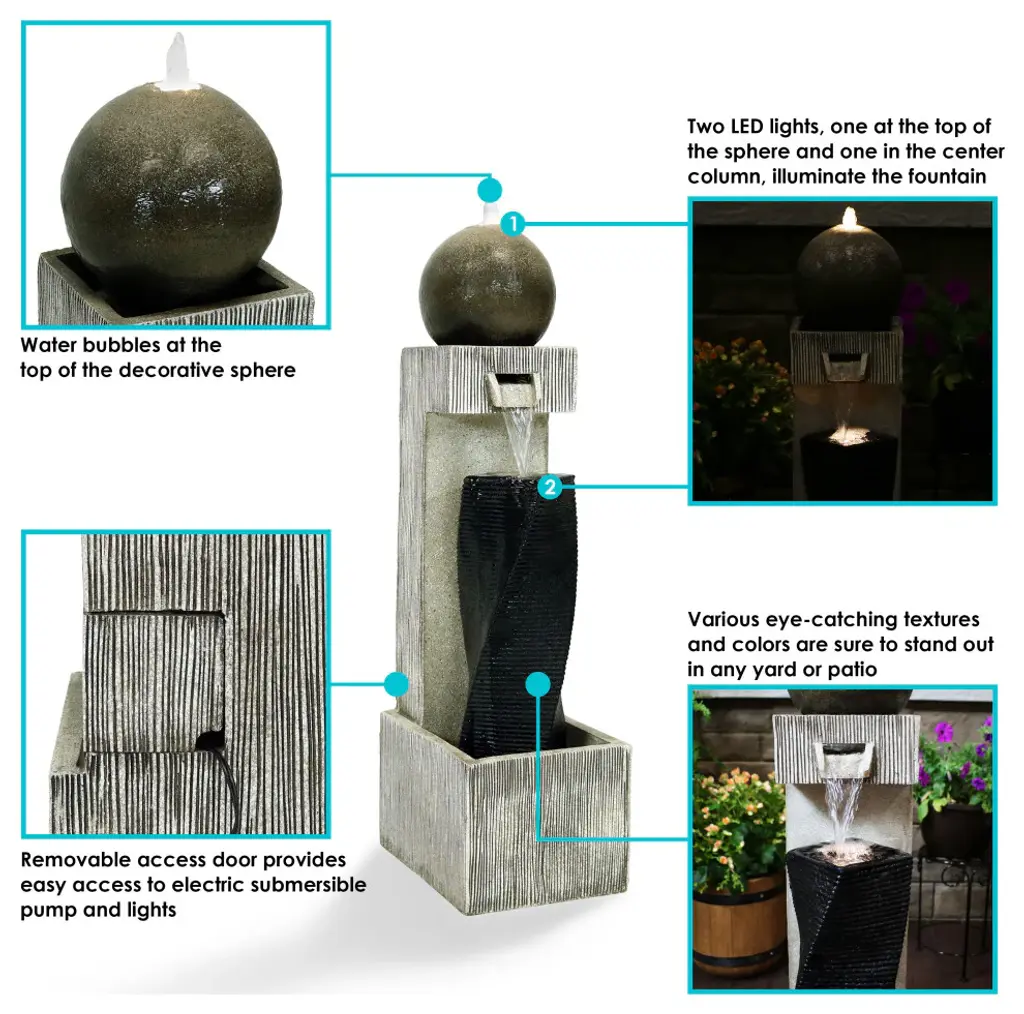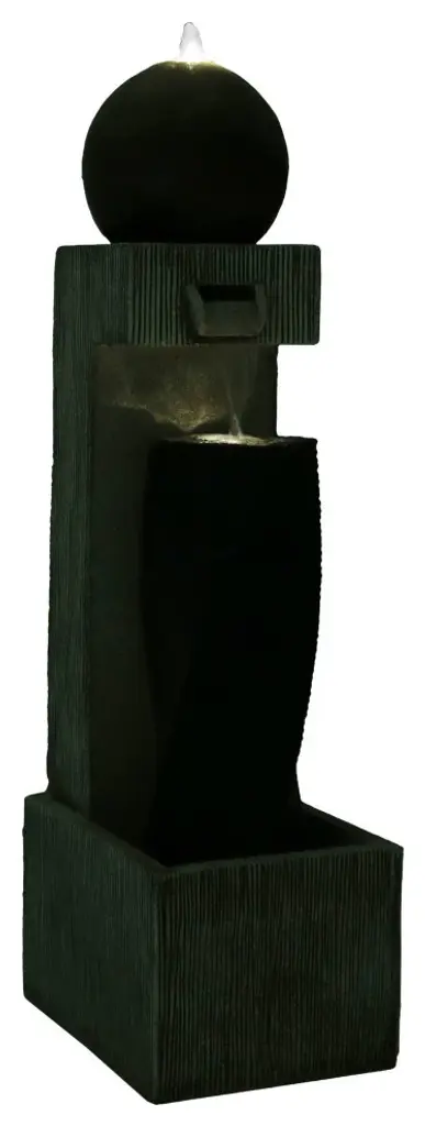 Add an artistic contemporary water feature to your garden or landscape with this outdoor fountain. Made of durable polyresin, this fountain features a variety of shapes and textures that lend visual interest to this outdoor decor piece. Water streams from the top of the sphere and streams out from the spout onto the black column below. The water flows down the ridges of the black column down to the basin below. Enjoy this beautiful water feature at night with the LED lights illuminating the fountain from the top of the sphere and the column. This fountain includes an electric submersible pump that makes it simple to set up, without any complicated installation or plumbing involved.