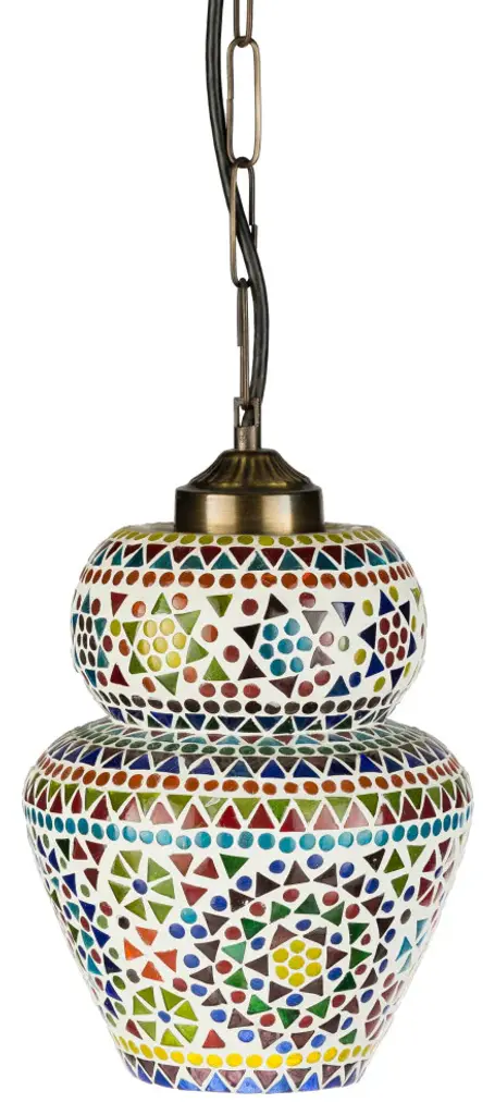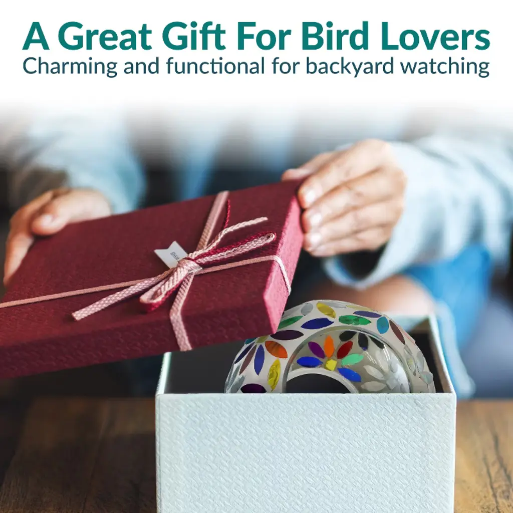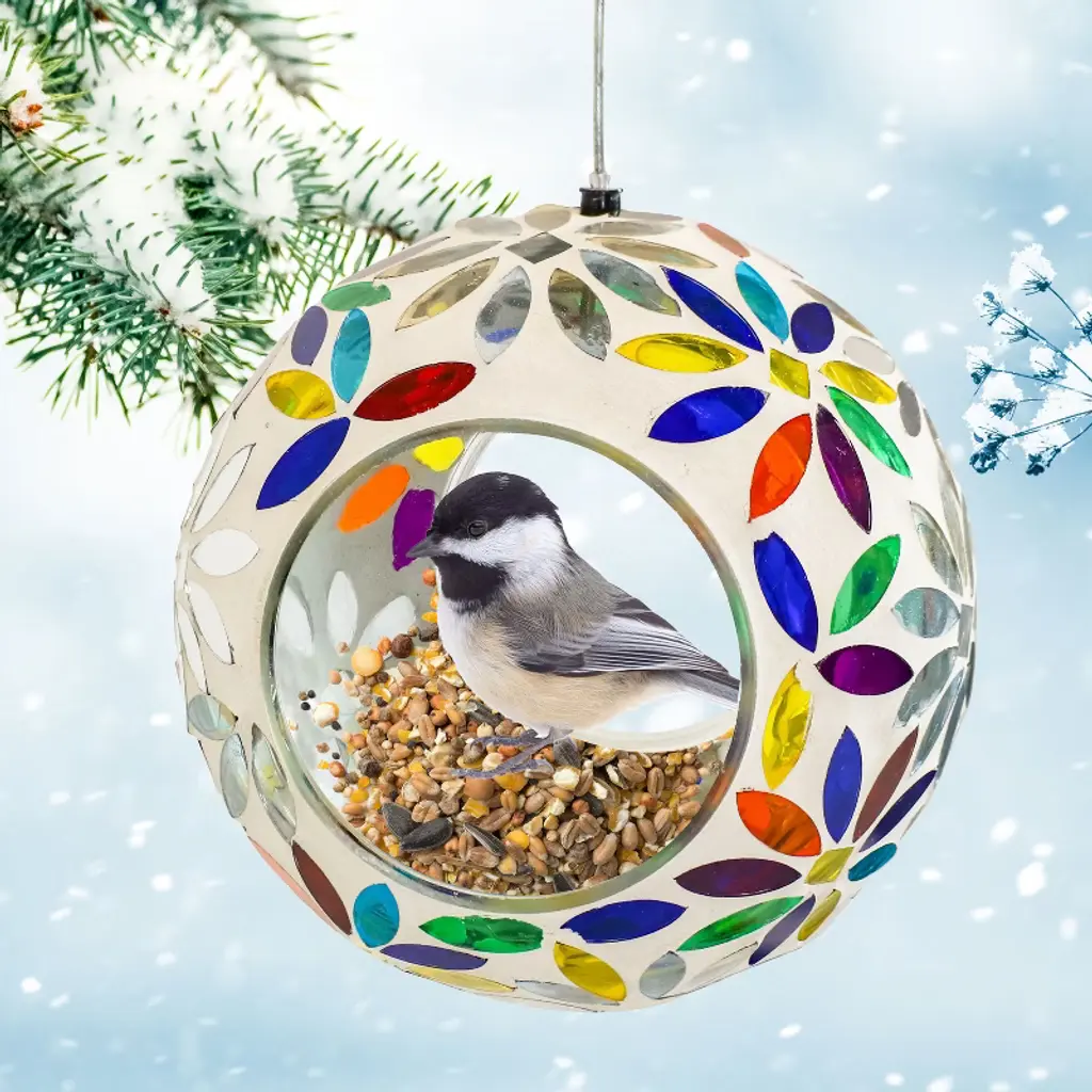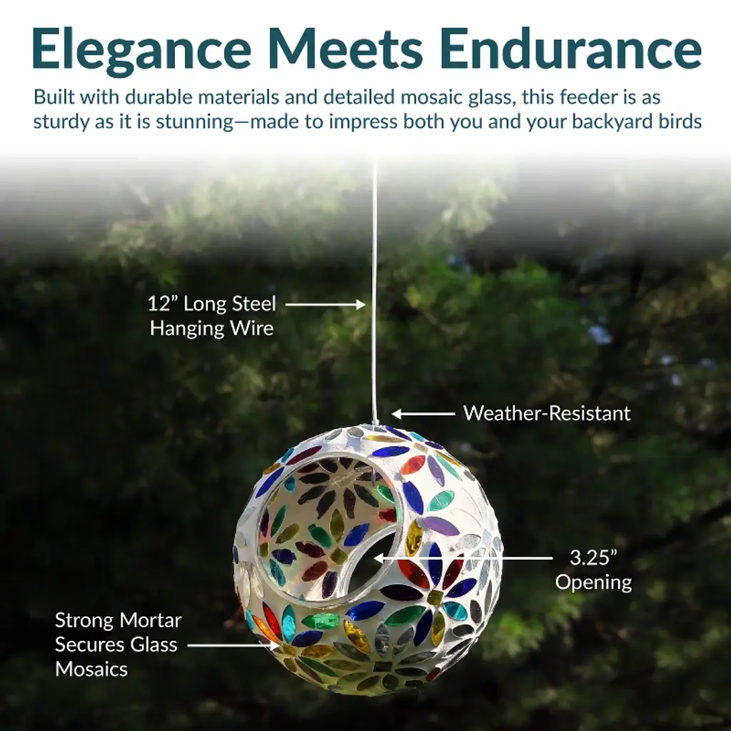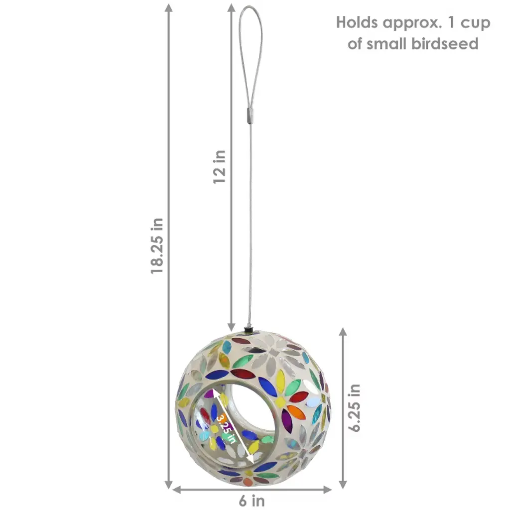 Give feathered friends a delectable meal in the backyard or add an attractive accent to the garden with this outdoor bird feeder. Made from mosaic glass, this sparkling bird feeder reflects sunlight to bring a beautiful glimmer of dancing colors to the backyard, garden, flower bed, or other outdoor space. The bird feeder can hold approximately 1 cup of bird seed and the center rims provide a place for feathered friends to perch while enjoying a snack. The small drainage hole in the bottom of the feeder keeps the bird seed dry and fresh for the birds to enjoy even on rainy days. This beautiful bird feeder also comes with a hanging wire to easily hang it from a porch ceiling, a tree branch, or on a shepherd hook (not included). Remember to bring this bird feeder indoors during harsh weather conditions to better ensure longevity.• GREAT SIZE FOR FEATHERED FRIENDS: This fly-through bird feeder measures 6" W x 5.25" D x 6.25" H and features a 3.25" fly-through opening. The bird feeder includes a 12” hanging wire. It weighs 1.2 lbs.• ATTRACT BIRDS TO THE YARD: This cute bird feeder features vibrant colors and a mosaic glass construction that is sure to appeal to humans and birds alike. The bright colors and reflective material will help attract a variety of bird species to the feeder including cardinals, finches, sparrows, and more. Plus, it will add a stylish pop of color to any patio decor. The open fly-through design also makes it easier for birds to access the seed, encouraging them to come back again and again.• EASY TO SET UP: Easily hang this small bird feeder using the included wire on a tree branch or shepherd hook. Position your hanging bird feeder near a window to enjoy close-up views of backyard birds from your kitchen or living room.• EASY TO FILL: The 3.25" diameter opening can be accessed from two sides, making it easy to fill the glass hanging bird feeder with seeds. The small drainage hole in the bottom of the mosaic bird feeder helps to keep seed dry and prevent moisture from building up. The mesh tape placed over the hole allows moisture to drain without spilling the seeds. It holds approximately 1 cup of small birdseed blend. Please note that the amount of food may vary depending on the type of seed you use.• WORRY-FREE PURCHASING: Sunnydaze Decor backs its products with a 1-year manufacturer's warranty.