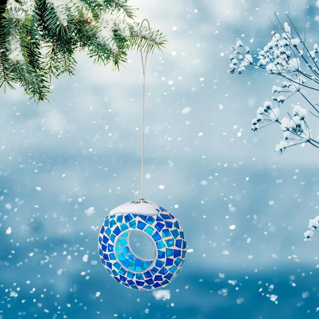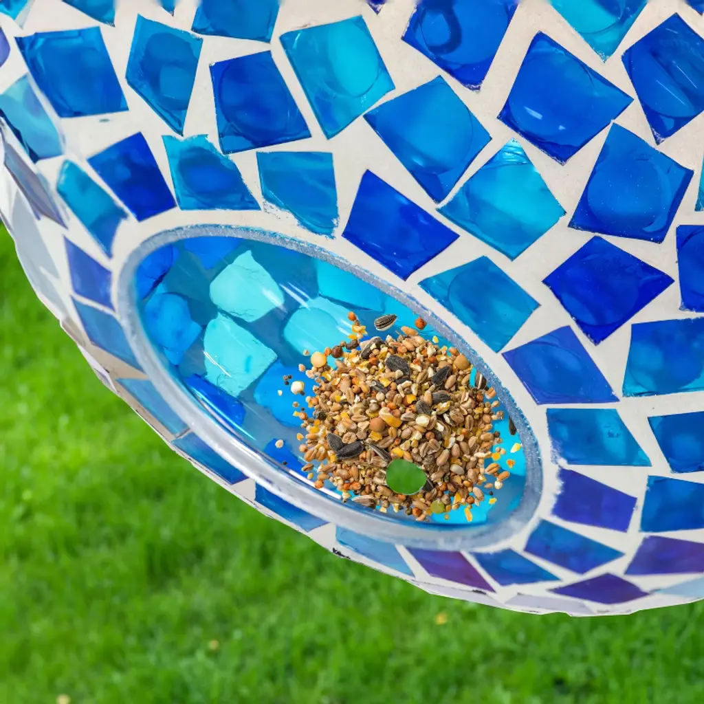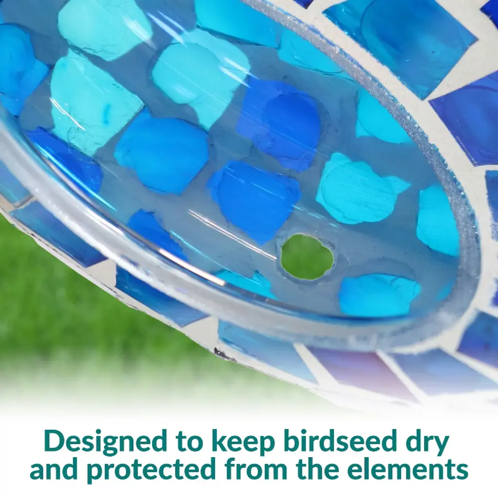 Give feathered friends a delectable meal in the backyard or add an attractive accent to the garden with this outdoor bird feeder. Made from mosaic glass, this sparkling bird feeder reflects sunlight to bring a beautiful glimmer of dancing colors to the backyard, garden, flower bed, or other outdoor space. The bird feeder can hold approximately 1 cup of bird seed and the center rims provide a place for feathered friends to perch while enjoying a snack. The small drainage hole in the bottom of the feeder keeps the bird seed dry and fresh for the birds to enjoy even on rainy days. This beautiful bird feeder also comes with a hanging wire to easily hang it from a porch ceiling, a tree branch, or on a shepherd hook (not included). Remember to bring this bird feeder indoors during harsh weather conditions to better ensure longevity.• GREAT SIZE FOR FEATHERED FRIENDS: This fly-through bird feeder measures 6.5" W x 2.75" D x 6.5" H and features a 2.75" fly-through opening. The bird feeder includes a 12” hanging wire. It weighs 0.8 lbs.• ATTRACT BIRDS TO THE YARD: This cute bird feeder features vibrant colors and a mosaic glass construction that is sure to appeal to humans and birds alike. The bright colors and reflective material will help attract a variety of bird species to the feeder including cardinals, finches, sparrows, and more. Plus, it will add a stylish pop of color to any patio decor. The open fly-through design also makes it easier for birds to access the seed, encouraging them to come back again and again.• EASY TO SET UP: Easily hang this small bird feeder using the included wire on a tree branch or shepherd hook. Position your hanging bird feeder near a window to enjoy close-up views of backyard birds from your kitchen or living room.• EASY TO FILL: The 2.75" diameter opening can be accessed from two sides, making it easy to fill the glass hanging bird feeder with seeds. The small drainage hole in the bottom of the mosaic bird feeder helps to keep seed dry and prevent moisture from building up. The mesh tape placed over the hole allows moisture to drain without spilling the seeds. It holds approximately 1 cup of small birdseed blend. Please note that the amount of food may vary depending on the type of seed you use.• WORRY-FREE PURCHASING: Sunnydaze Decor backs its products with a 1-year manufacturer's warranty.