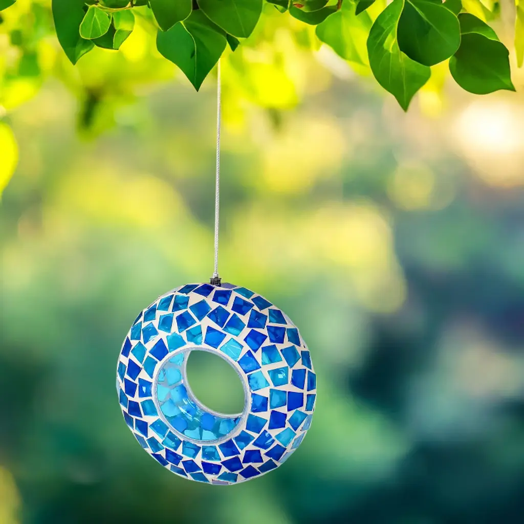 Sunnydaze Outdoor Garden Patio Round Glass With Mosaic Design Hanging Fly-through Bird Feeder - 6"- Blue