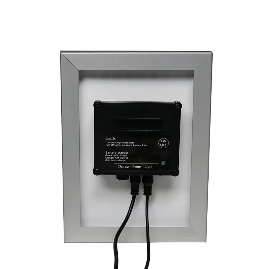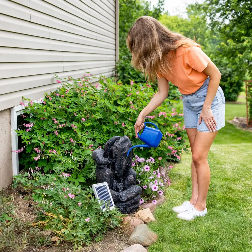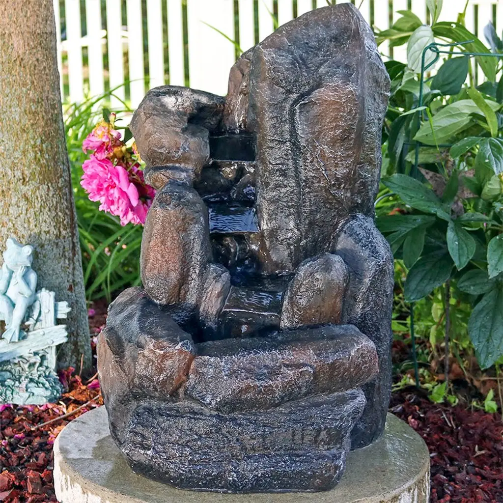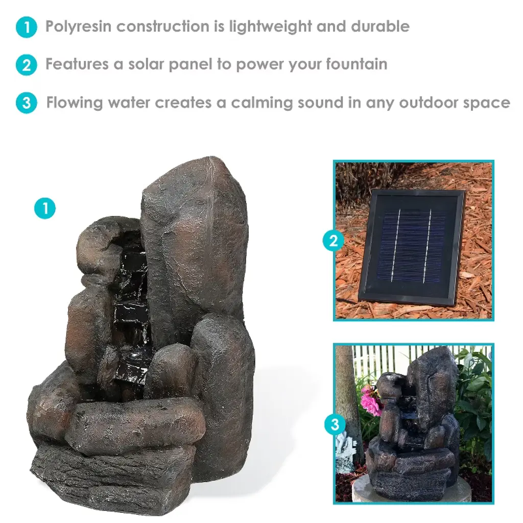 Enhance the natural elements in the garden, patio, yard, deck, or other outdoor space with this solar fountain. Water flows from the top level down to the bottom where it circulates with help from a submersible solar pump. Simply connect the pump to the tube in the fountain, connect the LED light cord and solar pump cord to the solar panel and place the panel in the sun. The rechargeable battery pack charges throughout the day (with or without the fountain running) so the gentle water sounds may be enjoyed in the evening as well. To run on battery mode simply press the battery On/Off button. Harness the rugged outdoors with this fountain. This beautiful piece naturally reflects the rocks and waterfalls of nature - only smaller, more accessible, and weather-resistant.• BEAUTIFUL GARDEN ACCENT: This fountain measures 15" W x 13" D x 22" H and weighs 17.5 lbs. It has a 2-gallon water capacity. It is the right size for a natural accent in any outdoor space. It is designed to resemble a natural rock waterfall complete with soothing sounds of cascading water.• DURABLE CONSTRUCTION: This water feature is constructed of a durable polyresin and fiberglass to ensure that the feature is lightweight and easy to move. Please note that fountains should always be emptied and covered, or emptied and brought indoors before freezing weather occurs.• EVERYTHING IS INCLUDED: This solar fountain with battery backup includes a pump and panel set with 3 LED lights located in the 2nd, 4th, and 5th levels. The solar technology with battery backup allows the fountain to run in and out of the sun.• SOLAR POWERED: Direct sunlight is needed to charge the solar panel, but the battery can keep the pump running when the clouds come out. To run on battery mode simply press the Battery On/Off button.• WORRY-FREE PURCHASING: Sunnydaze Decor backs its products with a 1-year manufacturer's warranty.