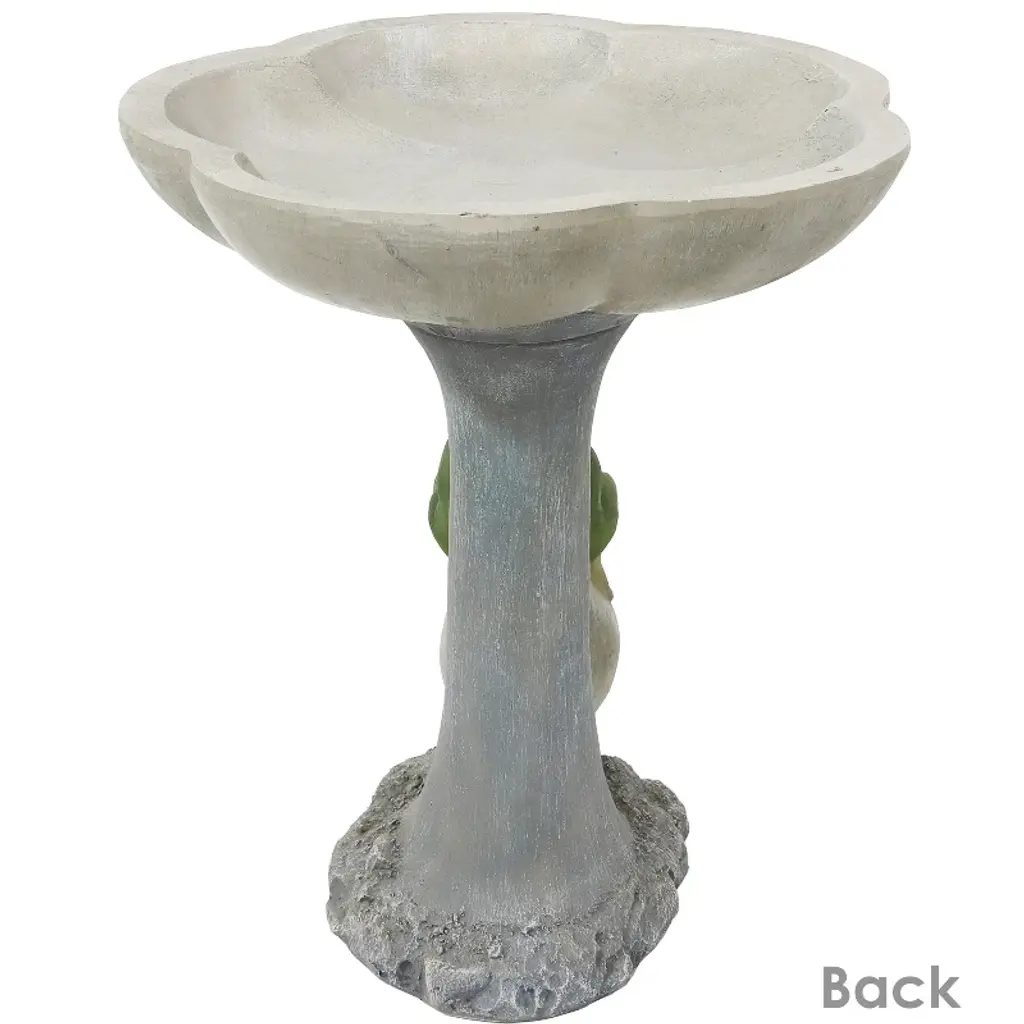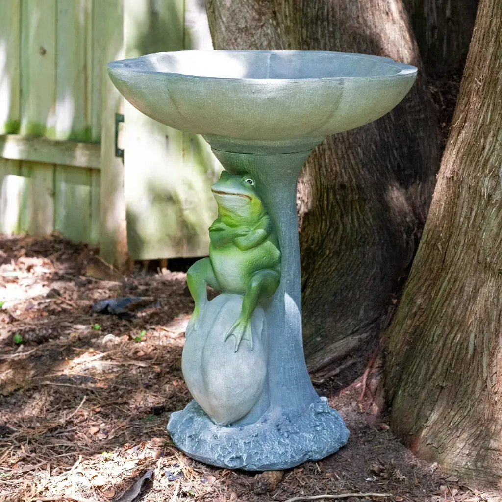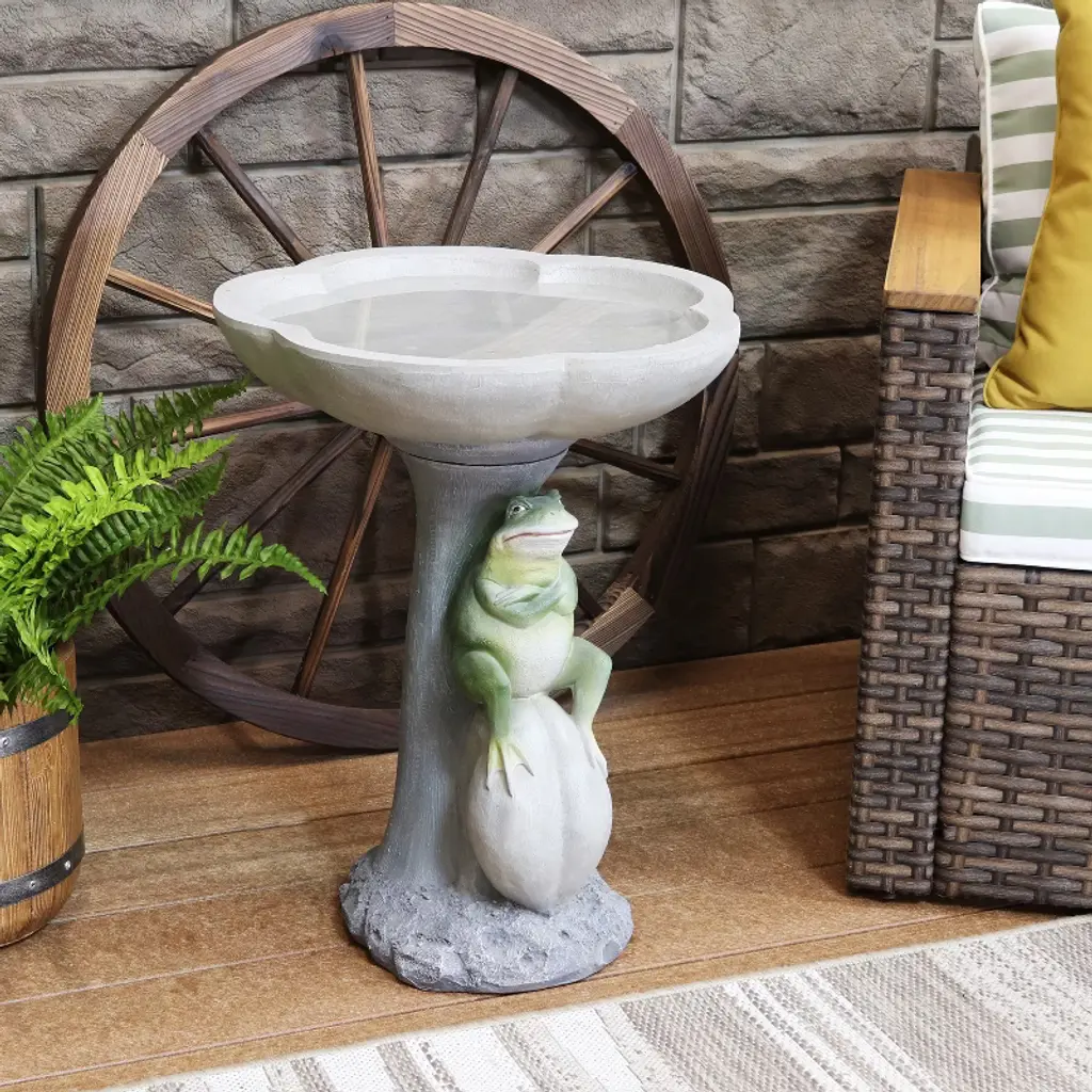 Add a whimsical element to the yard, garden, or patio with this brooding frog on a stone outdoor garden bird bath. Made from durable and smooth polyresin, this fountain features a grumpy frog perched on a stone and is sure to keep friends, family, and neighbors entertained. Polyresin is easy to maneuver wherever desired with its lightweight design, and the material is durable enough to withstand most weather conditions. This bird bath is easy to assemble. Simply twist the bowl clockwise to lock it on the pedestal. Once completed, place it anywhere to transform any outdoor space into a charming, bird paradise. The beautiful, smooth, and floral-inspired bowl is sure to add a unique element anywhere. Admire this frog as it pouts on its rock on any patio, deck, front porch, garden, yard, or by the window, and watch the birds come drink and freshen up in the water.• WHIMSICAL ADDITION TO OUTDOOR SPACES: Make a statement and attract wild birds to the garden, yard, patio, or deck with this stone-like bird bath. This unique bird bath measures 17" in diameter x 22" H overall and weighs 12.8 lbs. The bath basin is 17" in diameter x 2" H and can hold 0.5 gallon of water. The base measures 10" in diameter x 19" H. The frog statue measures 5" W x 5" D x 9" H.• MIMICS LOOK OF NATURAL STONE: This plastic bird bath for outdoors is made from durable polyresin with a natural finish to resemble stone. Polyresin is sturdy, yet lightweight to easily move this bird bath anywhere outside.• UNIQUE OUTDOOR ACCENT: Watch as the birds flock to the yard and rest at this heavy-duty bird bath. The shallow, wide bowl makes it easy for a variety of birds to perch and preen. • EASY SET UP: This large bird bath for outside requires minimal assembly. Simply twist and lock the bowl onto the pedestal and fill the bowl with water.• WORRY-FREE PURCHASING: Sunnydaze Decor backs its products with a 1-year manufacturer's warranty.