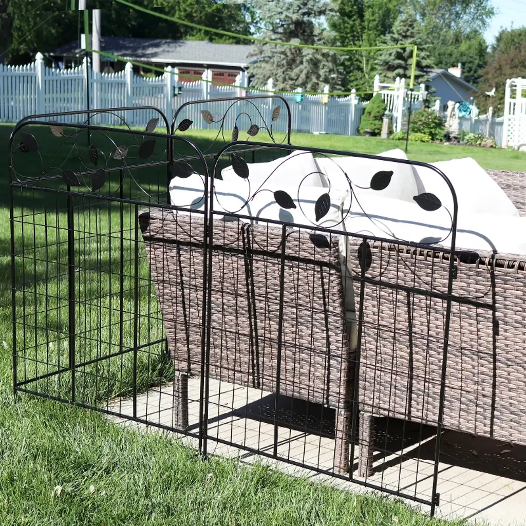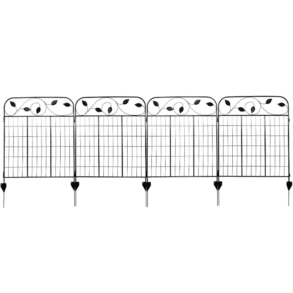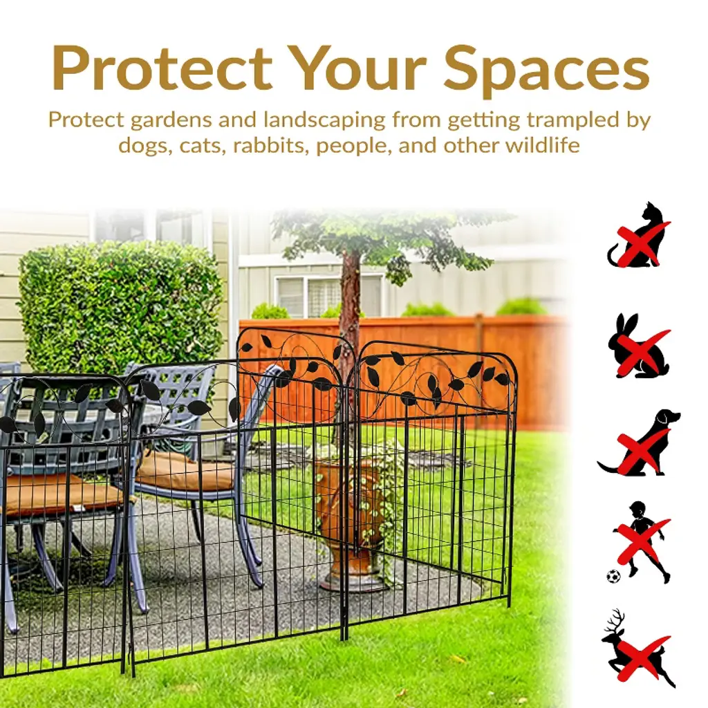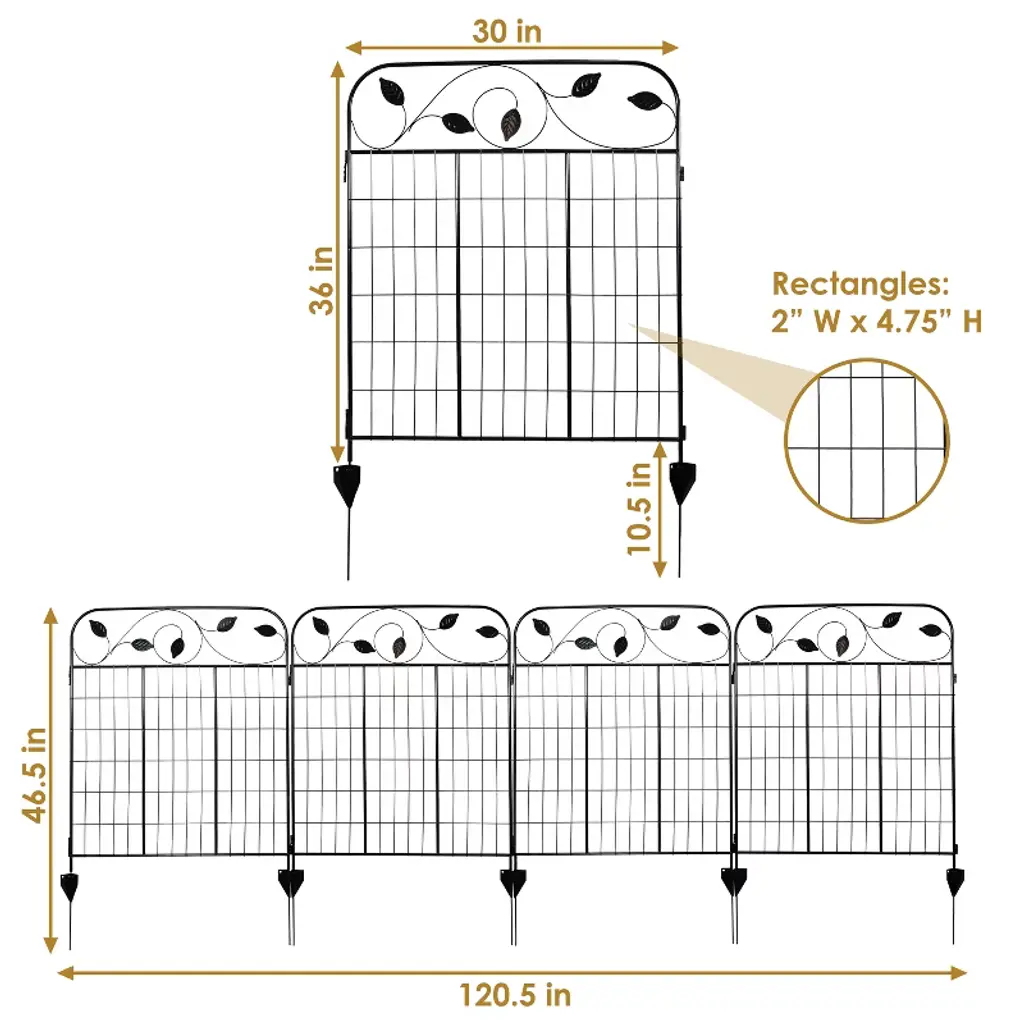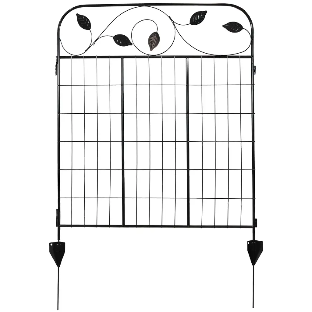 Create a border around a flower bed, pathway, or yard with these decorative garden fencing panels. Made from durable steel with a black powder coating, this set of 4 garden fencing panels is sure to last year after year in the yard or garden. The material is rust-resistant and weather-resistant, made to ensure outdoor use is a breeze. Each metal panel features leaves on a vine on a panel at the top and a wire fence design at the bottom for added elegance and protection. Each section is connected with a hook and loop on each side of the panel that are not rust-resistant and require a little more care and maintenance for longevity due to the material of the hardware. In addition, each panel stays upright effortlessly in the ground with the included 8 stakes. These fencing panels are sure to add an elegant accent to any outdoor space while providing protection when used to surround flower beds, bushes, and other plants.• CONNECT TO CREATE A FENCE: Connect the 4 landscape fence panels together to create a border around landscaping or anywhere in the yard. Each fence panel is 30" W x 36" H and weighs 3.6 lbs. When connected, the panels create a 120.5" or 10' fence.• DECORATIVE AND DURABLE: These vegetable garden fence panels are made from durable 2.5mm tubular steel with a black powder-coated finish to withstand most mild weather conditions.• ADDS DECORATIVE APPEAL: Romantic vine details and a grid bottom give this fence a charming and elegant garden accent. Use this black metal garden fence to create a decorative border in flower beds, landscaping, lawns, or trees. The panels can also be used in the garden as a trellis to support climbing plants and vines as they grow.• STAYS SECURELY IN PLACE: To assemble, press the included 8 stakes into the ground using the foot press and place the panels on top to keep them securely in the ground. Each decorative fence panel has a hook and loop on either side to connect to another panel. Slide the hook into the loop to connect the panels to create a border around flowers, septic tanks, or landscape accents.• WORRY-FREE PURCHASING: Sunnydaze Decor backs its products with a 1-year manufacturer's warranty.