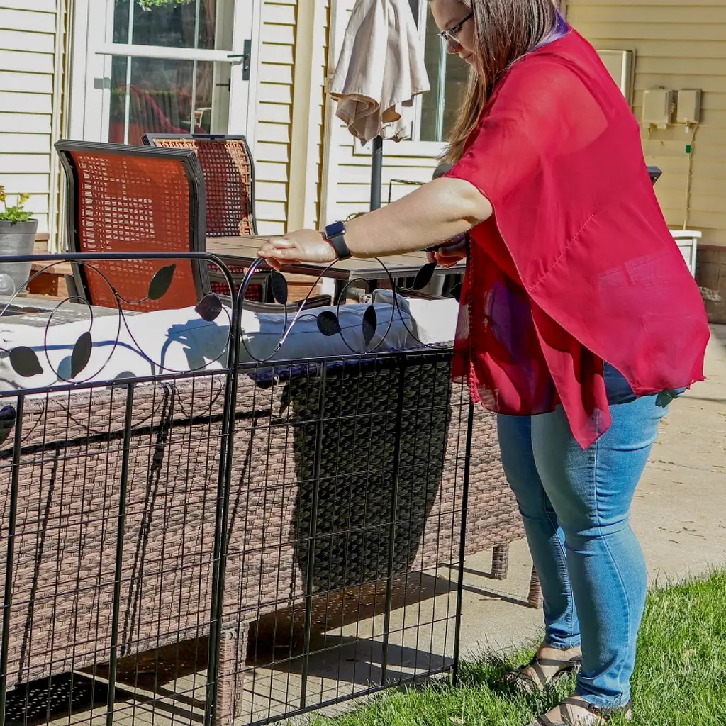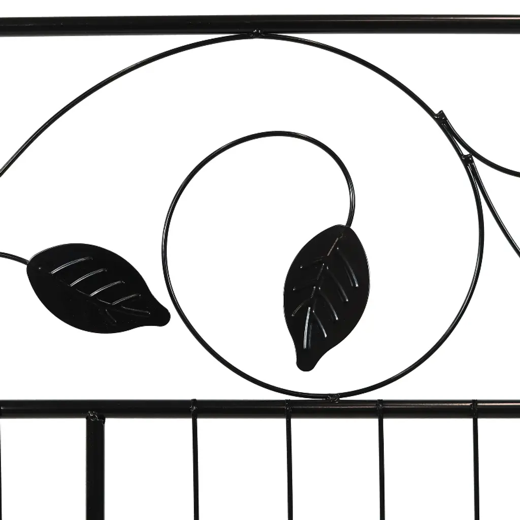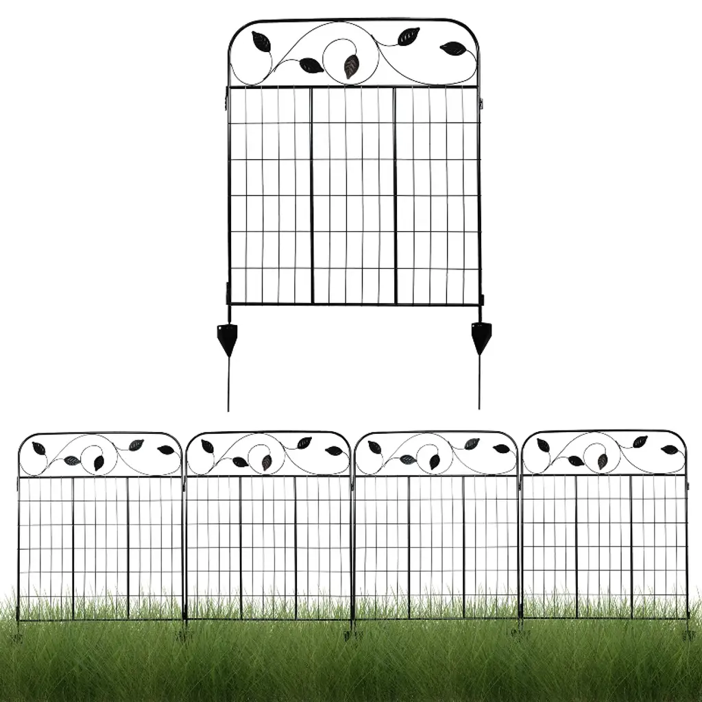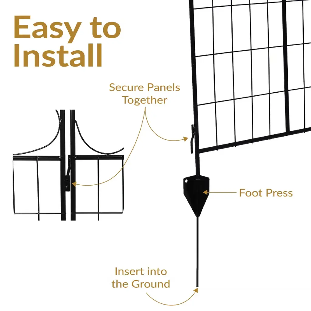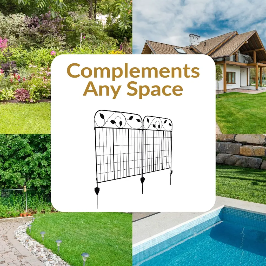 Create a border around a flower bed, pathway, or yard with these decorative garden fencing panels. Made from durable steel with a black powder coating, this set of 4 garden fencing panels is sure to last year after year in the yard or garden. The material is rust-resistant and weather-resistant, made to ensure outdoor use is a breeze. Each metal panel features leaves on a vine on a panel at the top and a wire fence design at the bottom for added elegance and protection. Each section is connected with a hook and loop on each side of the panel that are not rust-resistant and require a little more care and maintenance for longevity due to the material of the hardware. In addition, each panel stays upright effortlessly in the ground with the included 8 stakes. These fencing panels are sure to add an elegant accent to any outdoor space while providing protection when used to surround flower beds, bushes, and other plants.• CONNECT TO CREATE A FENCE: Connect the 4 landscape fence panels together to create a border around landscaping or anywhere in the yard. Each fence panel is 30" W x 36" H and weighs 3.6 lbs. When connected, the panels create a 120.5" or 10' fence.• DECORATIVE AND DURABLE: These vegetable garden fence panels are made from durable 2.5mm tubular steel with a black powder-coated finish to withstand most mild weather conditions.• ADDS DECORATIVE APPEAL: Romantic vine details and a grid bottom give this fence a charming and elegant garden accent. Use this black metal garden fence to create a decorative border in flower beds, landscaping, lawns, or trees. The panels can also be used in the garden as a trellis to support climbing plants and vines as they grow.• STAYS SECURELY IN PLACE: To assemble, press the included 8 stakes into the ground using the foot press and place the panels on top to keep them securely in the ground. Each decorative fence panel has a hook and loop on either side to connect to another panel. Slide the hook into the loop to connect the panels to create a border around flowers, septic tanks, or landscape accents.• WORRY-FREE PURCHASING: Sunnydaze Decor backs its products with a 1-year manufacturer's warranty.