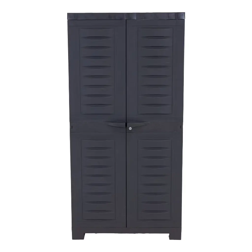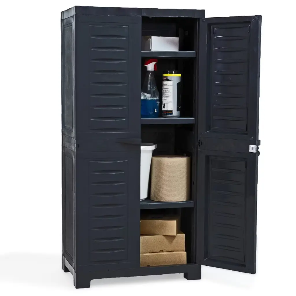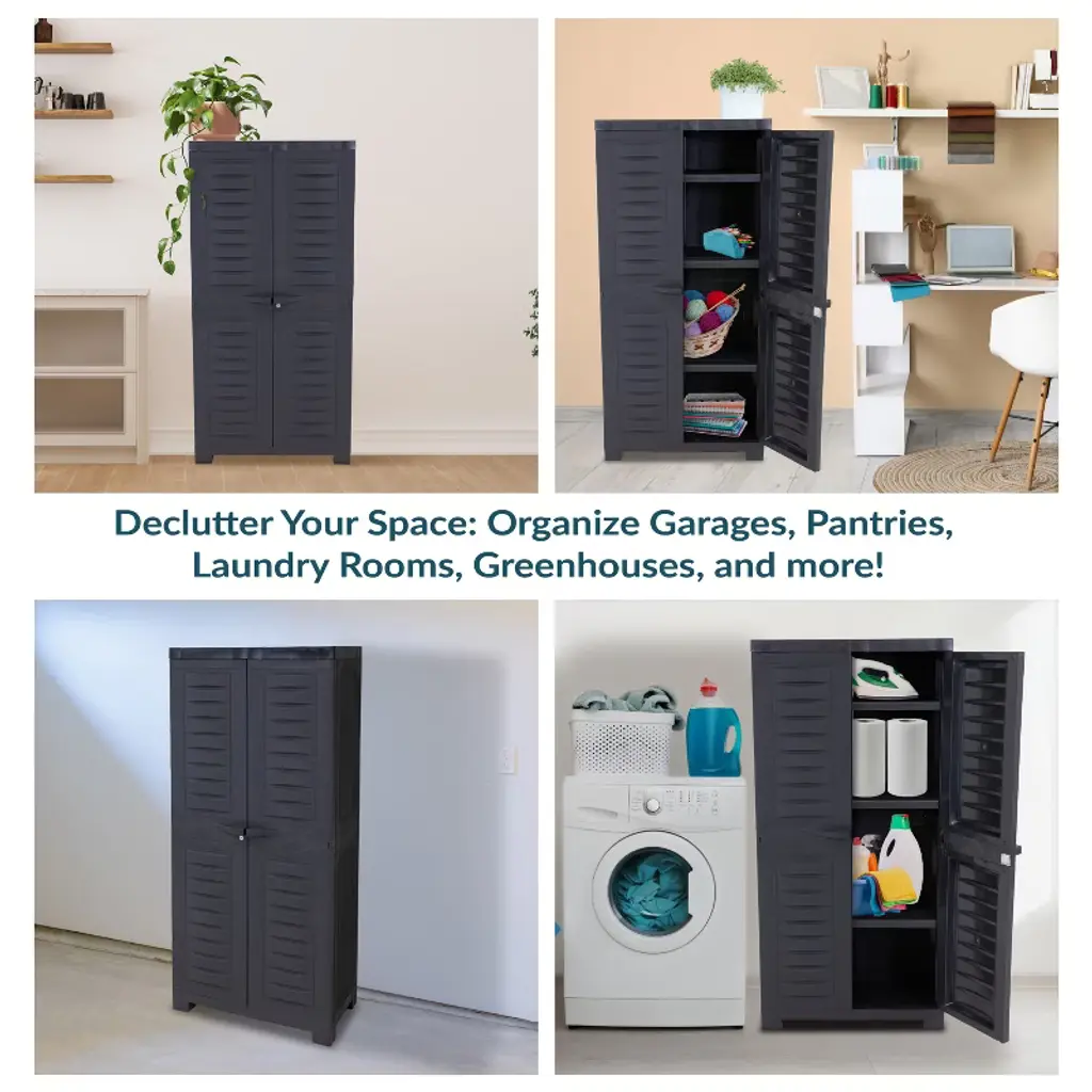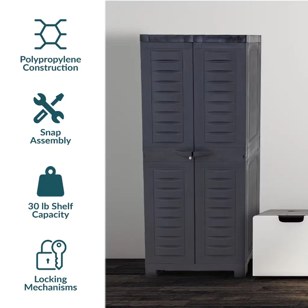 Whether organizing tools in the garage or storing essentials in the basement, the adaptability and durability of this utility storage cabinet make it a reliable choice. Crafted from polypropylene, this versatile garage tool storage cabinet won't rust or peel no matter where it's used. With three adjustable shelves, it provides a customizable storage solution to accommodate various household items. The lockable doors ensure the contents inside stay out of sight and secure, giving peace of mind when storing chemicals or cleaning products. Use the included keys to unlock access to the items placed inside. The cabinet comes with 2 keys for added convenience. This cabinet withstands the test of time due to the durable material, making it a great option for many locations. Use the cabinet in the shed, garage, basement, mud room, and more to keep a variety of items neatly organized.• PROVIDES CONVENIENT STORAGE: The compact size of this heavy-duty plastic utility storage cabinet with doors makes it a convenient storage option for large and small spaces. The cabinet measures 23.5" W x 14" D x 48.75" H overall and weighs 24 lbs. Each shelf measures 21" W x 11.75" D and can be adjusted every 4". Each shelf holds 30 lbs, and the top of the cabinet holds 30 lbs.• HEAVY-DUTY MATERIAL: Made from durable polypropylene, this plastic garage cabinet with shelves is built for indoor areas and garages. Polypropylene won't peel or rust, unlike metal or wood, making caring for this cabinet almost maintenance-free.• VERSATILE STORAGE SOLUTION: Adjust the shelves in the resin storage cabinet to store a variety of items. The cabinet can be used for organizing tools, extension cords, and more in the garage, or place it in a mudroom to contain shoes, cold weather gear, and other necessities. The cabinet can also be used in other areas to keep office supplies or cleaning supplies organized. It includes an anti-tip kit to securely anchor the cabinet to the wall for additional stability.• LOCKABLE DOORS: The doors of the storage cabinet for garage can be locked to keep belongings safely contained. There are 2 keys included with the cabinet. The opaque doors of the cabinet ensure the contents remain concealed for a clutter-free look no matter where it's placed. Do not allow children or pets to play on or inside the cabinet. Keep the doors closed when not in use.• WORRY-FREE PURCHASING: Sunnydaze Decor backs its products with a 1-year manufacturer's warranty.