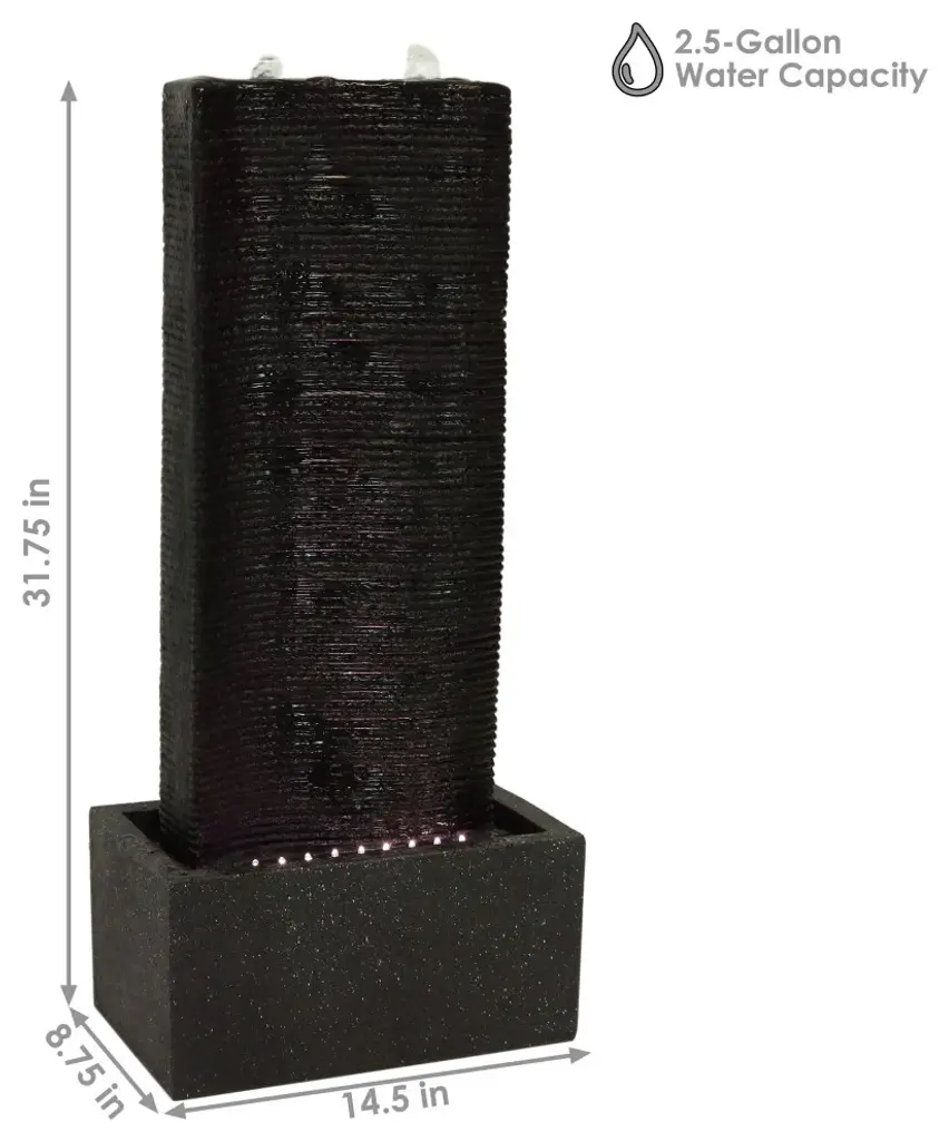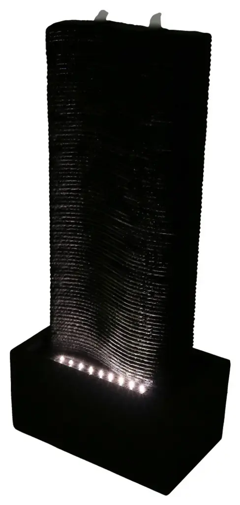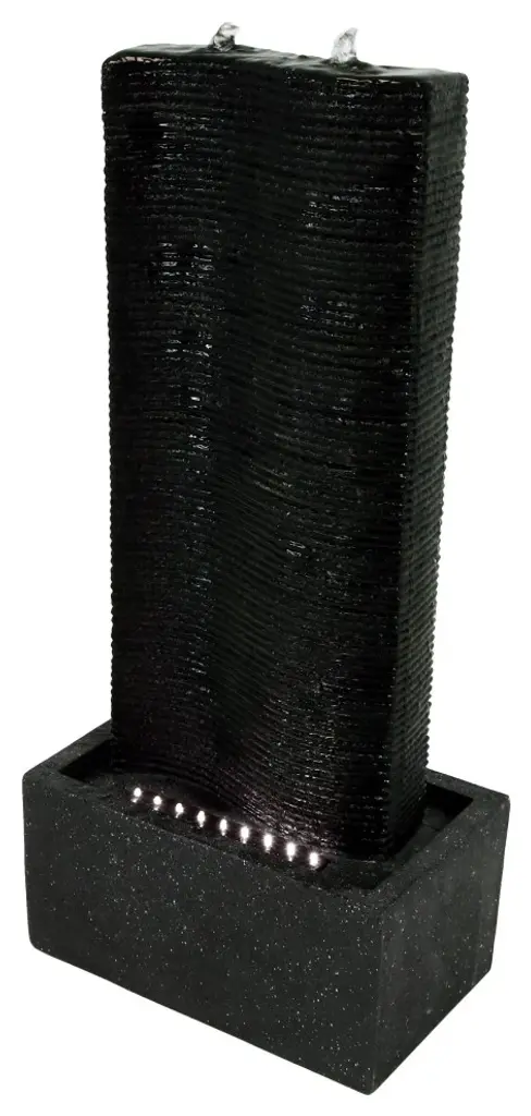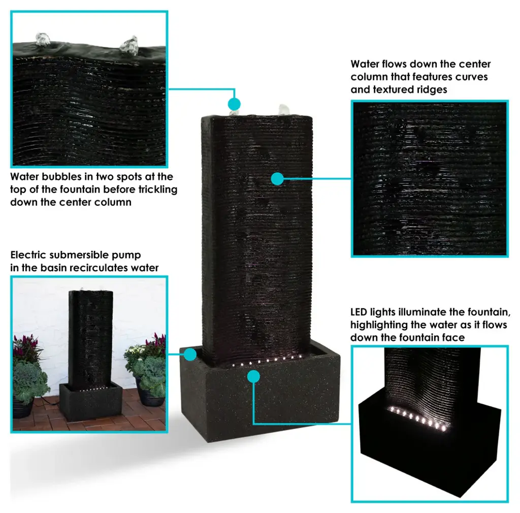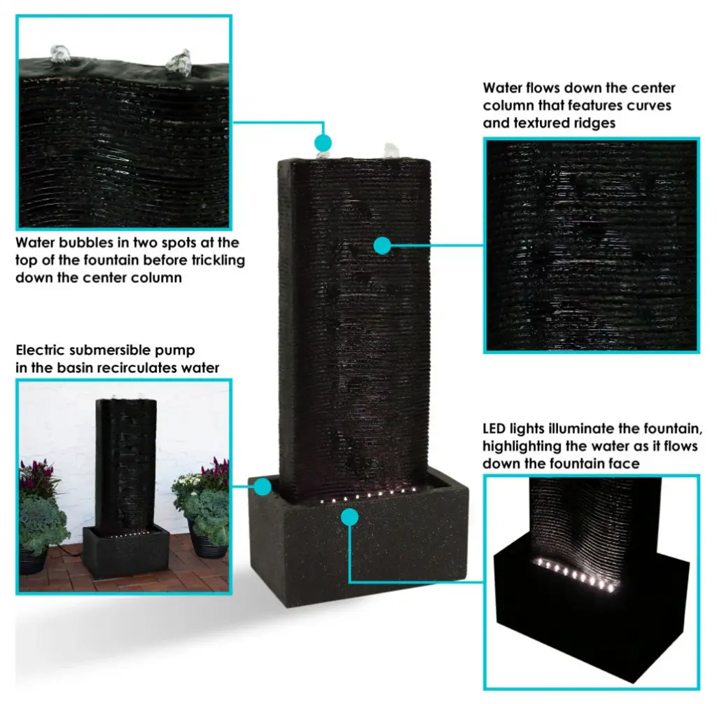 Enhance any garden or patio with this impressive lighted water feature. Made of lightweight and durable polyresin, this fountain can easily be moved to an ideal location, yet can withstand the elements outside. Atop the center column, water bubbles up in two spots and then flows down the textured ridges. The basin features lights that highlights the water as it falls down the sides of the column. This beautiful fountain does not require any complicated plumbing or installation, thanks to the included electric submersible pump.
