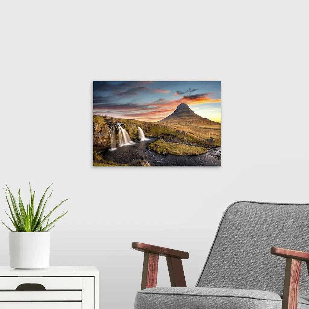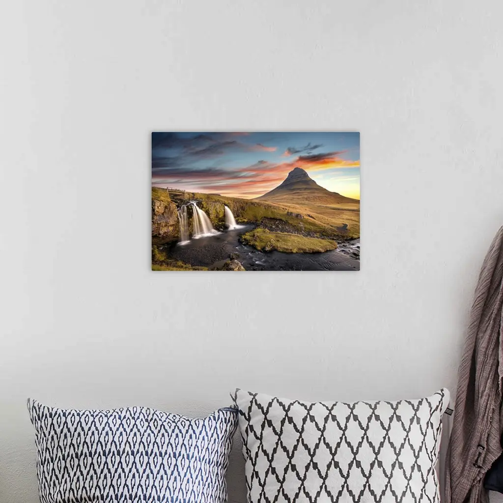 Sunrise at Kirkjufell Mountain overlooking a small waterfall, Iceland, Polar Regions