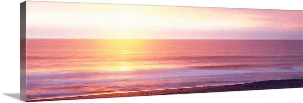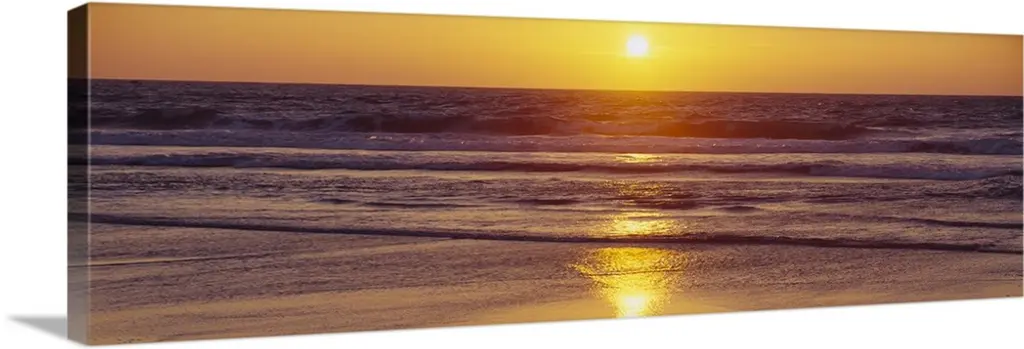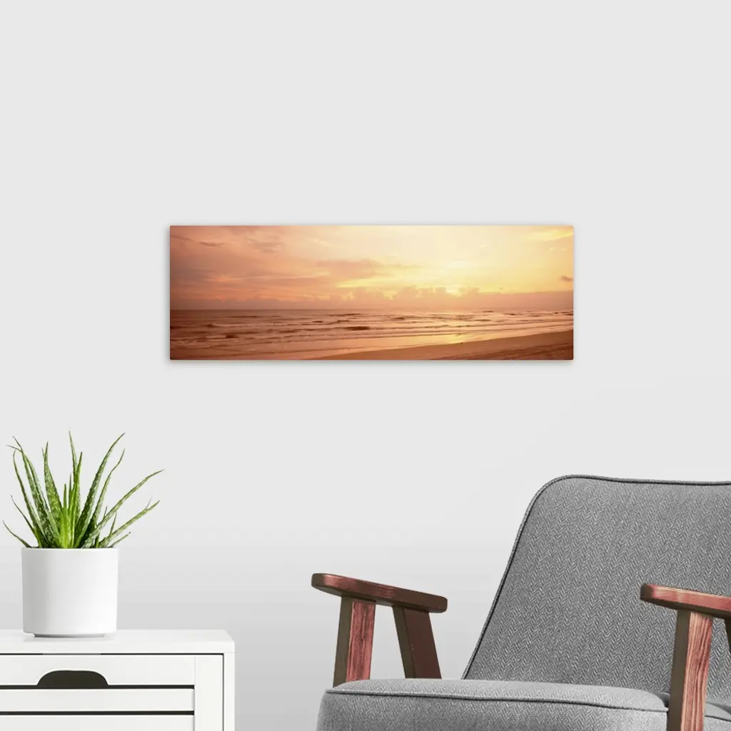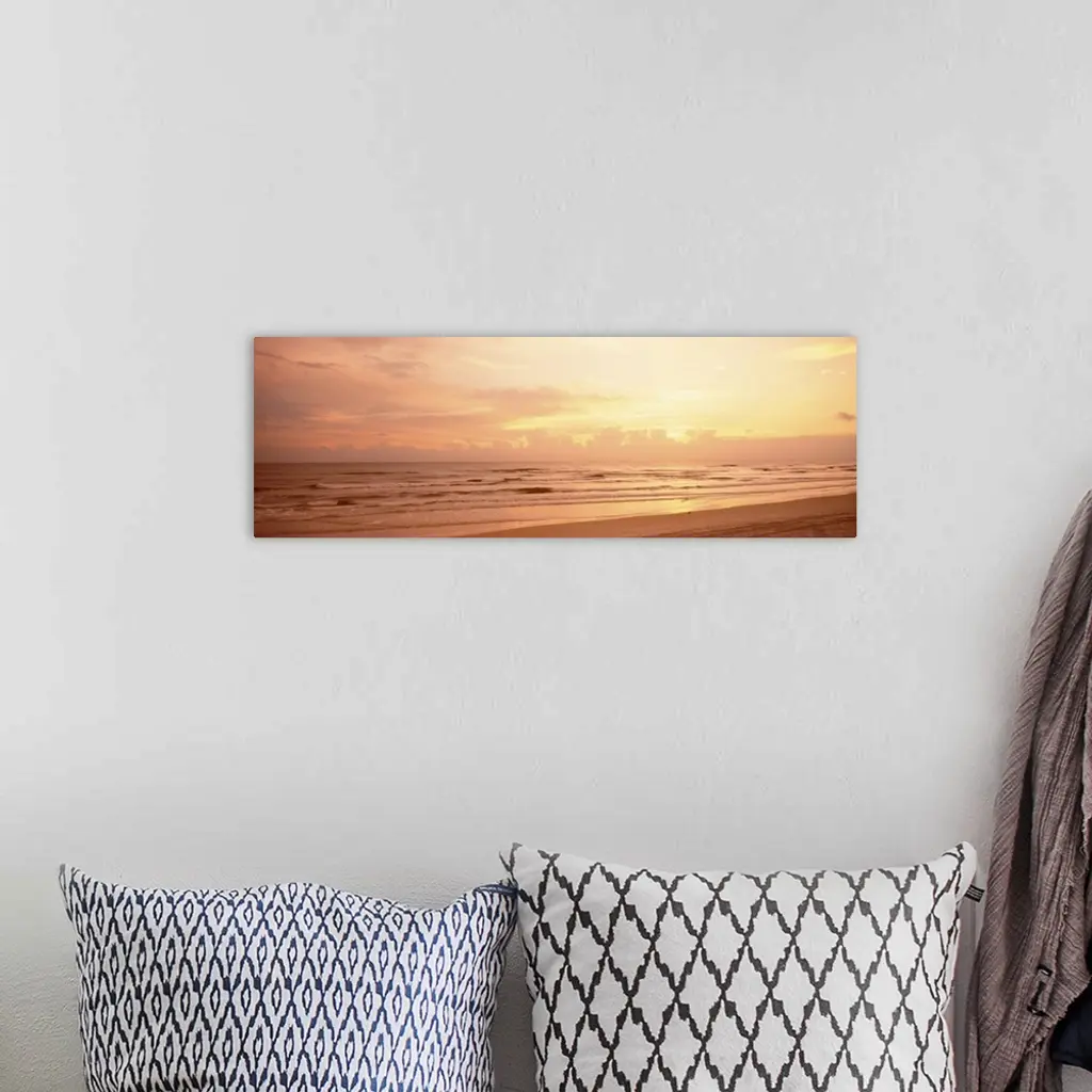 Panoramic photograph of the sun rising above the clouds as small waves break on the sandy shore.