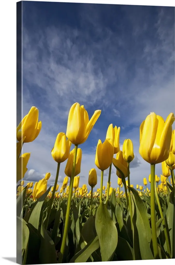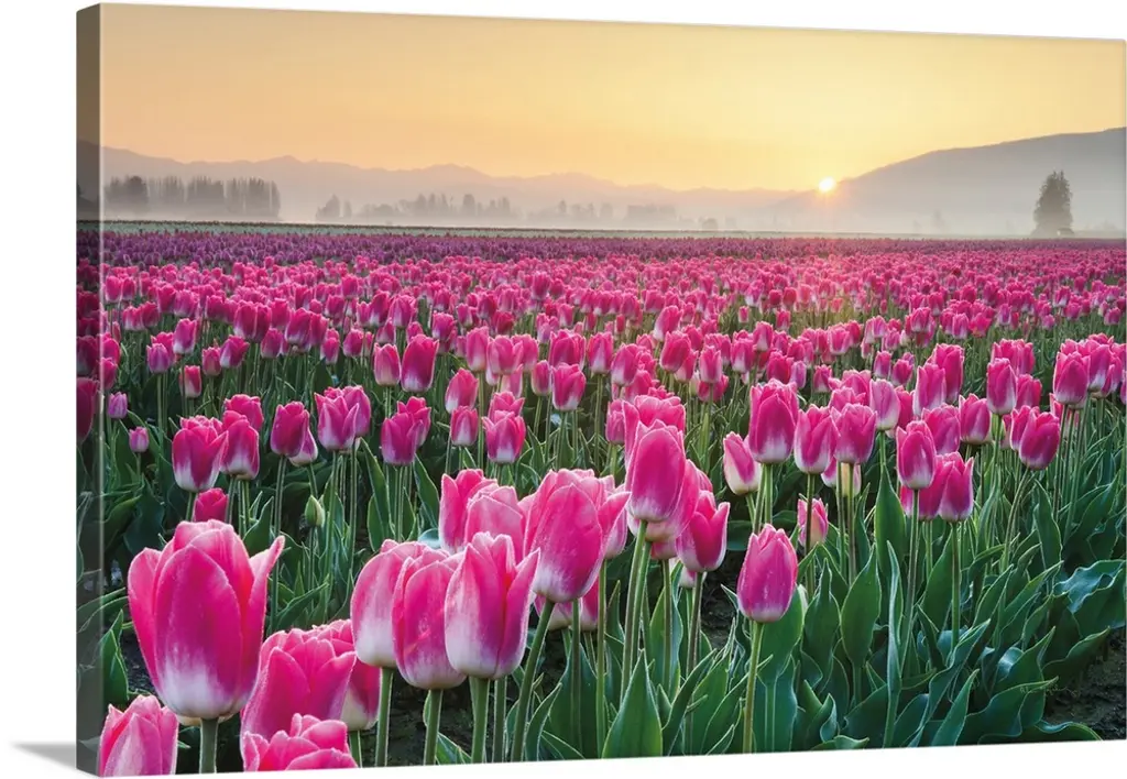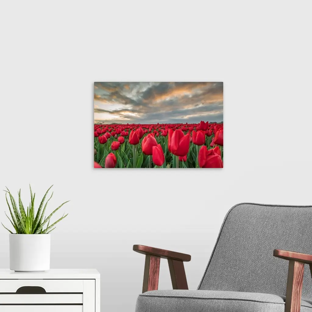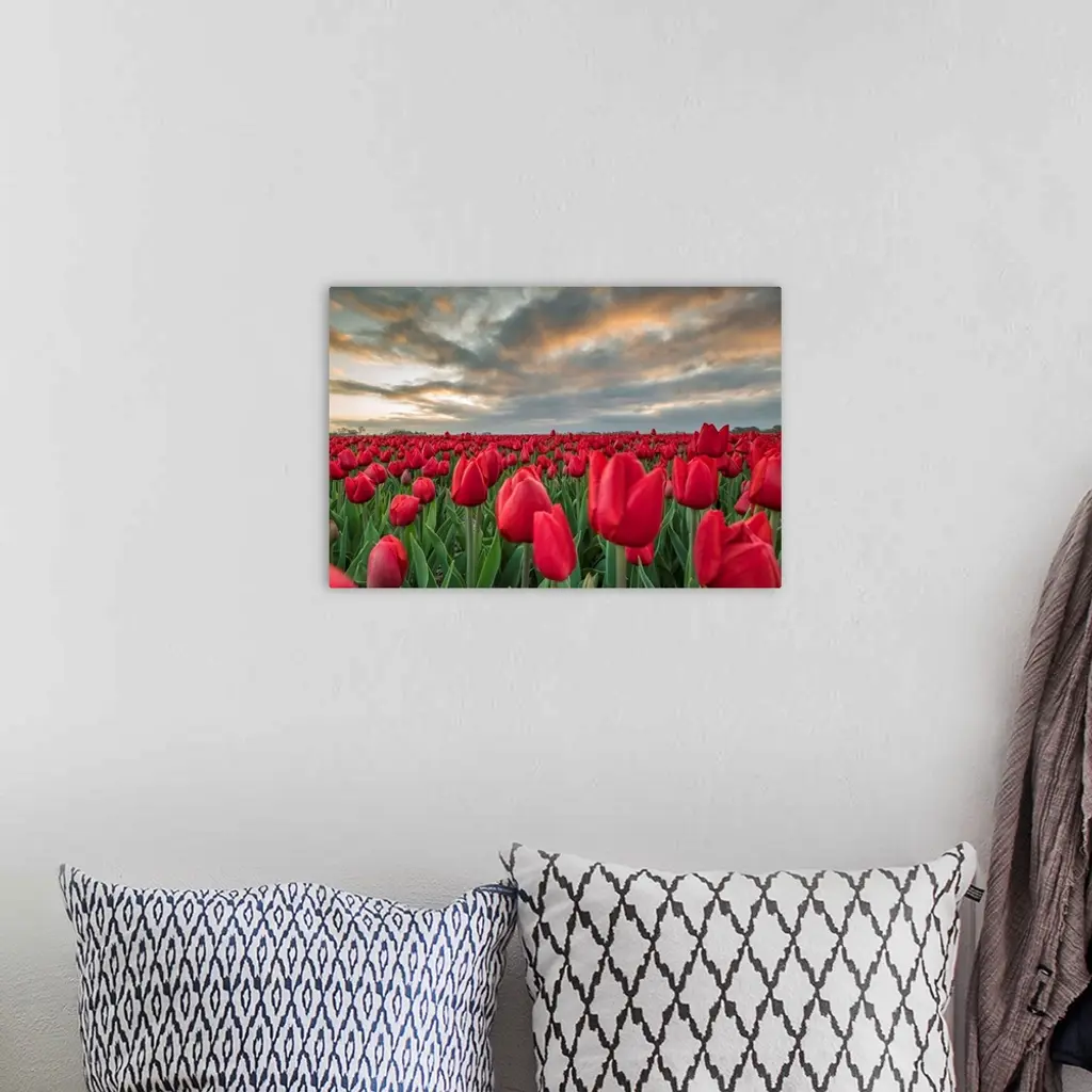 Sunrise Coloured Clouds Above Field Of Red Tulips, Koggenland, Netherlands
