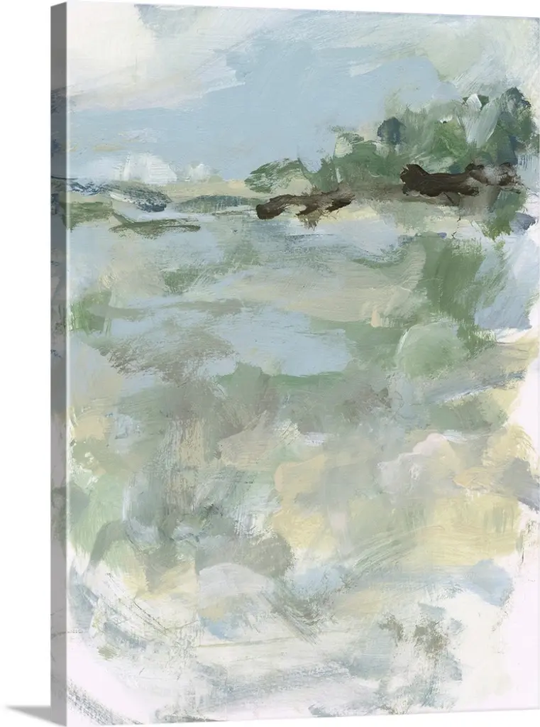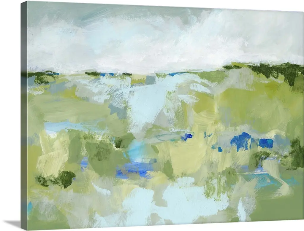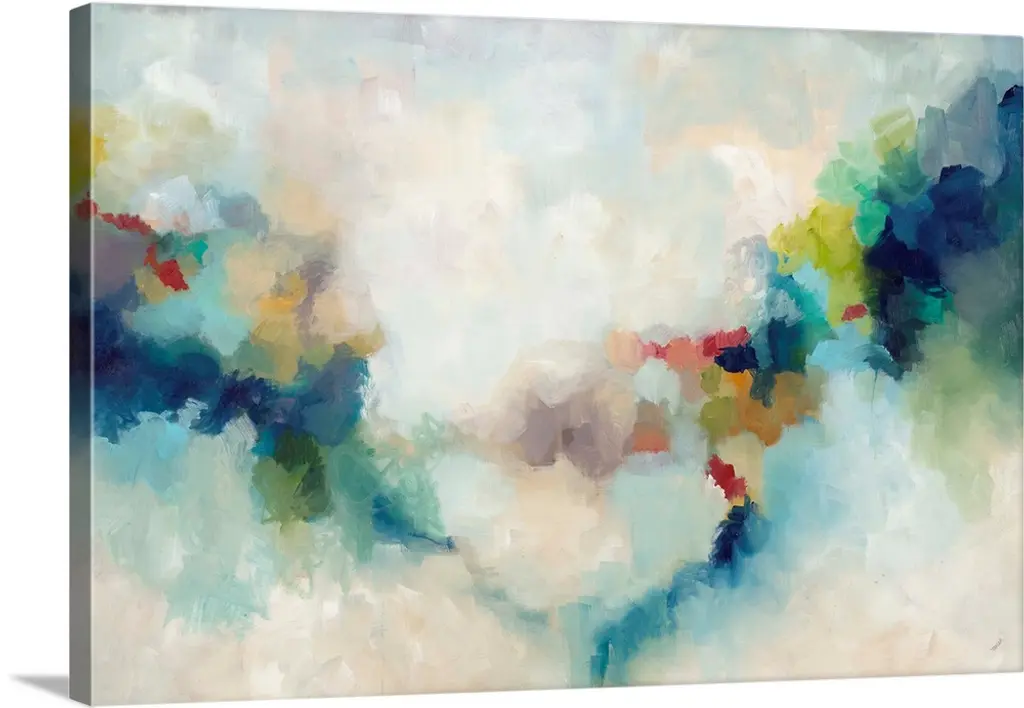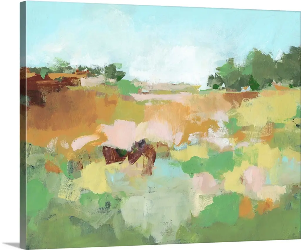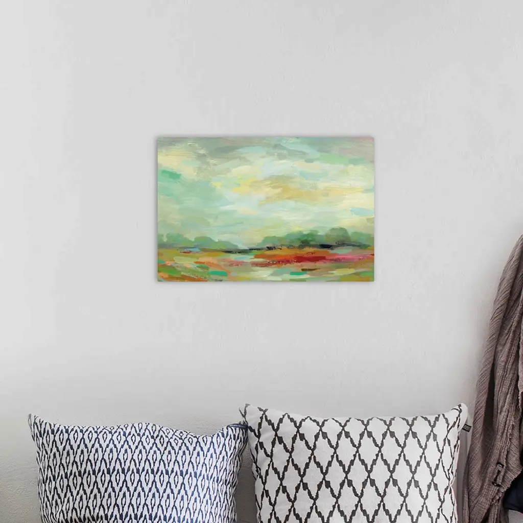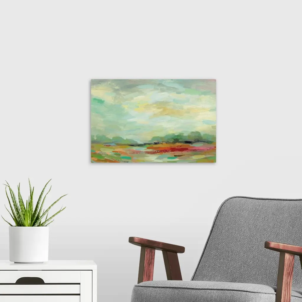 Colorful abstract landscape resembling a field at sunrise created with small horizontal brushstrokes.