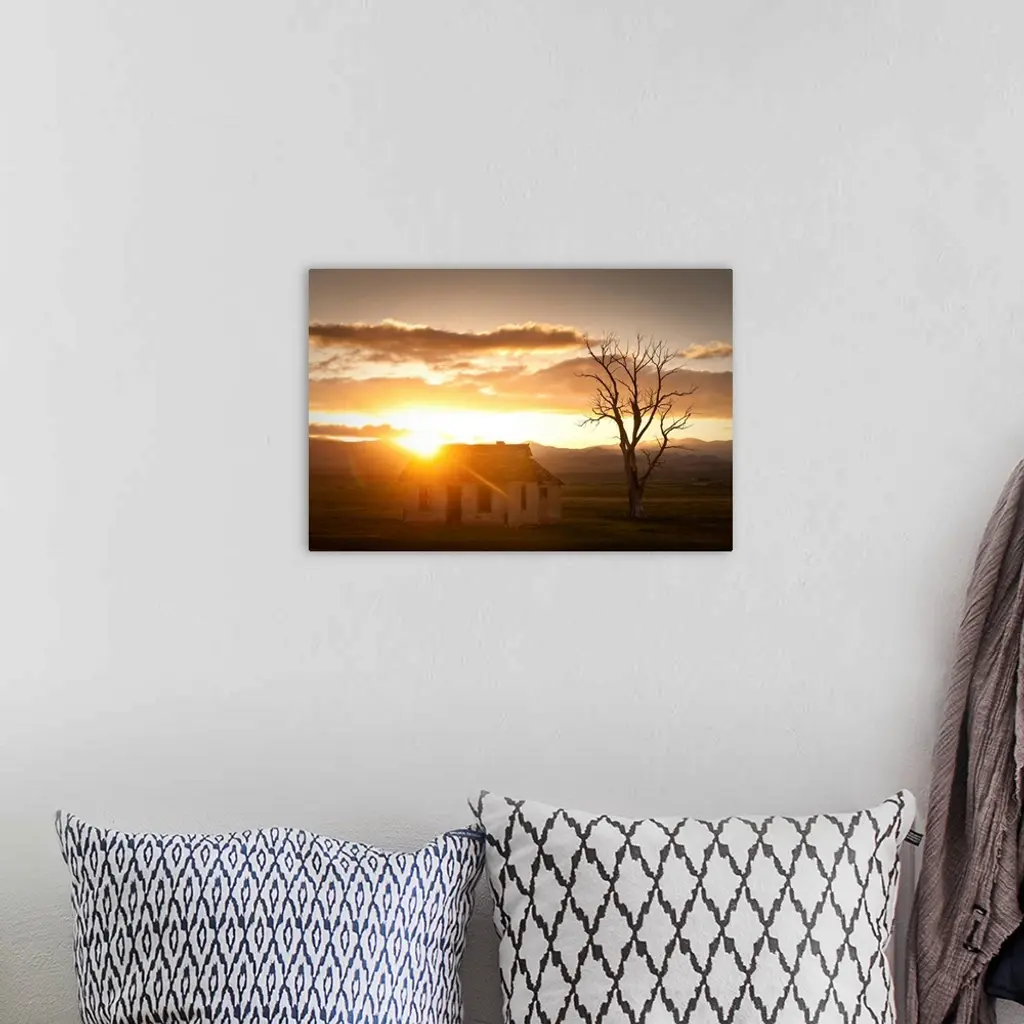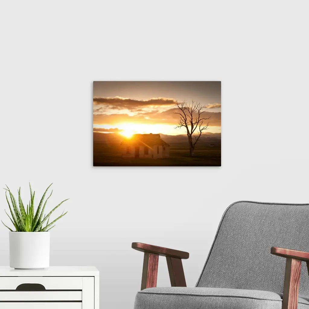 Landscape photograph of an old abandoned house in a field with mountains in the background and the sun shining right on the horizon.