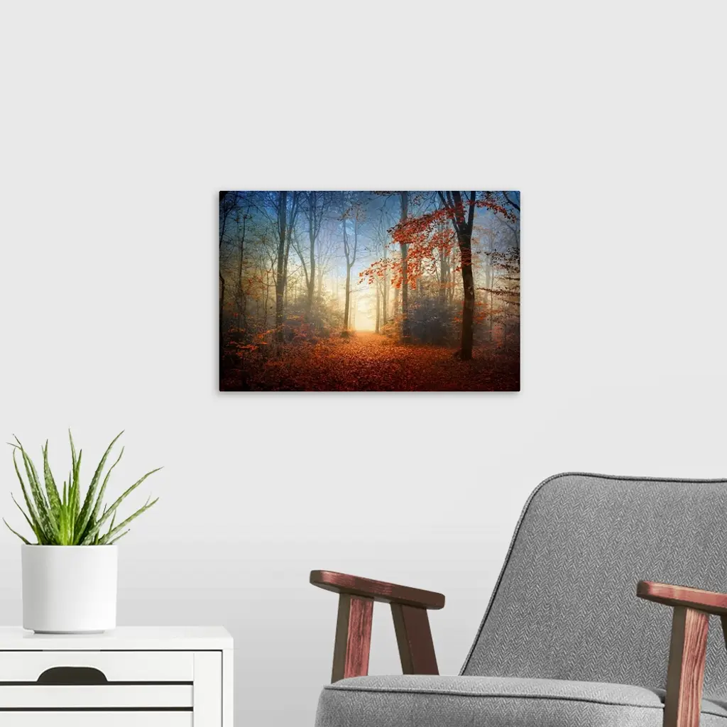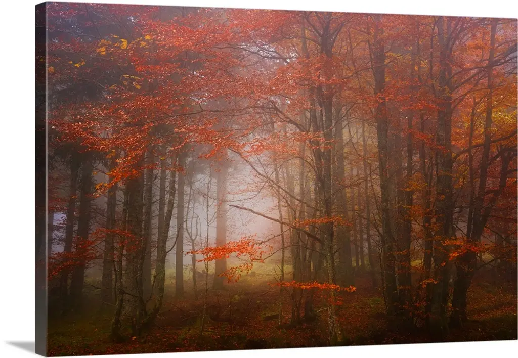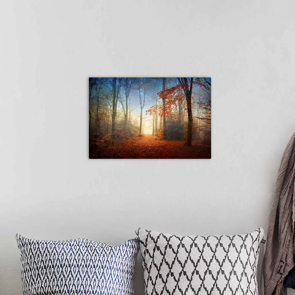 Landscape, fine art photograph of the Broceliande forest with autumn foliage, surrounded by thin fog at sunrise.