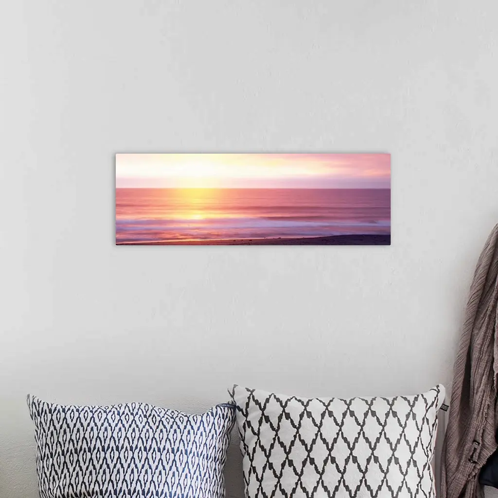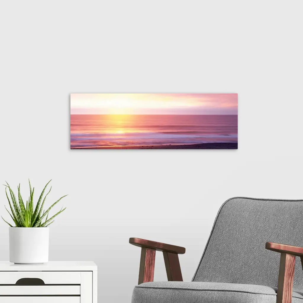 A panoramic photograph taken of the sunrise over a vast ocean off a coast in Hawaii.