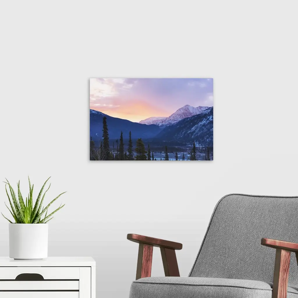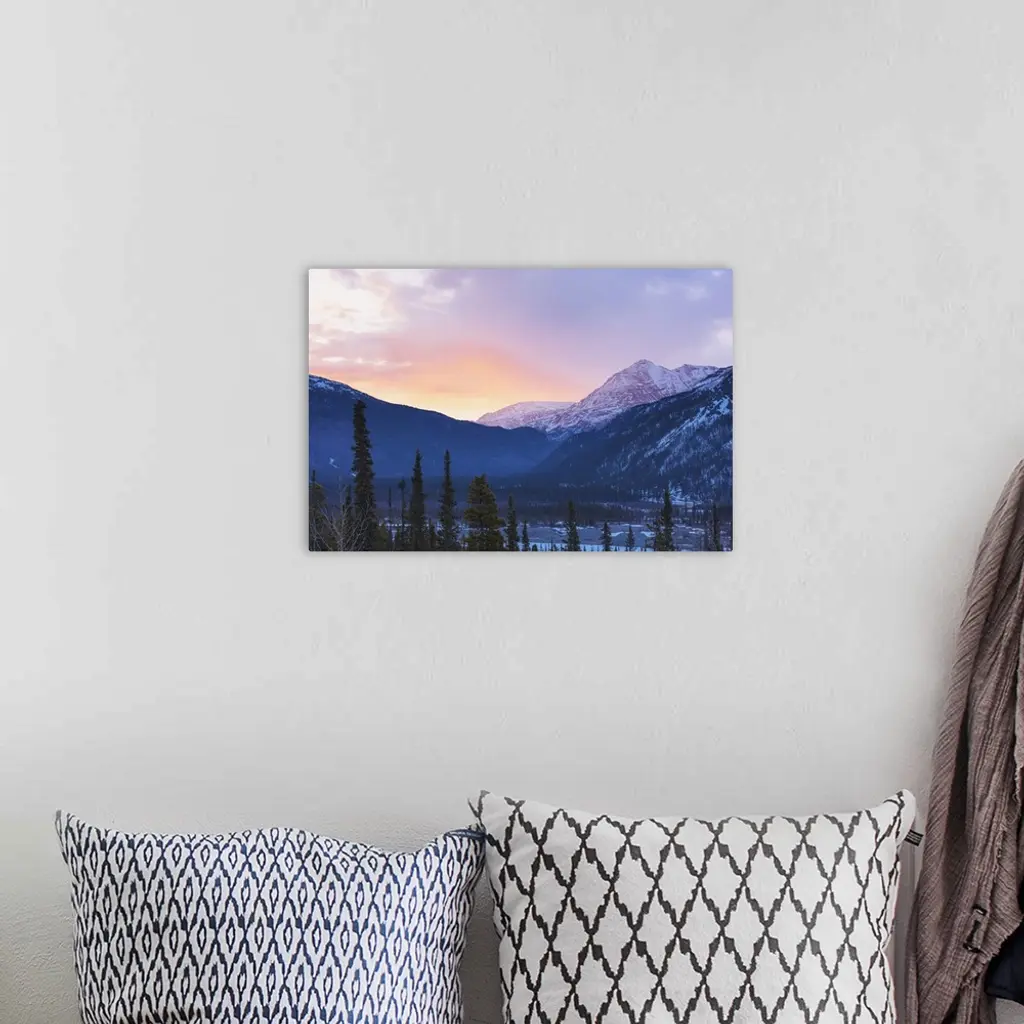 Sunrise Lights The Clouds Pink Above The Sentinel Range Along The Alcan Highway, Muncho Lake Provincial Park, Northern Canadian Rockies, Early Spring, Northern British Columbia, Canada.