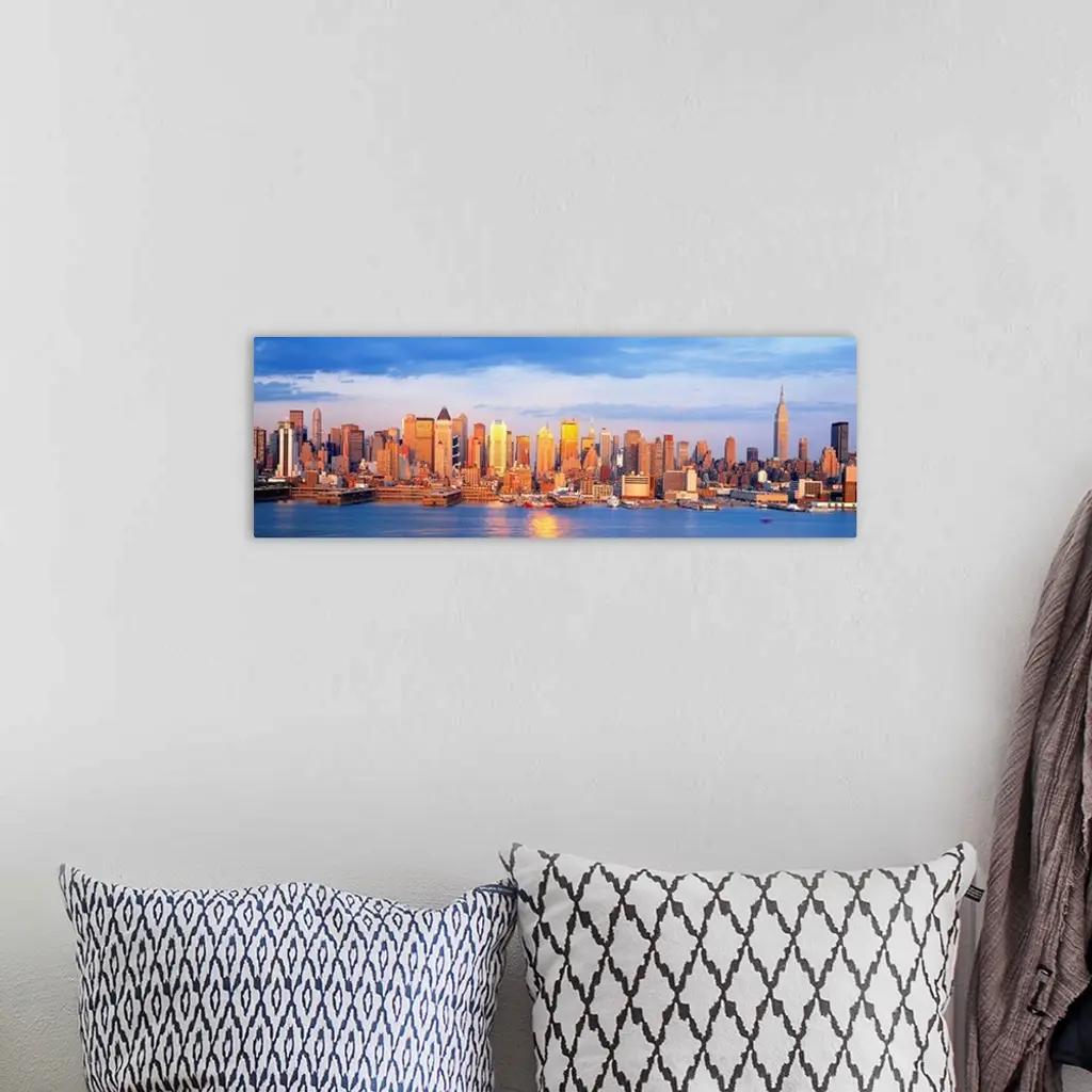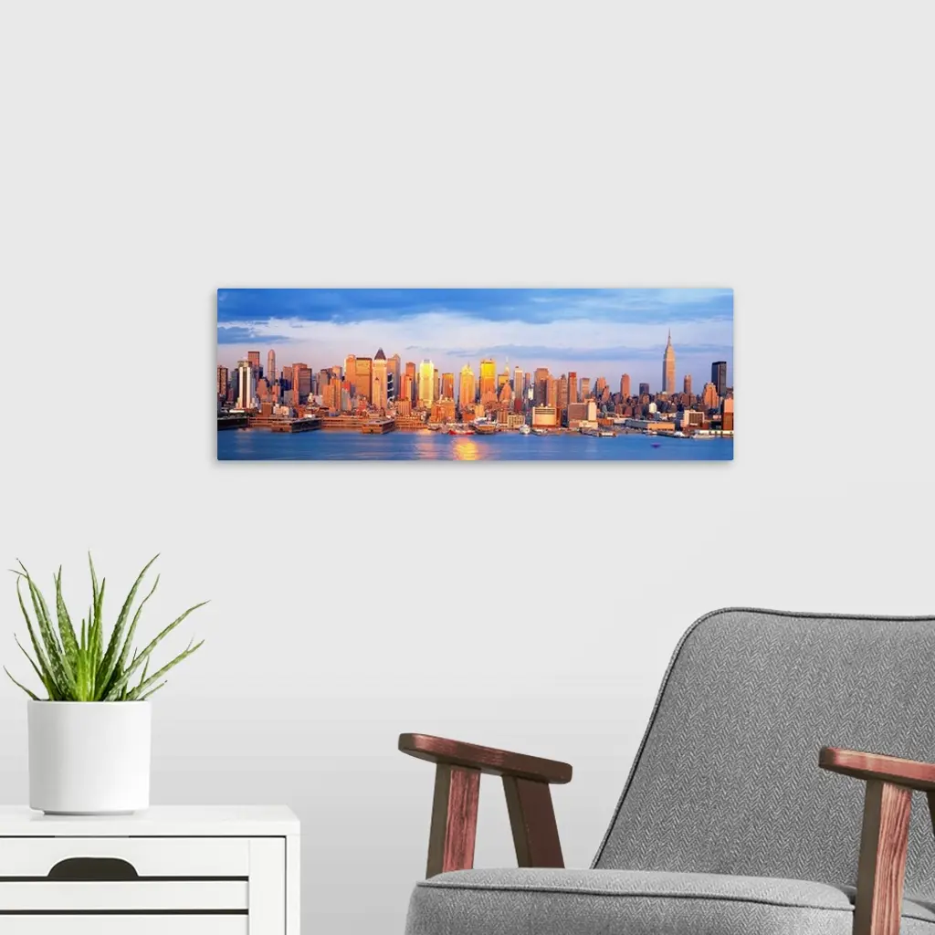 Panoramic photograph taken of the sun as it begins to shine over the New York skyline filled with skyscrapers. In the foreground is a reflection of the sun as it glimmers over the water.