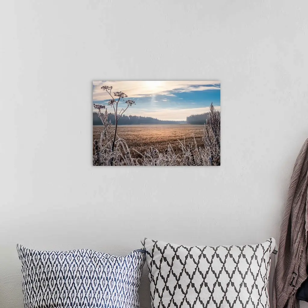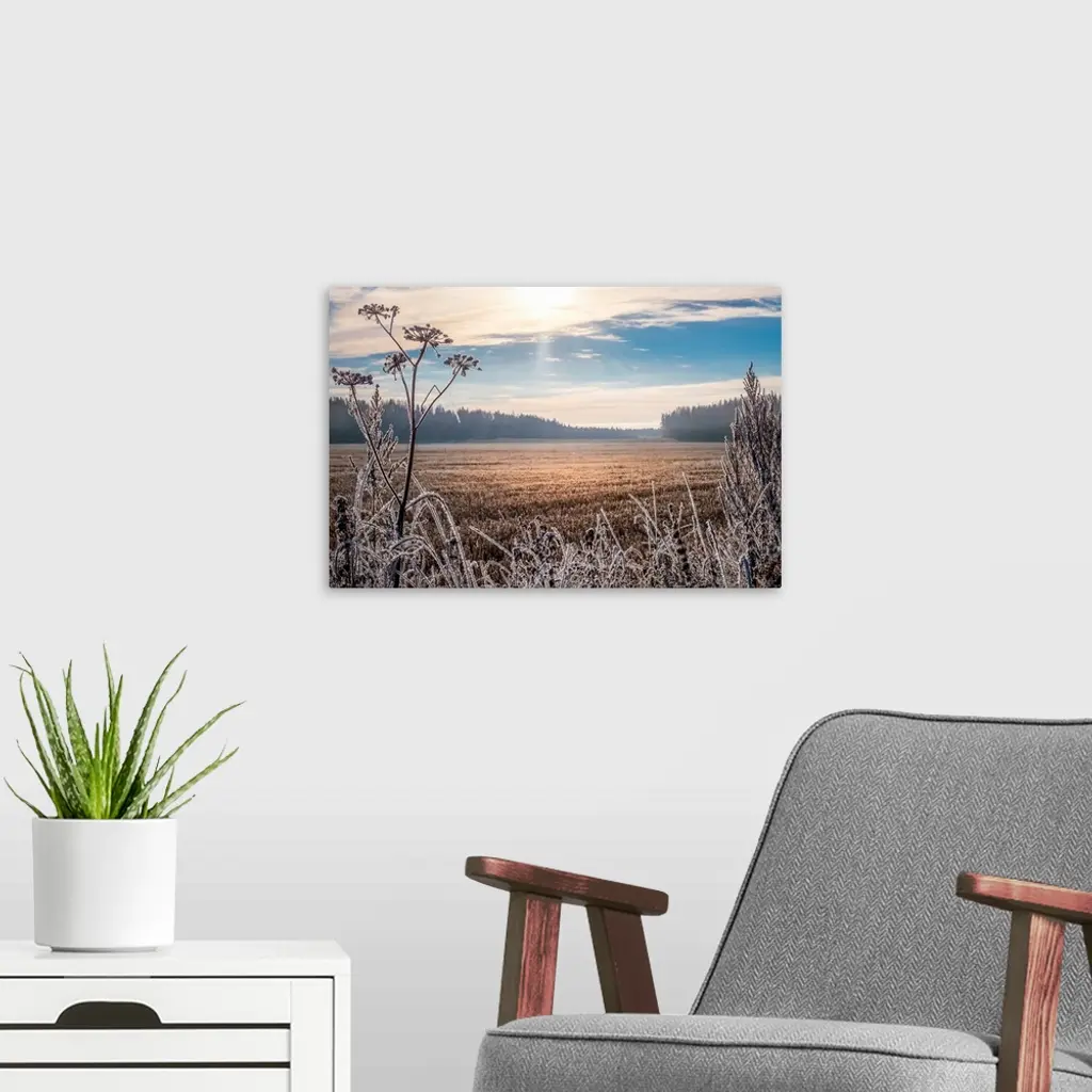 Scenic and bright landscape with sunrise on a frosty autumn morning.