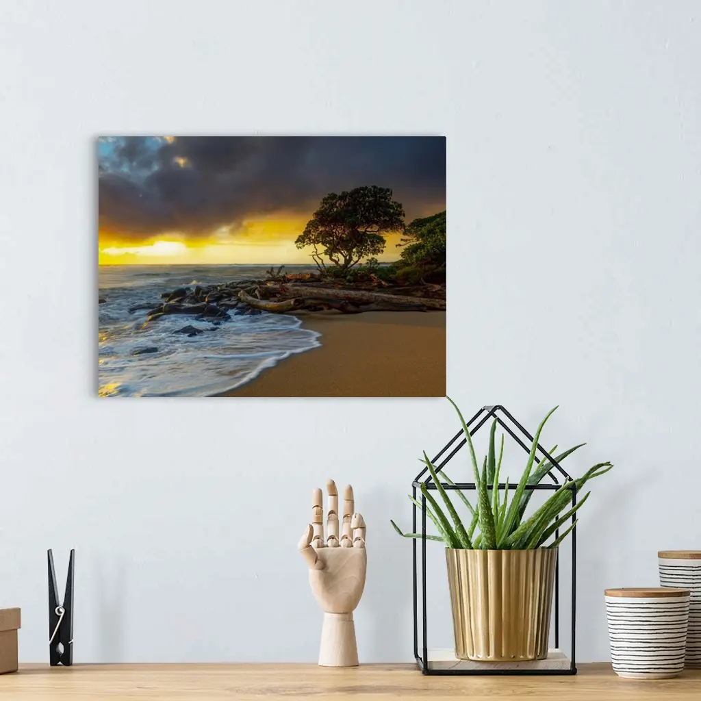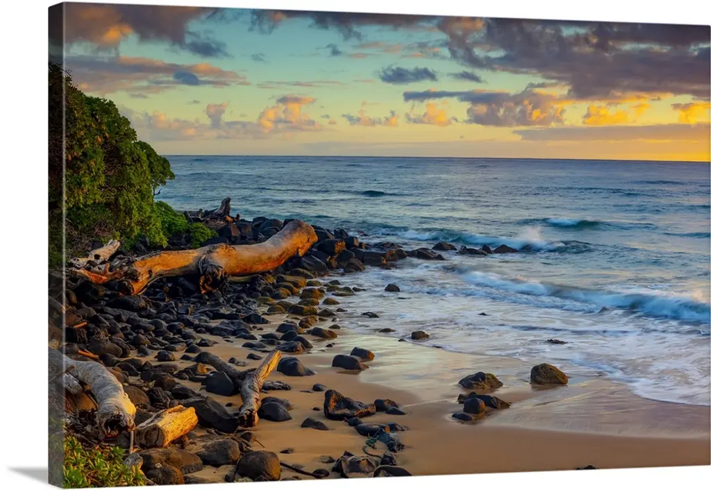 Sunrise over driftwood and rocks on a Hawaiian shore; Kauai, Hawaii, United States of America