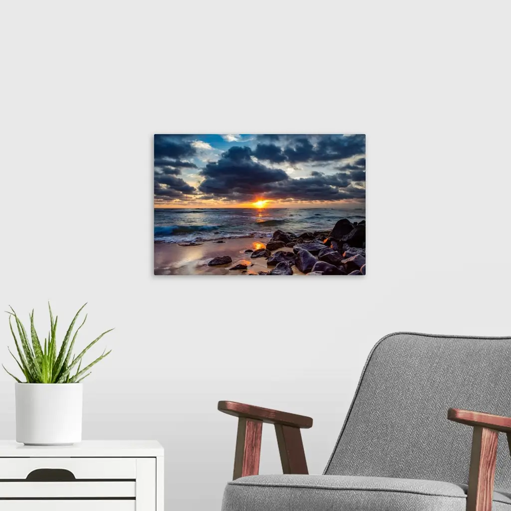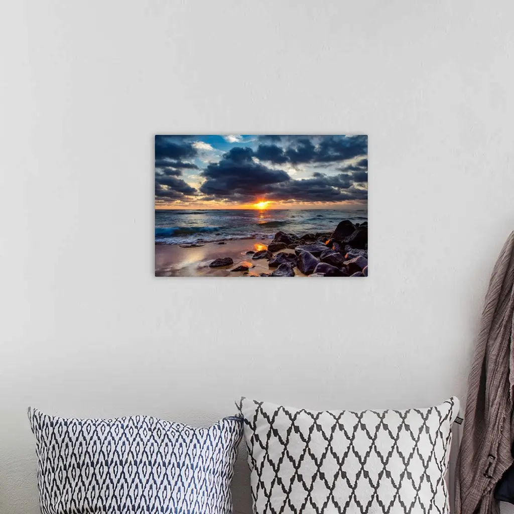 Sunrise Over The Pacific Ocean, Dark Clouds Overhead, Kapaa, Kauai, Hawaii