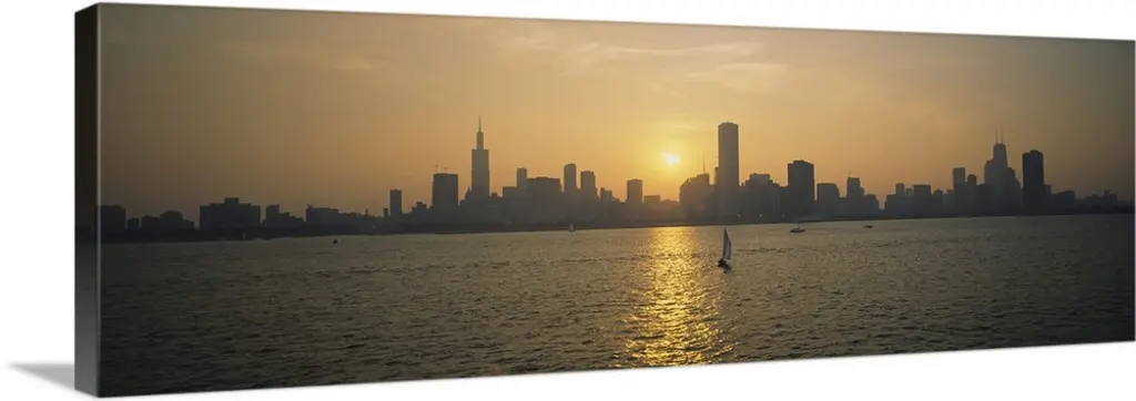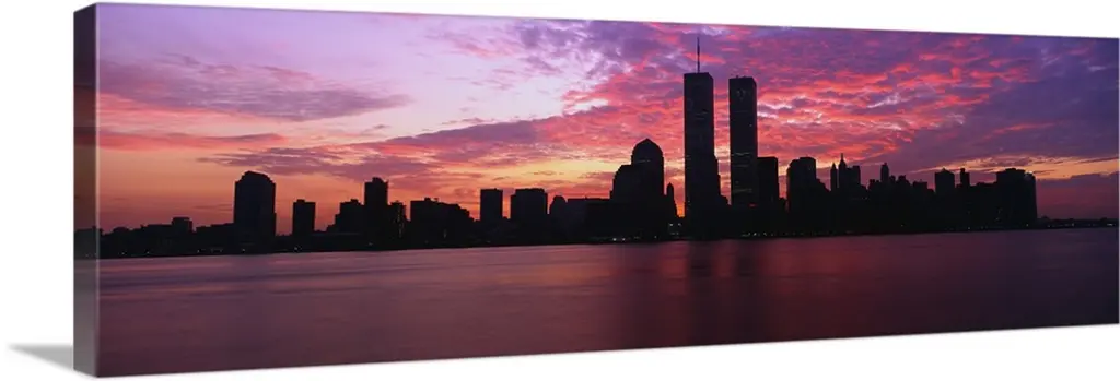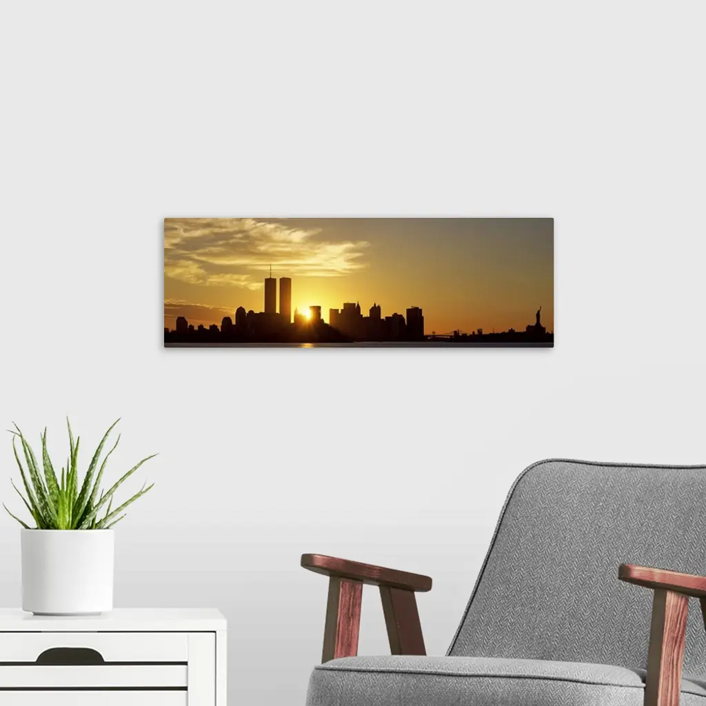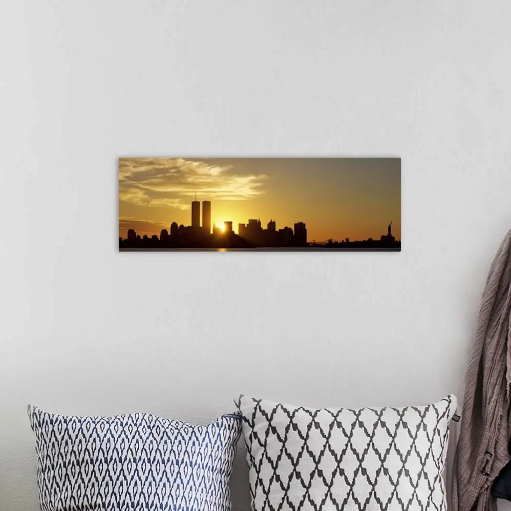 Panoramic photo of the sun rising right between two buildings in the silhouetted New York skyline, near the World Trade Center towers.