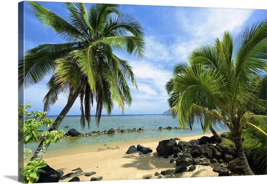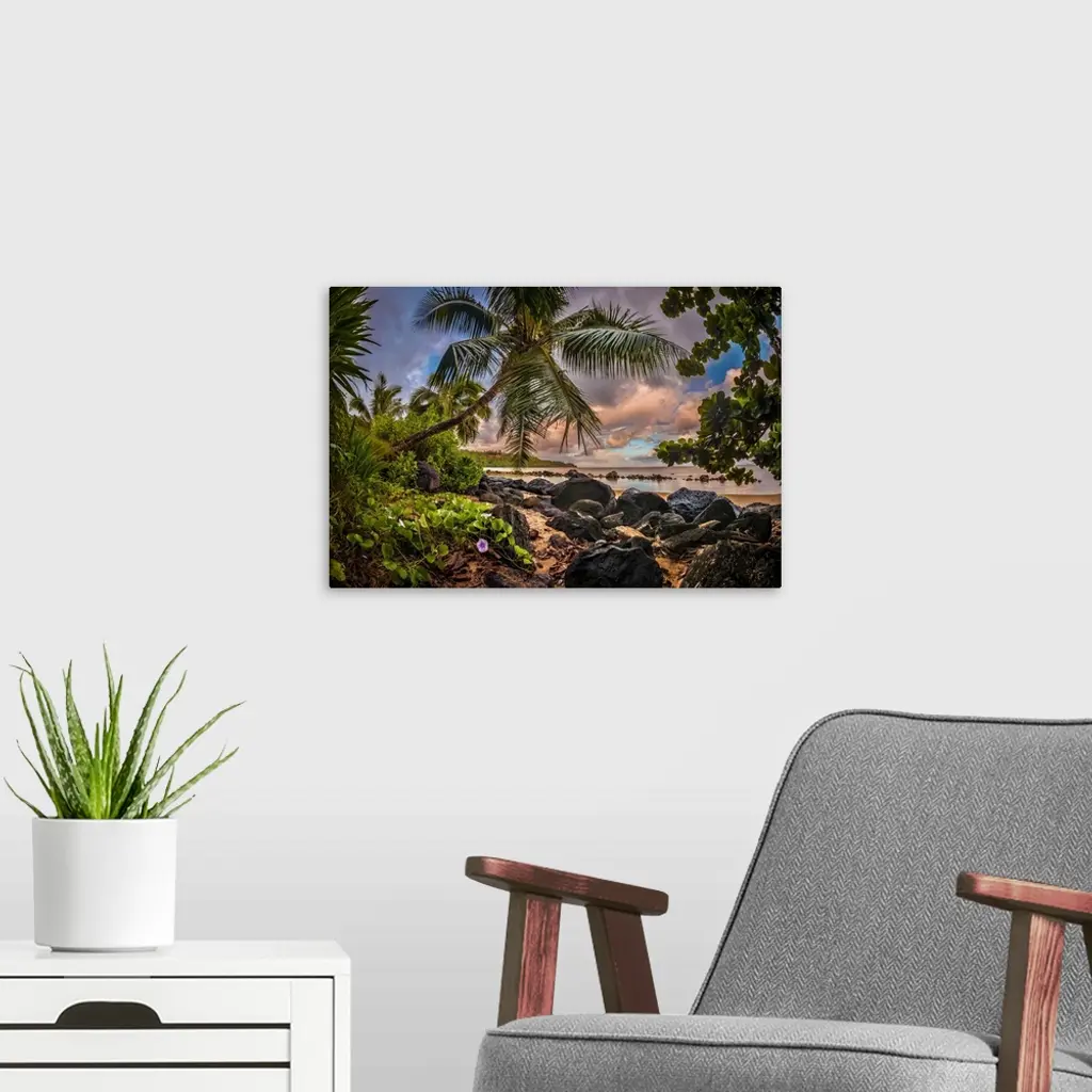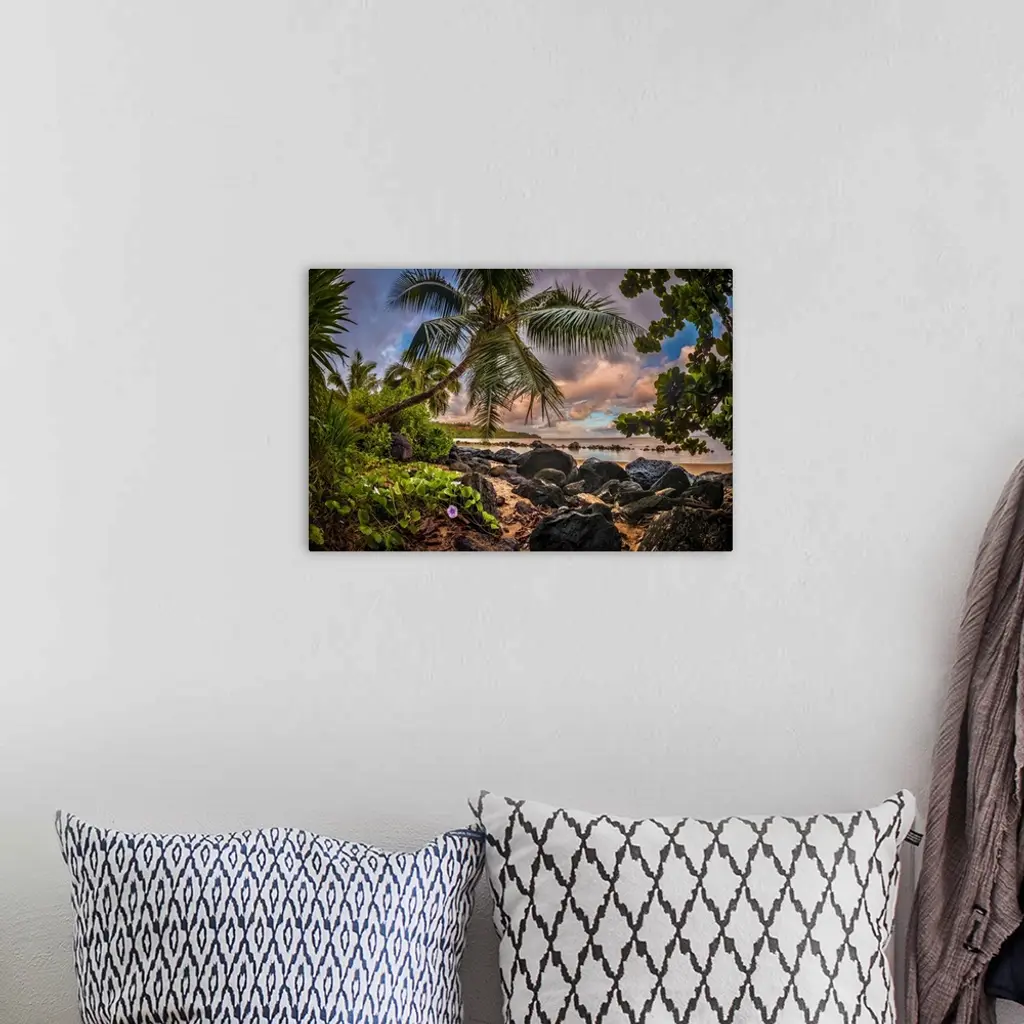 Sunrise under a coconut palm on a calm ocean bay, Kiluea, Hawaii, United States of America, Pacific