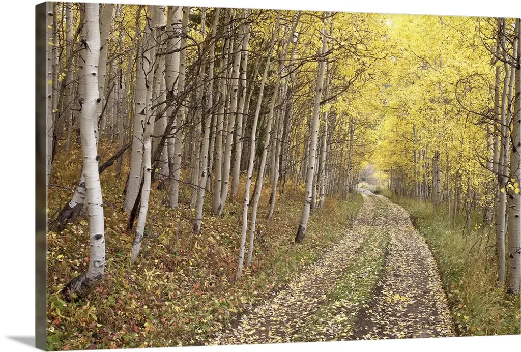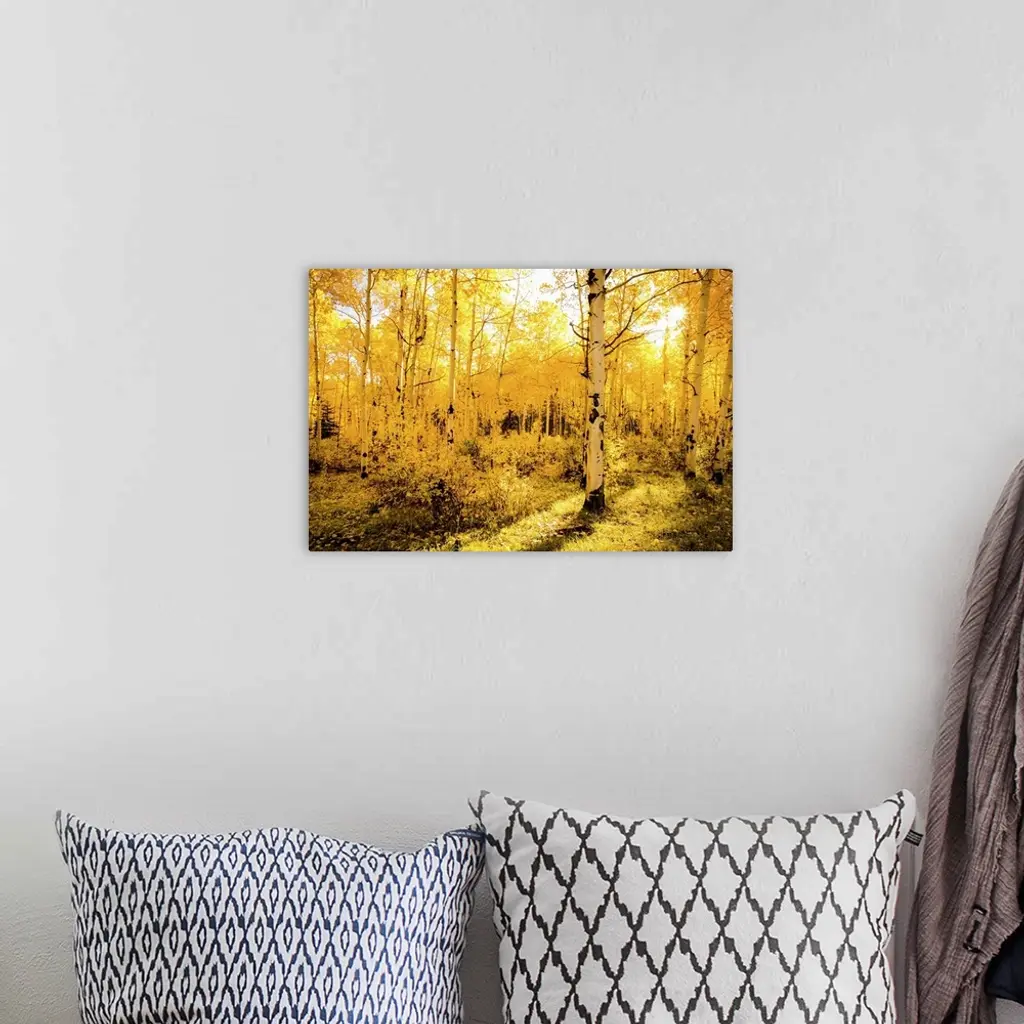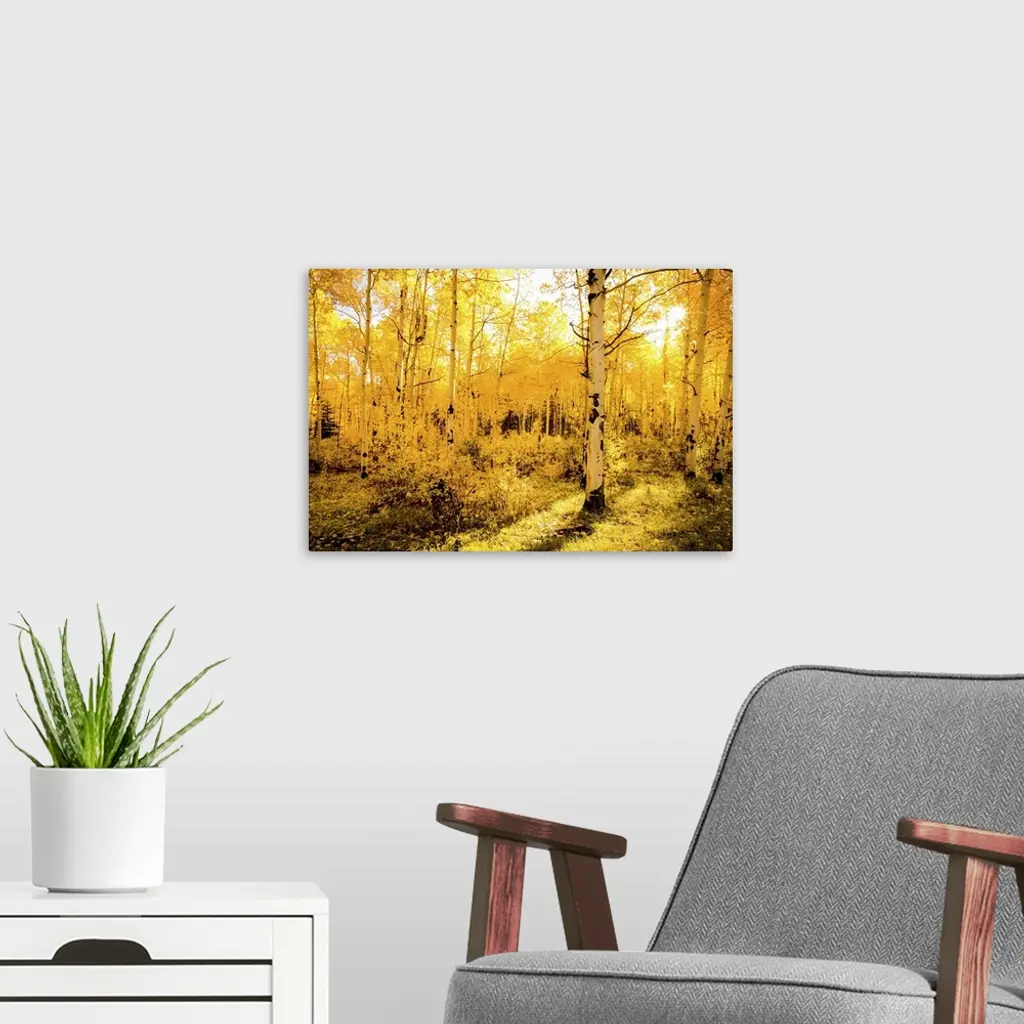 Horizontal canvas of a forest of aspen trees being bathed in the warm sun.