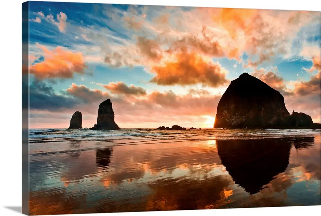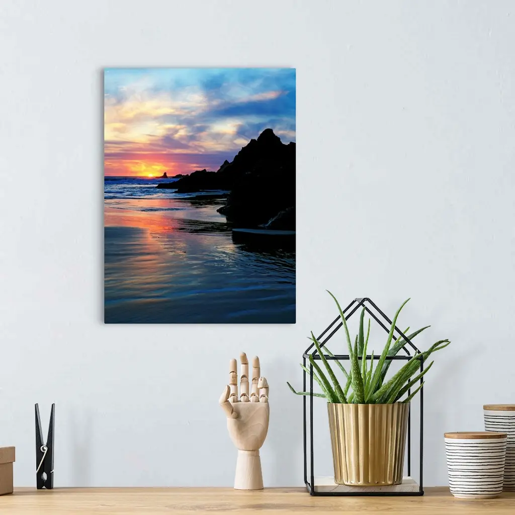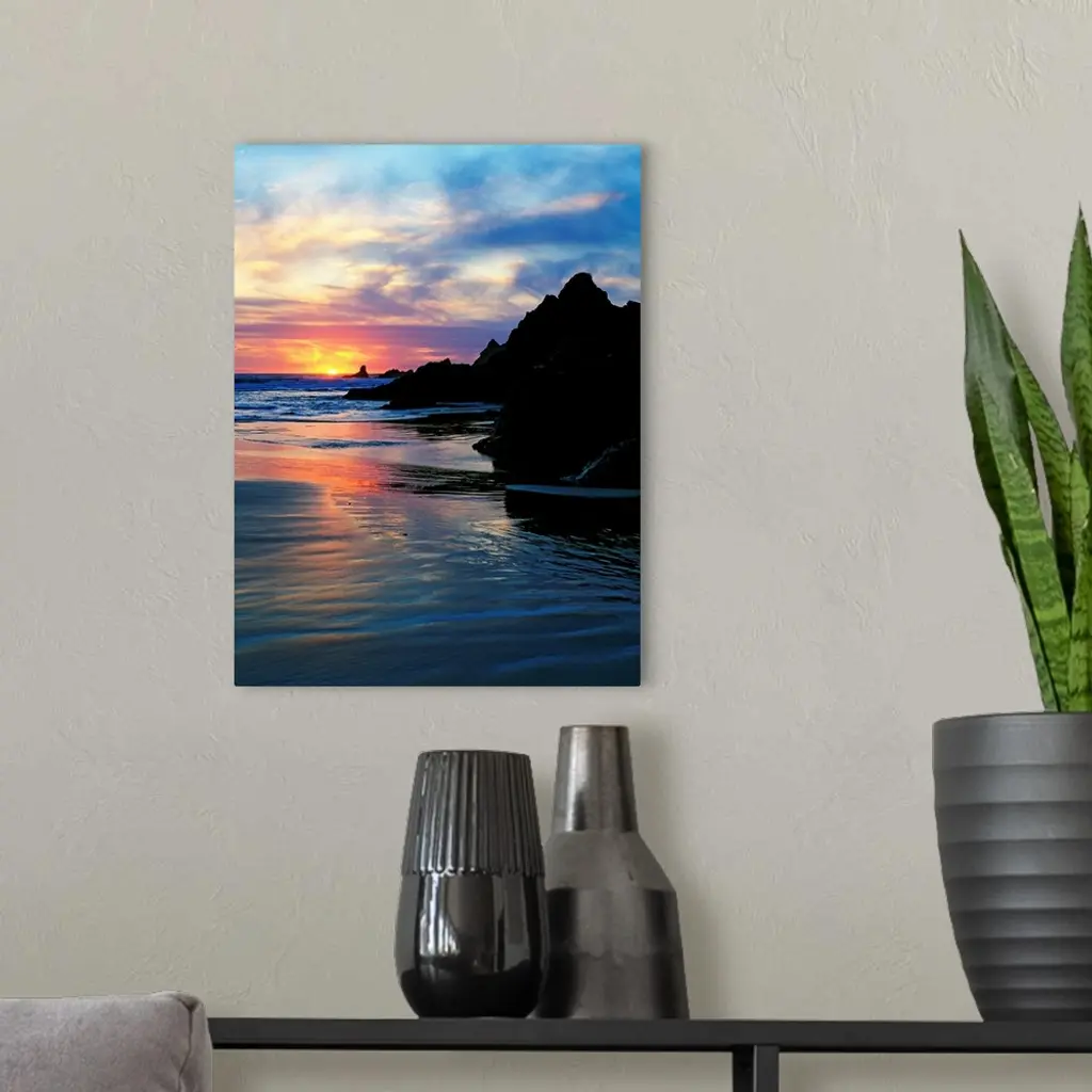 Sun below the horizon in a seascape with a rocky beach and waves.