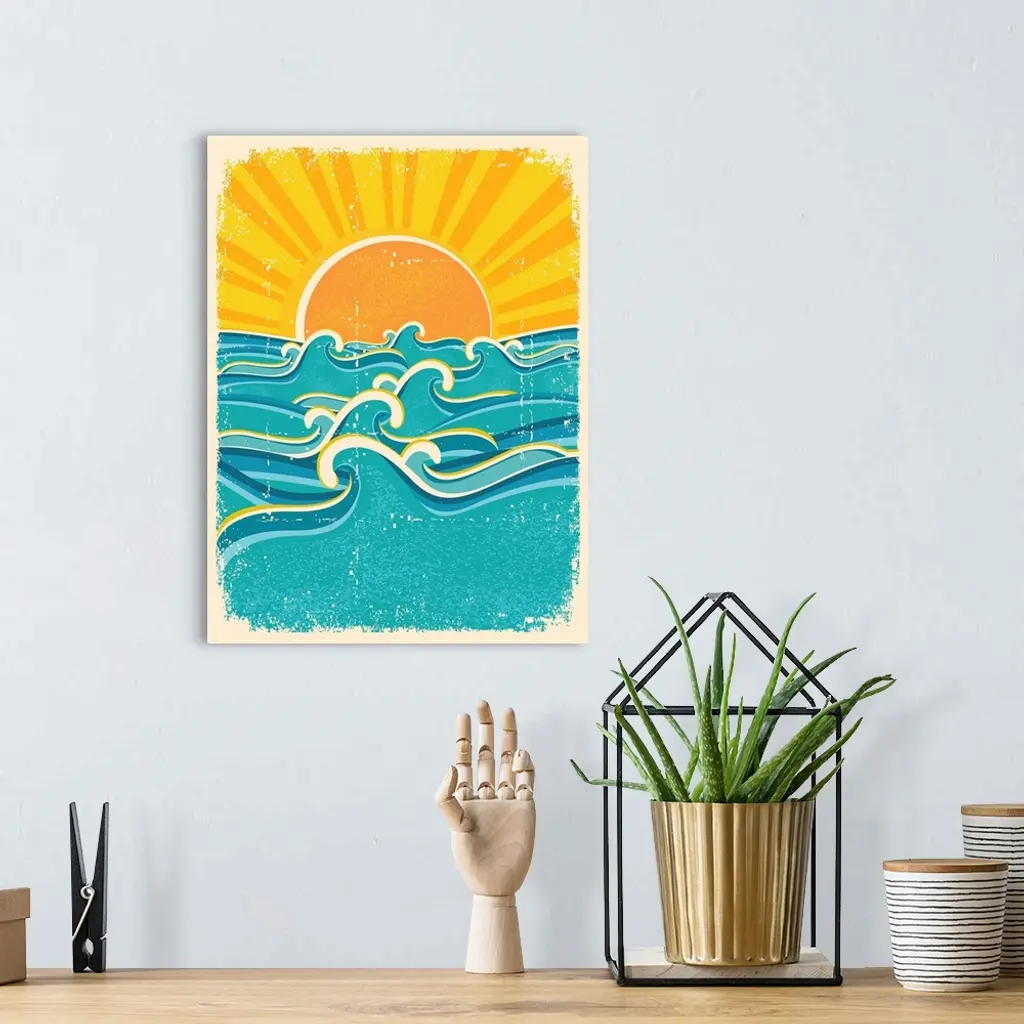 Sea Waves And Yellow Sun On Old Paper Texture.vintage Illustration