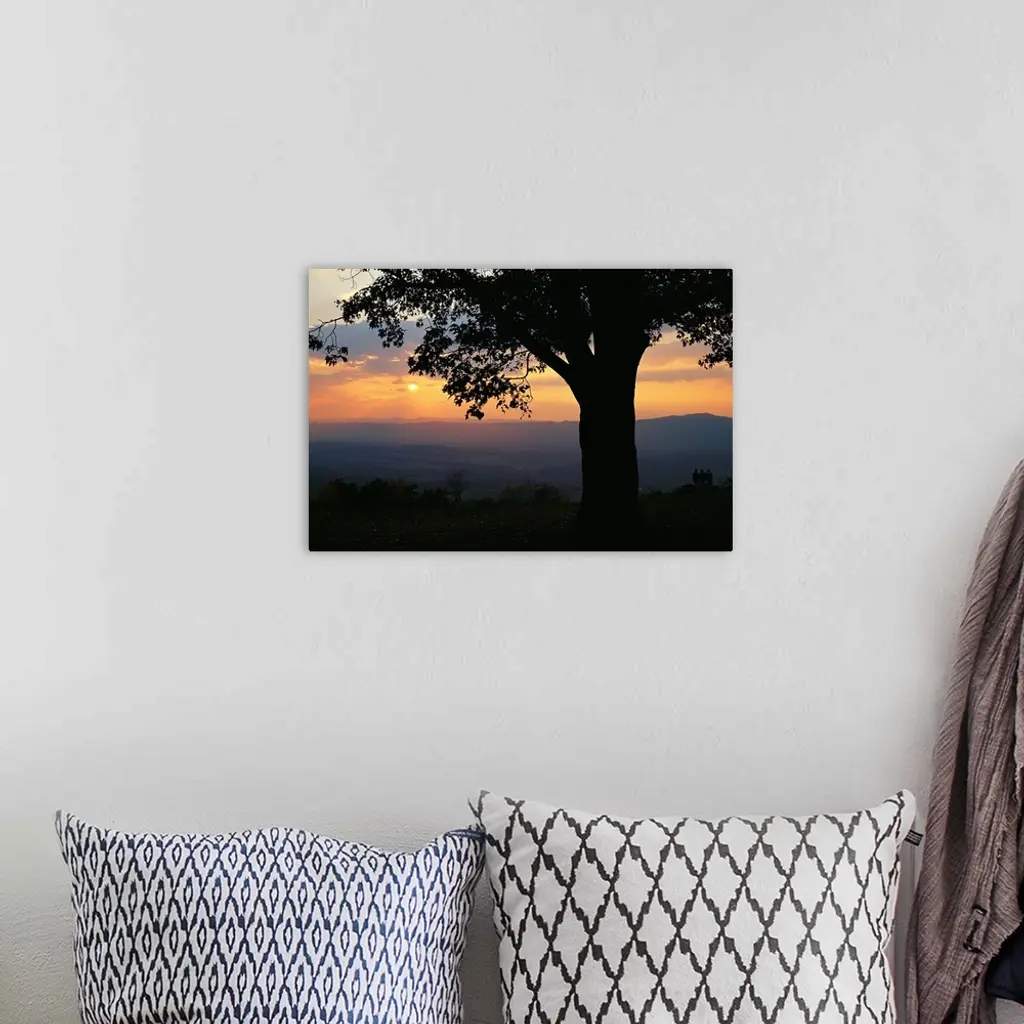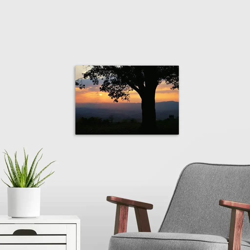 Sunset and silhouetted oak tree over the Shenandoah valley.