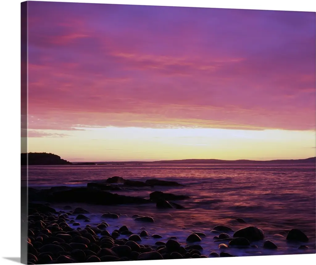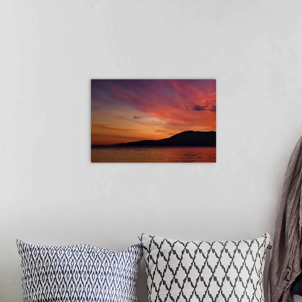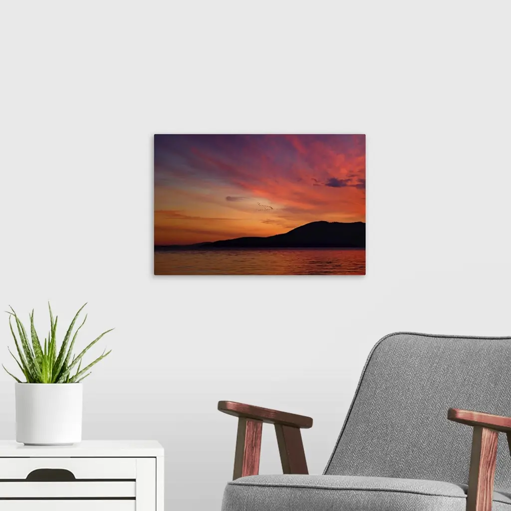 A flock of birds in the sky during a dramatic sunset, at Larrabee State Park, Washington.