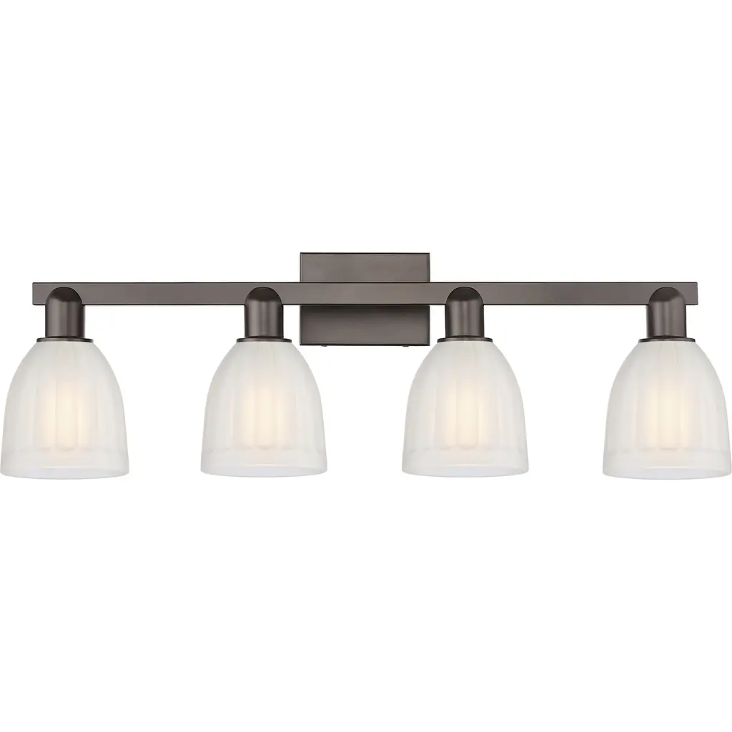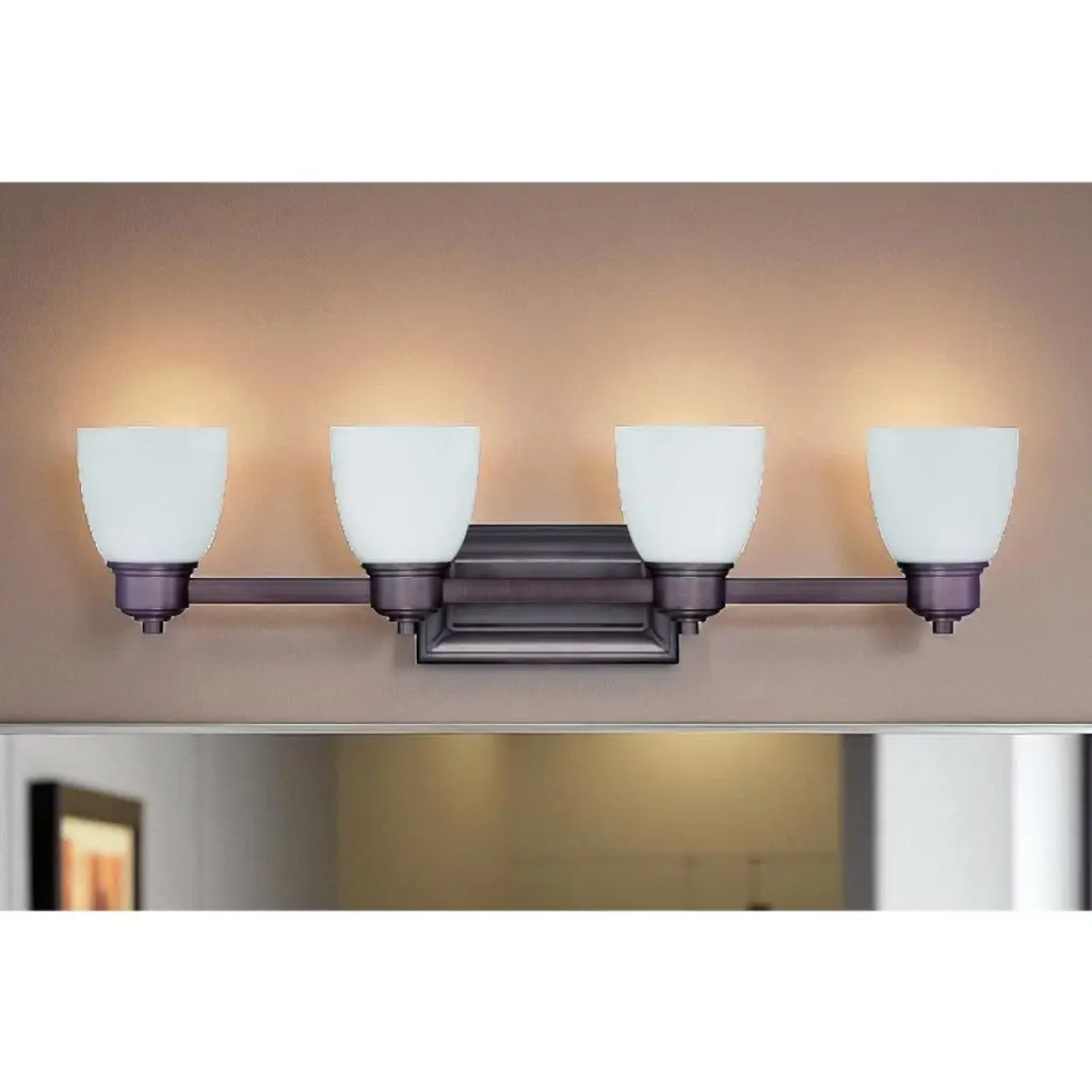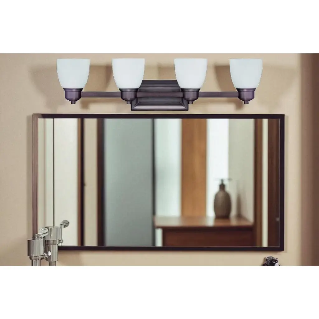 Sunset Lighting 4-Light 100W Medium Base Bixby Vanity A versatile four-light wall fixture designed for over-sink and over-mirror lighting. Transitional styling with squared glass blends easily across interiors, and frosted shades soften glare. Mount with the lights facing up or down and pair with a dimmer for custom ambiance. Key Features • Versatile 4-light bathroom vanity • Up or down mounting to suit your space • Dimmable with compatible switch (sold separately) • Frosted glass shades for soft, even diffusion • Durable metal construction; transitional design • Designed for indoor use Specifications • Model: F3174-63 (Bixby) • Type: 4-Light Vanity • Color/Finish: Oil Bronze • Material: Metal • Bulb Base: Medium (E26), up to 100W each • Dimensions: 26-1/2" L × 3-1/2" D × 7-1/2" H • Extension: 5"