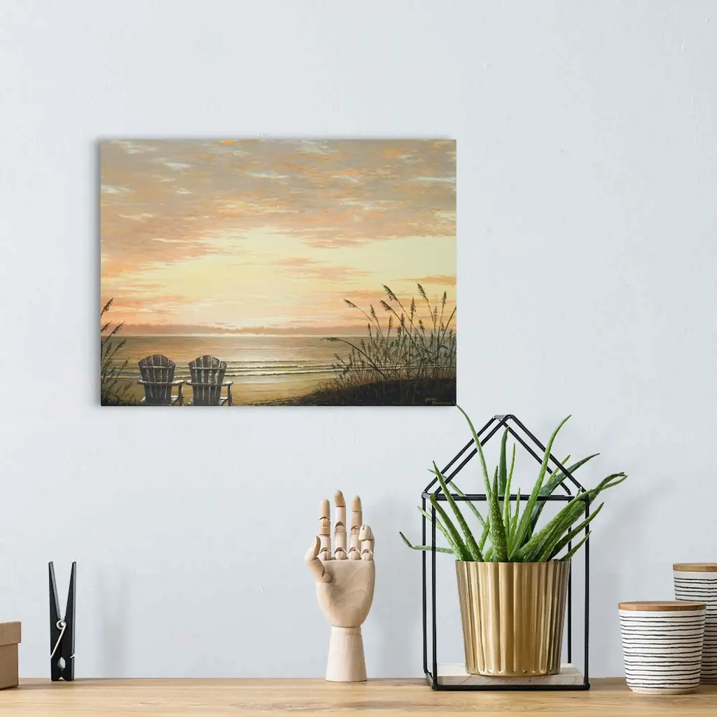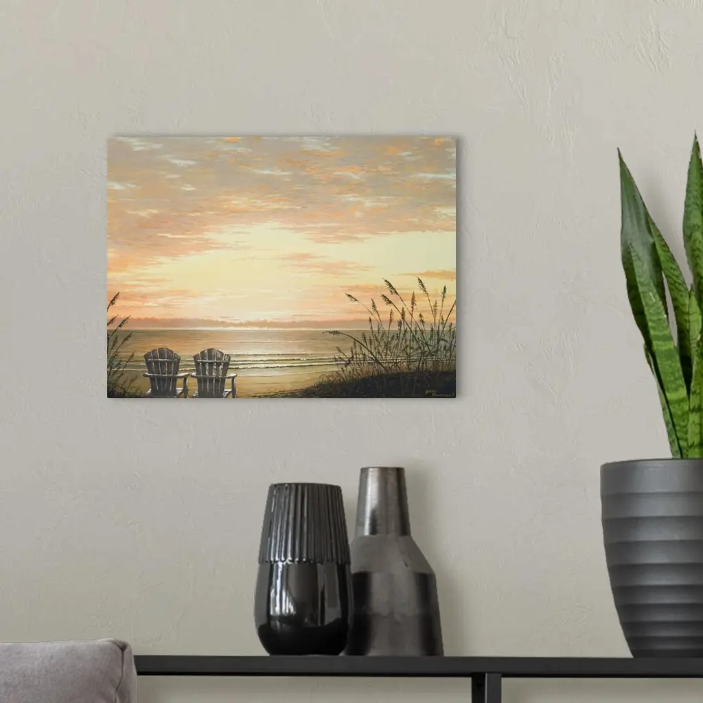 Contemporary painting of two adirondack chairs in the sand overlooking the beach at sunset.