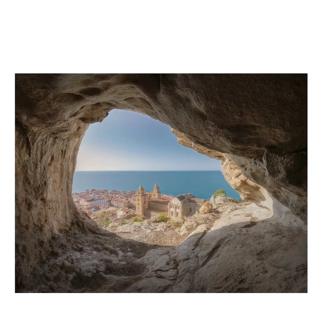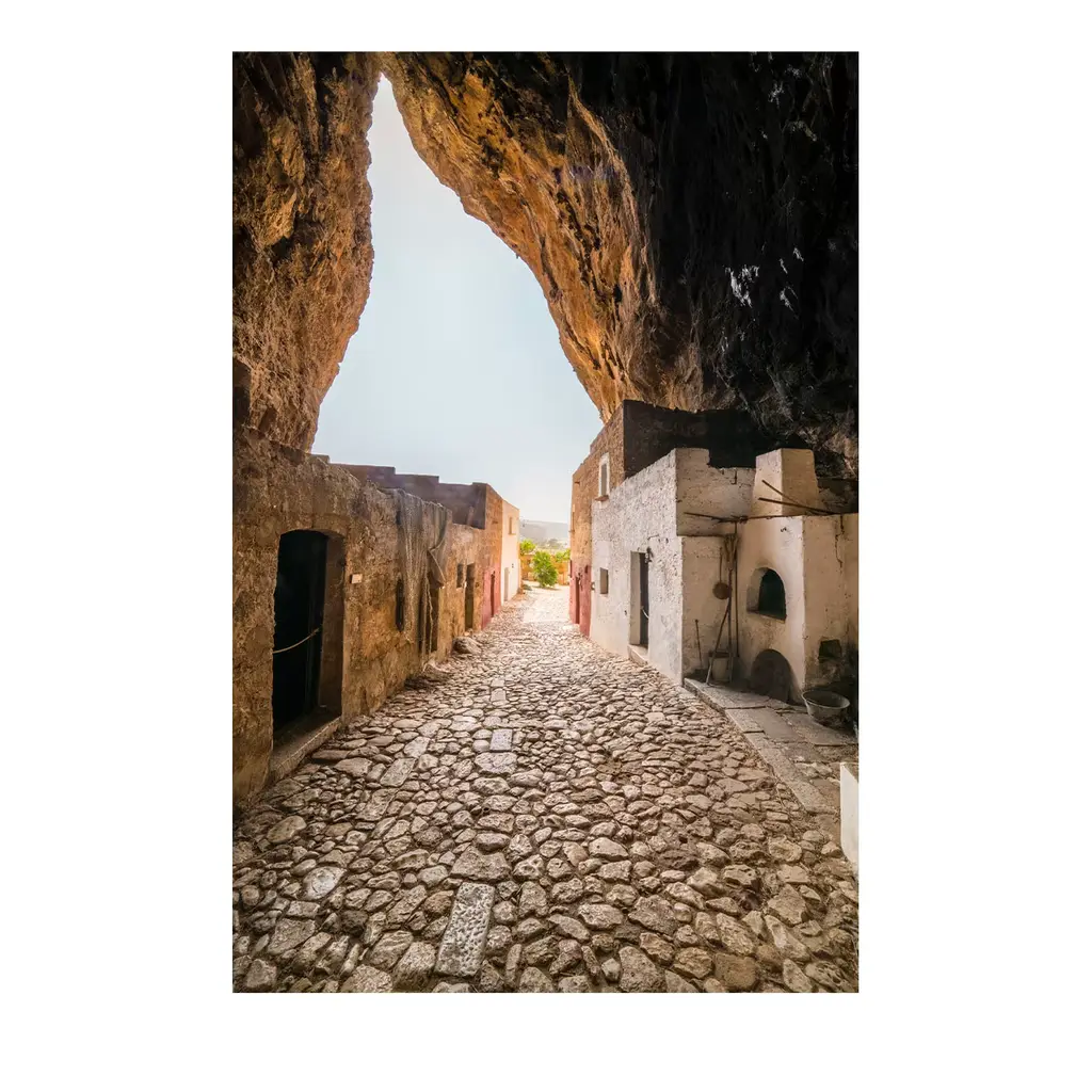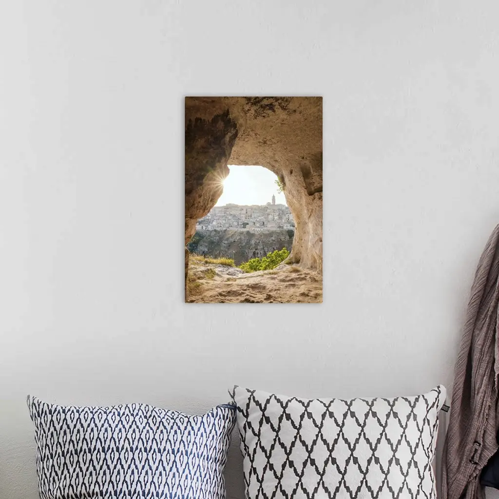 Sunset from a grotto cave in La Murgia Belvedere, Matera, Basilicata, Italy. Unesco site and European Capital of Culture 2019