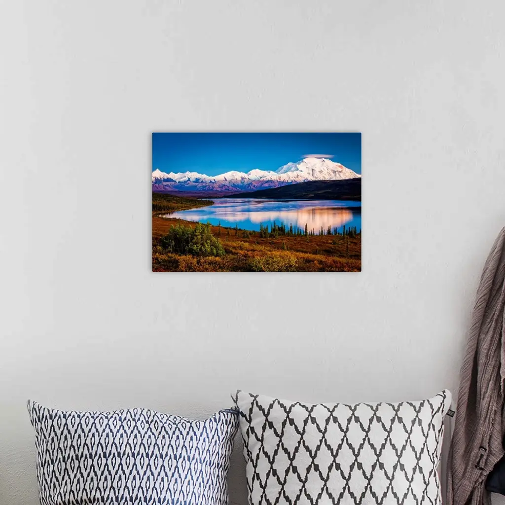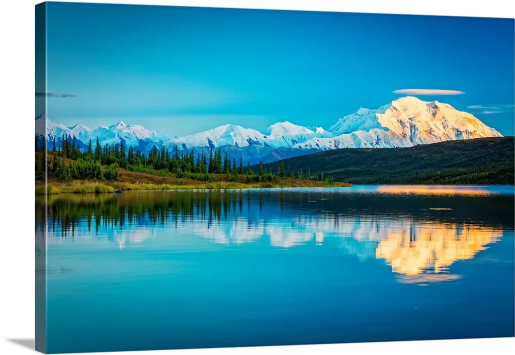Sunset glow on Mount Denali (McKinley) reflects on Wonder Lake with pastel sky, Denali National Park and Preserve in autumn, Interior Alaska, Alaska, United States of America